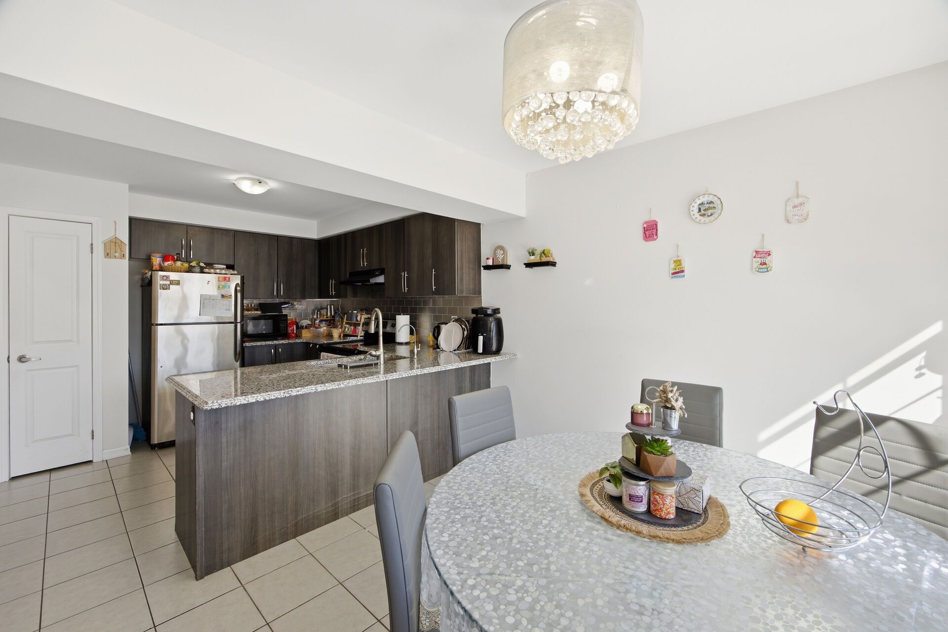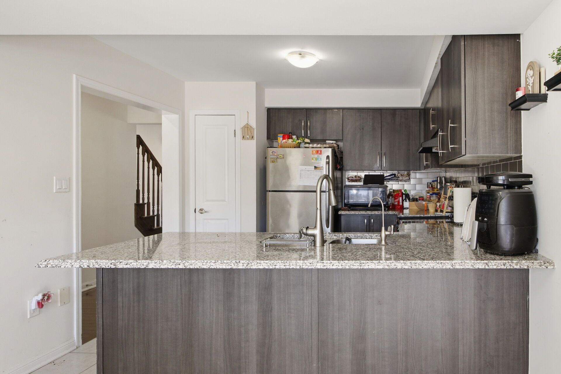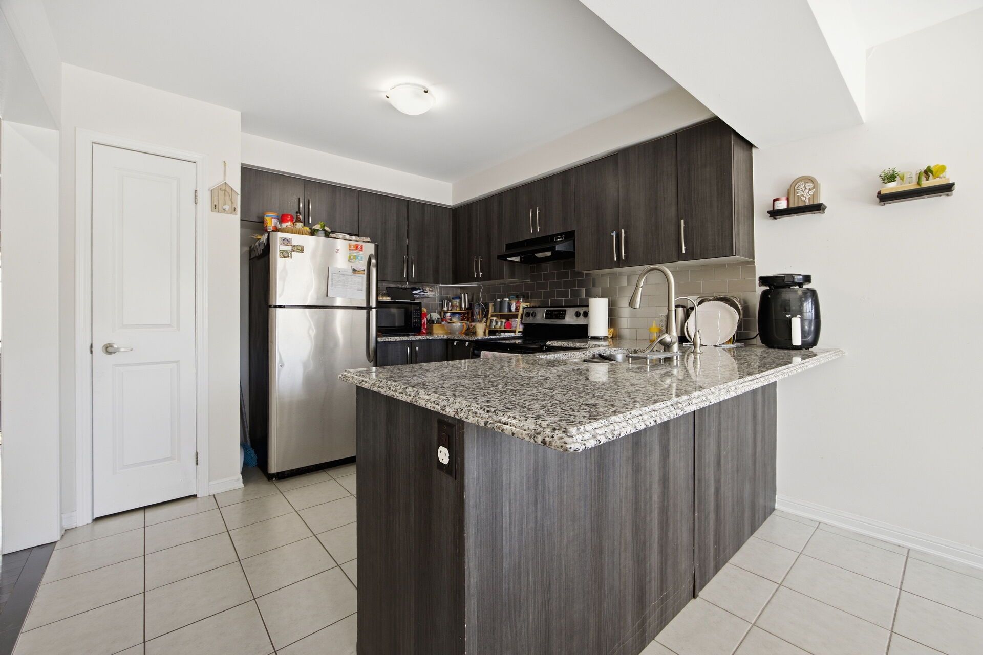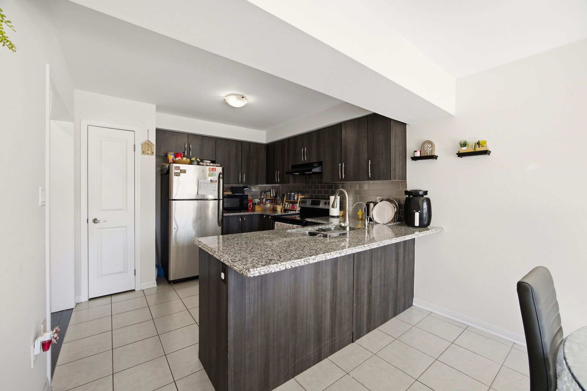 • Modern kitchen with granite countertops and stainless steel appliances.