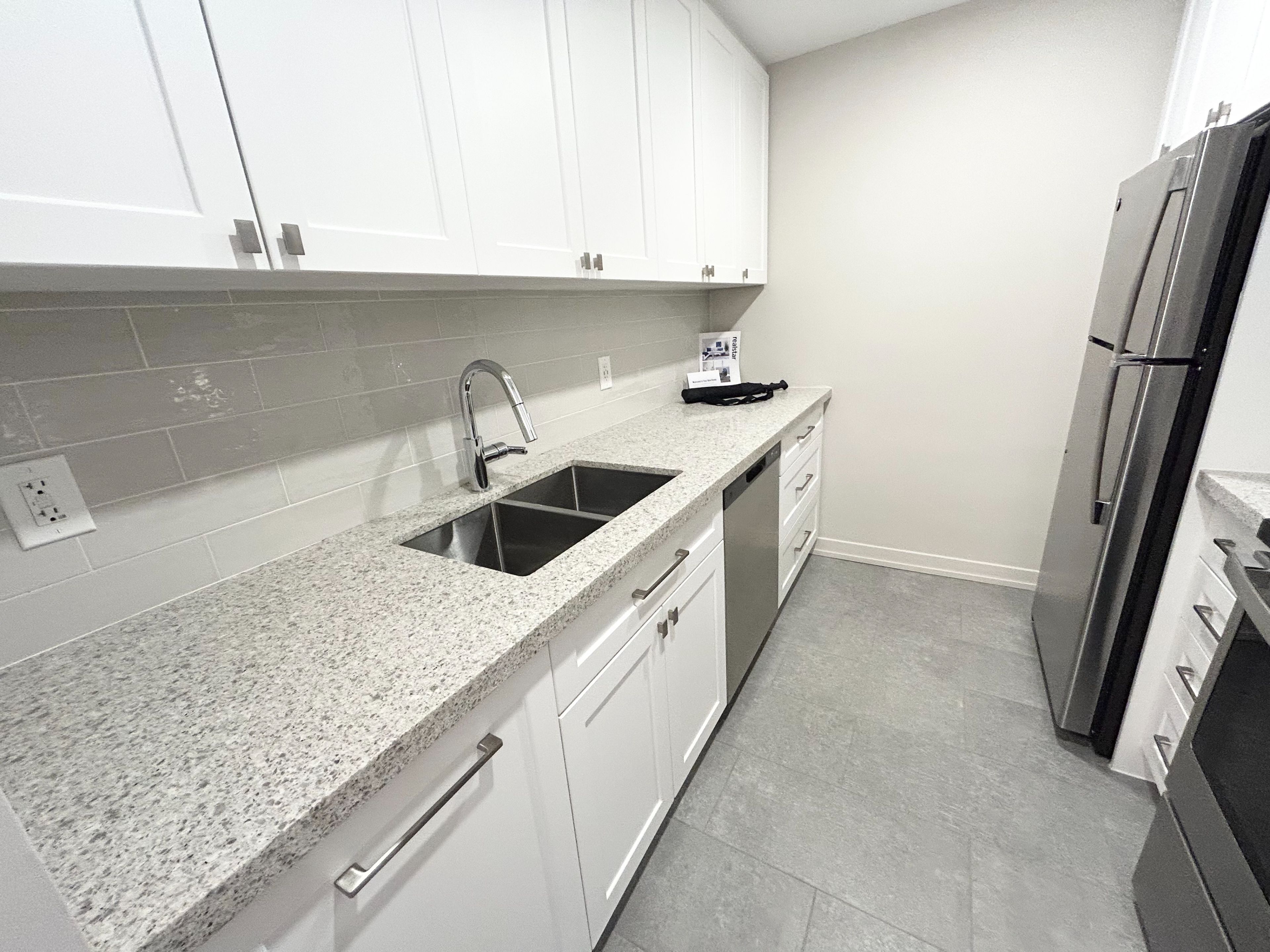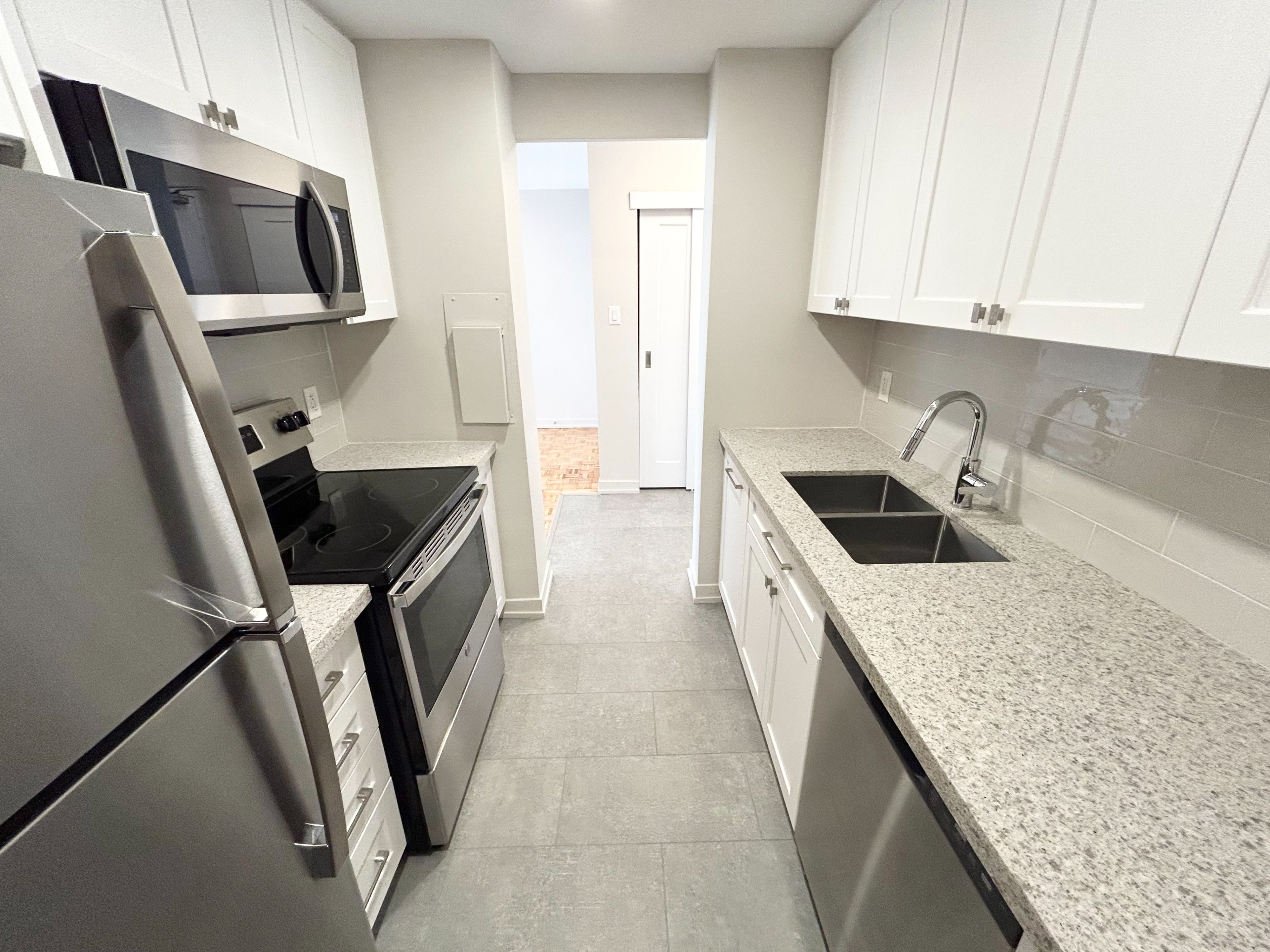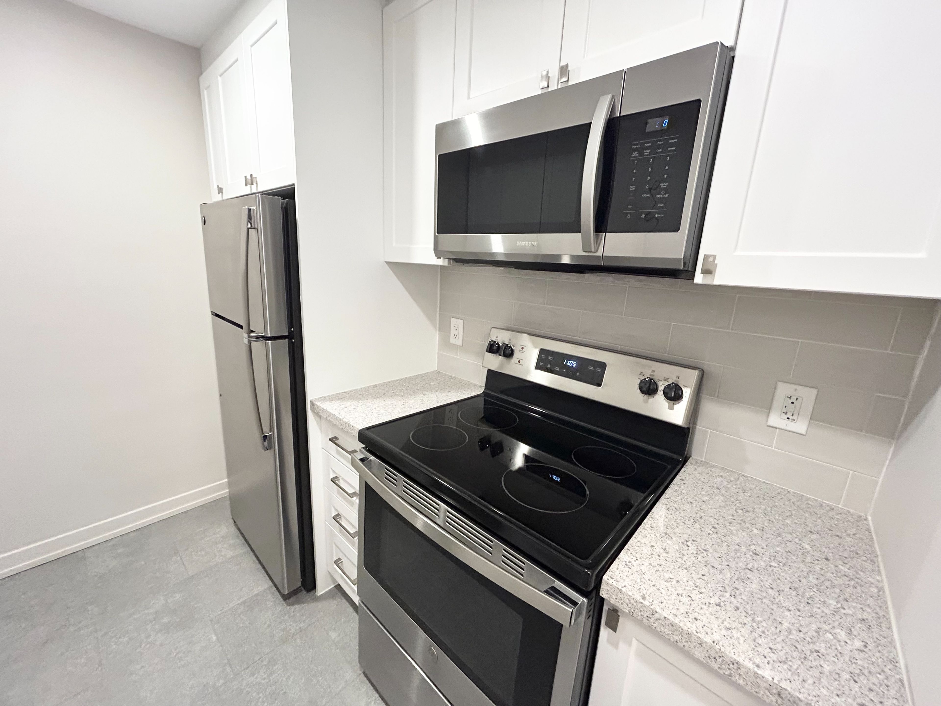 • Renovated kitchen with quartz countertops and stainless steel appliances.
