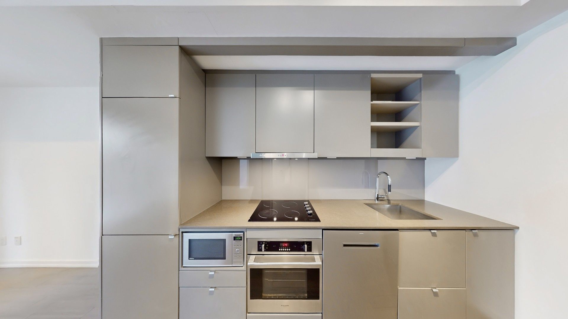 • Open-concept layout with a sleek kitchen and integrated stainless steel appliances.