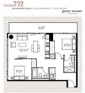 Penthouse unit at peter/adelaide, heart of toronto's entertain district. Corner suite. 2 bedroom 2 washroom condo. 772 sq ft + 160 sq ft balcony, unobstructed view. Sunset view from living room. Floor to ceiling windows. 10 feet ceiling, large bedrooms, master bedroom with en-suite washroom, en-suite laundry, central air conditioning. Modern kitchen with granite counters and miele appliances. 24 hour concierge/security. Walk score 100. Largest sized unit in the building!
