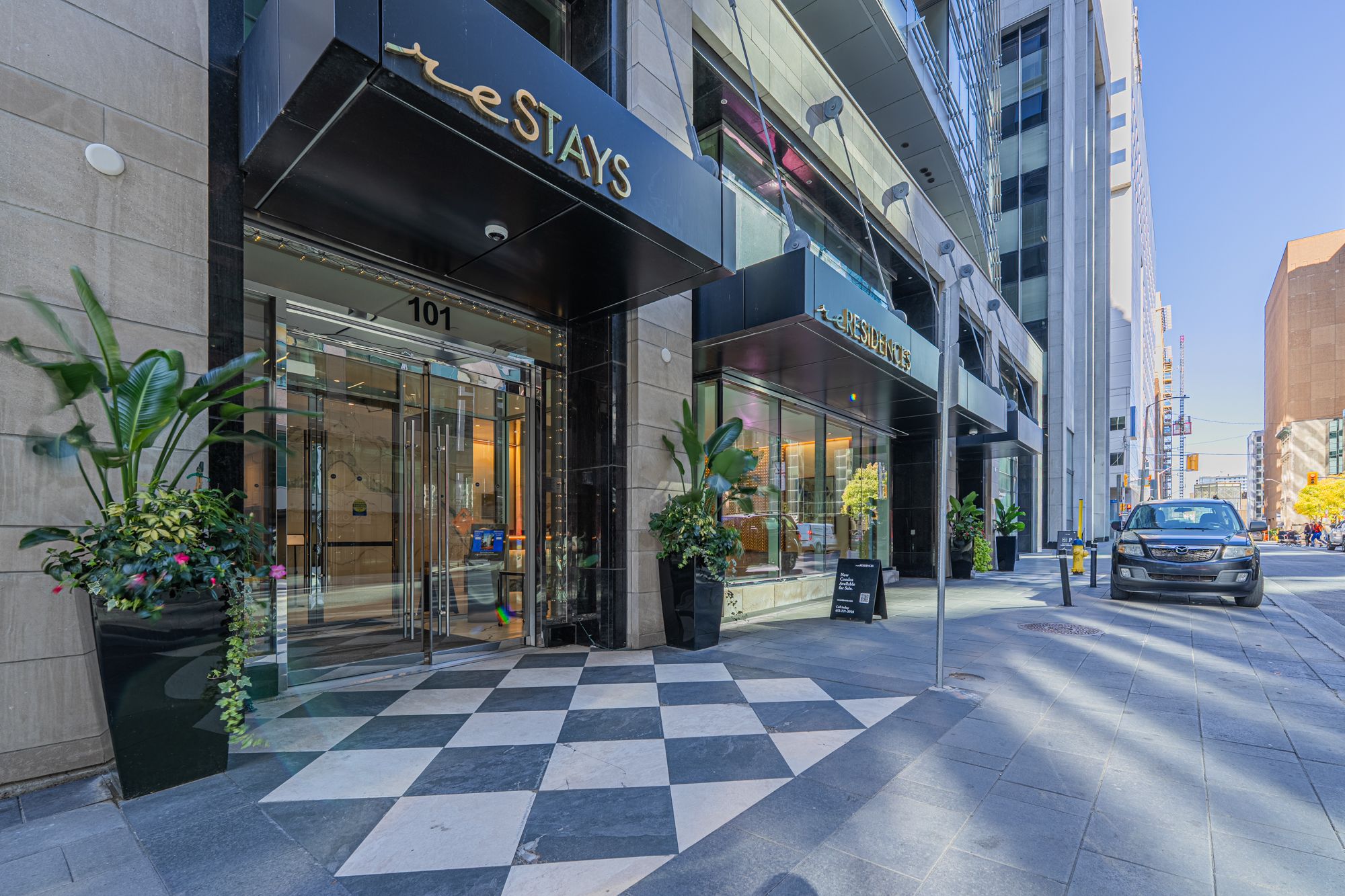Welcome to the prestigious "residences" at 101 queen street, one of ottawa's most exclusive addresses. This beautiful 1-bedroom + den condo with dedicated parking offers a perfect blend of luxury, comfort, and convenience in the heart of downtown. The open-concept layout features elegant hardwood flooring, floor-to-ceiling windows that fill the space with natural light, and a spacious living room that flows seamlessly onto a large balcony with breathtaking city views. The modern kitchen is equipped with quartz countertops, a roomy island/breakfast bar, ample storage, and high-end built-in appliances, making it ideal for both everyday living and entertaining. The unit also includes in-suite laundry, central a/c, and a stylish bathroom with premium fixtures, ensuring a truly move-in-ready experience - with electricity as the only utility paid by the tenant. Residents enjoy world-class amenities including 24/7 concierge services (with tailor, dry cleaning, driver, and housekeeping options), a state-of-the-art fitness center, sauna, movie theatre, games and party rooms, a pet spa, car wash bay, and the exclusive sky lounge offering stunning views of parliament hill. Perfectly located just steps away from lrt stations, fine dining, and luxury shopping, this home represents the epitome of sophisticated urban living in ottawa.