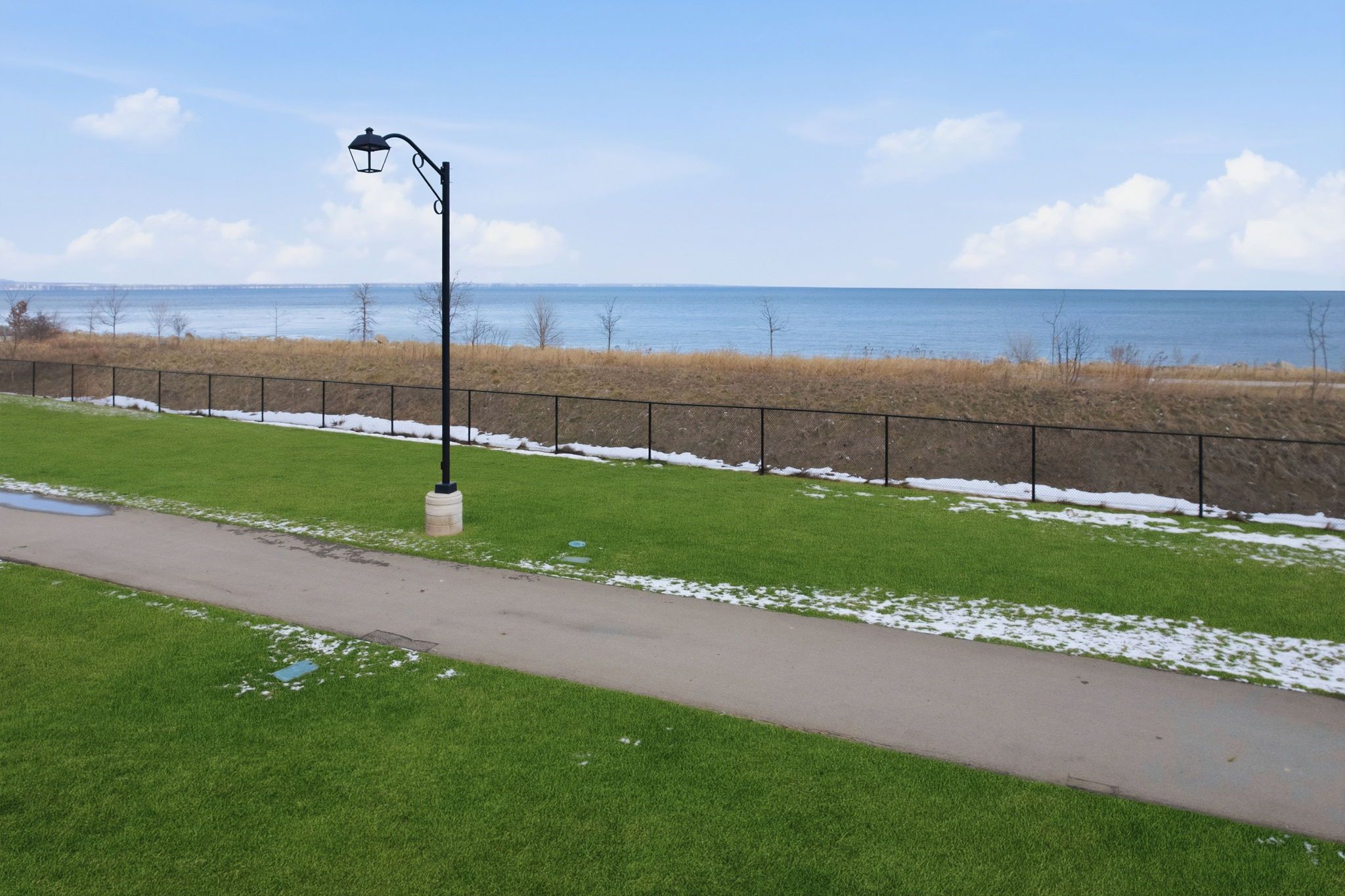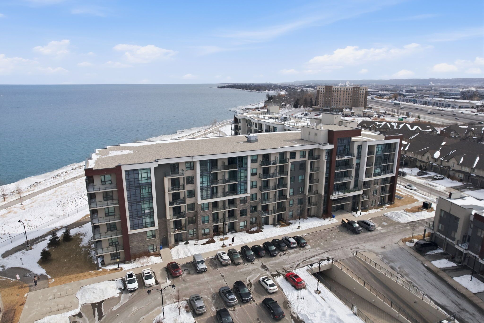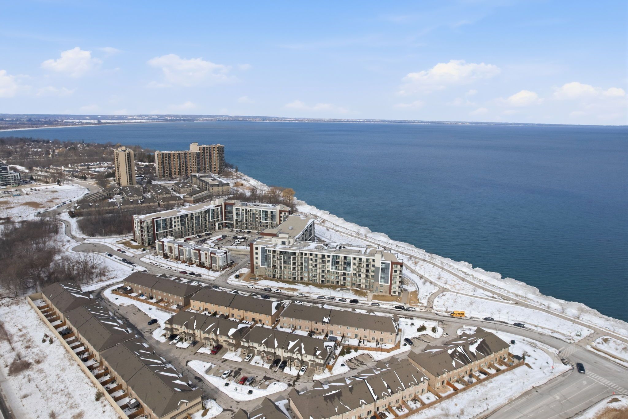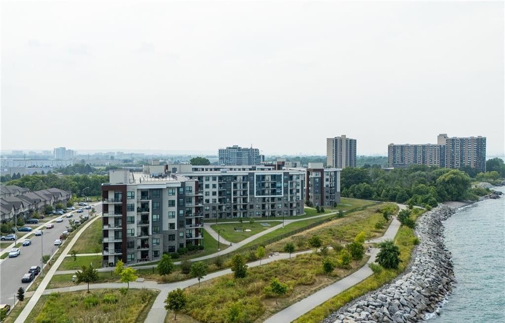 Lake view! Walkout! Pet lovers! Up to $10k in custom buyer incentives! Welcome to this beautifully proportioned, bright 1-bedroom condo, perfectly positioned just steps from lake ontario and a secluded beach, with sweeping views toward burlington and the toronto skyline. Offering the convenience of a main-floor walkout and a private front-door hallway entry, this home blends condo living with the feel of a ground-level retreat. Freshly painted in a neutral palette, the unit features 9-foot ceilings and a bright, open-concept layout designed to maximize both space and natural light. Warm-toned upgraded laminate flooring flows seamlessly from the living area through the hallway and into the bedroom, with upgraded trim creating a cohesive and inviting atmosphere. Step outside to your private, serene patio and rear lawn area overlooking the lake - an ideal setting for morning coffee, evening cocktails, or outdoor dining with easy access for pet owners. The kitchen showcases quartz countertops, frigidaire stainless steel appliances, a sleek smooth-top stove, blanco double under-mount sink, pull-down faucet, and stylish backsplash. A breakfast bar provides space for casual dining or entertaining, while custom blinds throughout add comfort and privacy. The bedroom offers flexibility for furniture placement, complemented by a large window and generous closet. Just across the hallway, the well-appointed 4-piece bathroom features updated porcelain tile, a custom glass shower wall, and a conveniently located, separated in-suite laundry area. Enjoy excellent building amenities, including a party room, exercise room, rooftop terrace, bike storage, and secure underground parking, along with direct access to scenic waterfront trails and a peaceful public beach. Situated with quick access to major commuter routes, confederation go, and everyday conveniences. Whether you're a first-time buyer, downsizer, or investor, this turnkey lakefront condo delivers exceptional value.