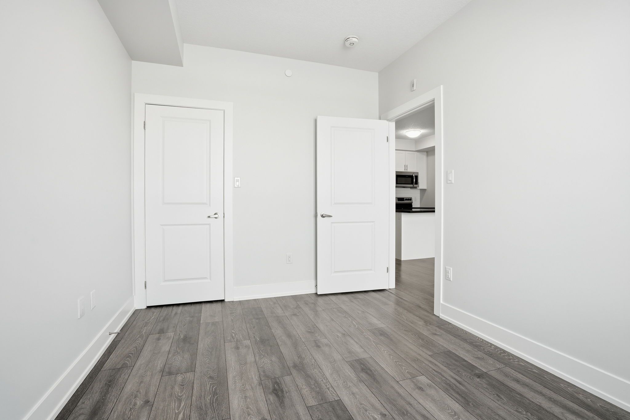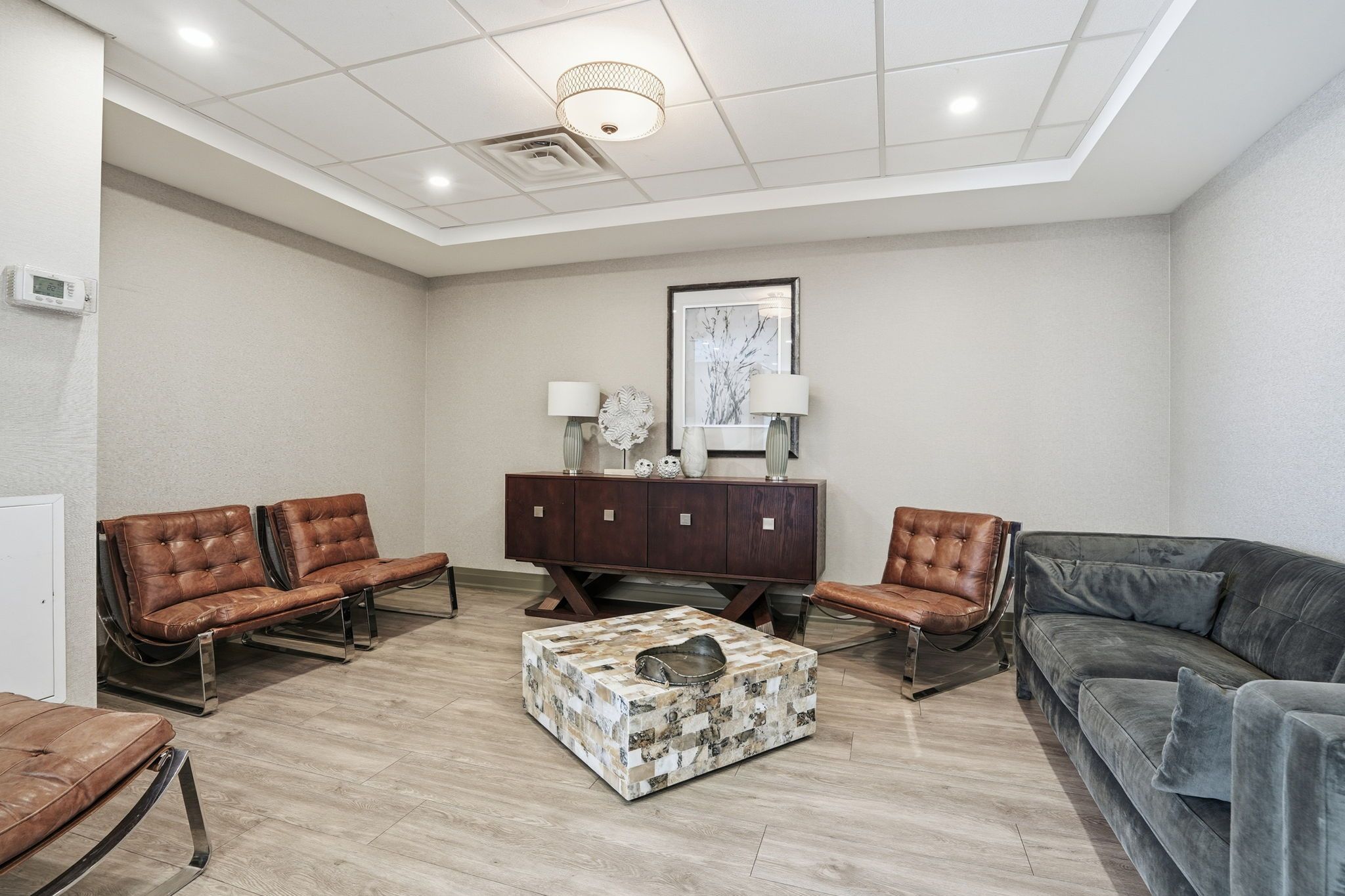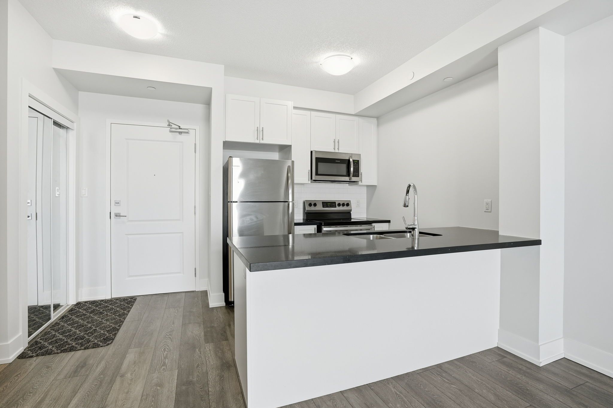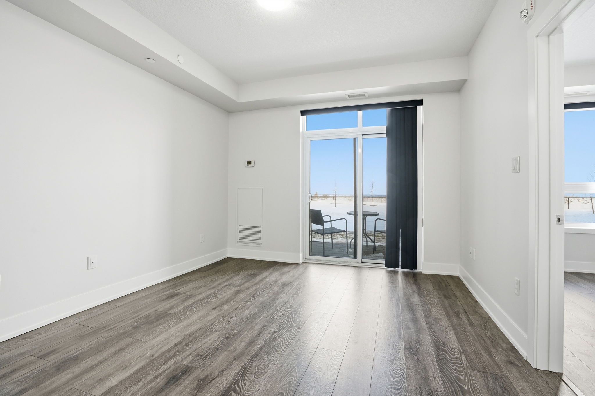 Lake view! Walkout! Pet lovers! Up to $10k in custom buyer incentives! Welcome to this beautifully proportioned, bright 1-bedroom condo, perfectly positioned just steps from lake ontario and a secluded beach, with sweeping views toward burlington and the toronto skyline. Offering the convenience of a main-floor walkout and a private front-door hallway entry, this home blends condo living with the feel of a ground-level retreat. Freshly painted in a neutral palette, the unit features 9-foot ceilings and a bright, open-concept layout designed to maximize both space and natural light. Warm-toned upgraded laminate flooring flows seamlessly from the living area through the hallway and into the bedroom, with upgraded trim creating a cohesive and inviting atmosphere. Step outside to your private, serene patio and rear lawn area overlooking the lake - an ideal setting for morning coffee, evening cocktails, or outdoor dining with easy access for pet owners. The kitchen showcases quartz countertops, frigidaire stainless steel appliances, a sleek smooth-top stove, blanco double under-mount sink, pull-down faucet, and stylish backsplash. A breakfast bar provides space for casual dining or entertaining, while custom blinds throughout add comfort and privacy. The bedroom offers flexibility for furniture placement, complemented by a large window and generous closet. Just across the hallway, the well-appointed 4-piece bathroom features updated porcelain tile, a custom glass shower wall, and a conveniently located, separated in-suite laundry area. Enjoy excellent building amenities, including a party room, exercise room, rooftop terrace, bike storage, and secure underground parking, along with direct access to scenic waterfront trails and a peaceful public beach. Situated with quick access to major commuter routes, confederation go, and everyday conveniences. Whether you're a first-time buyer, downsizer, or investor, this turnkey lakefront condo delivers exceptional value.