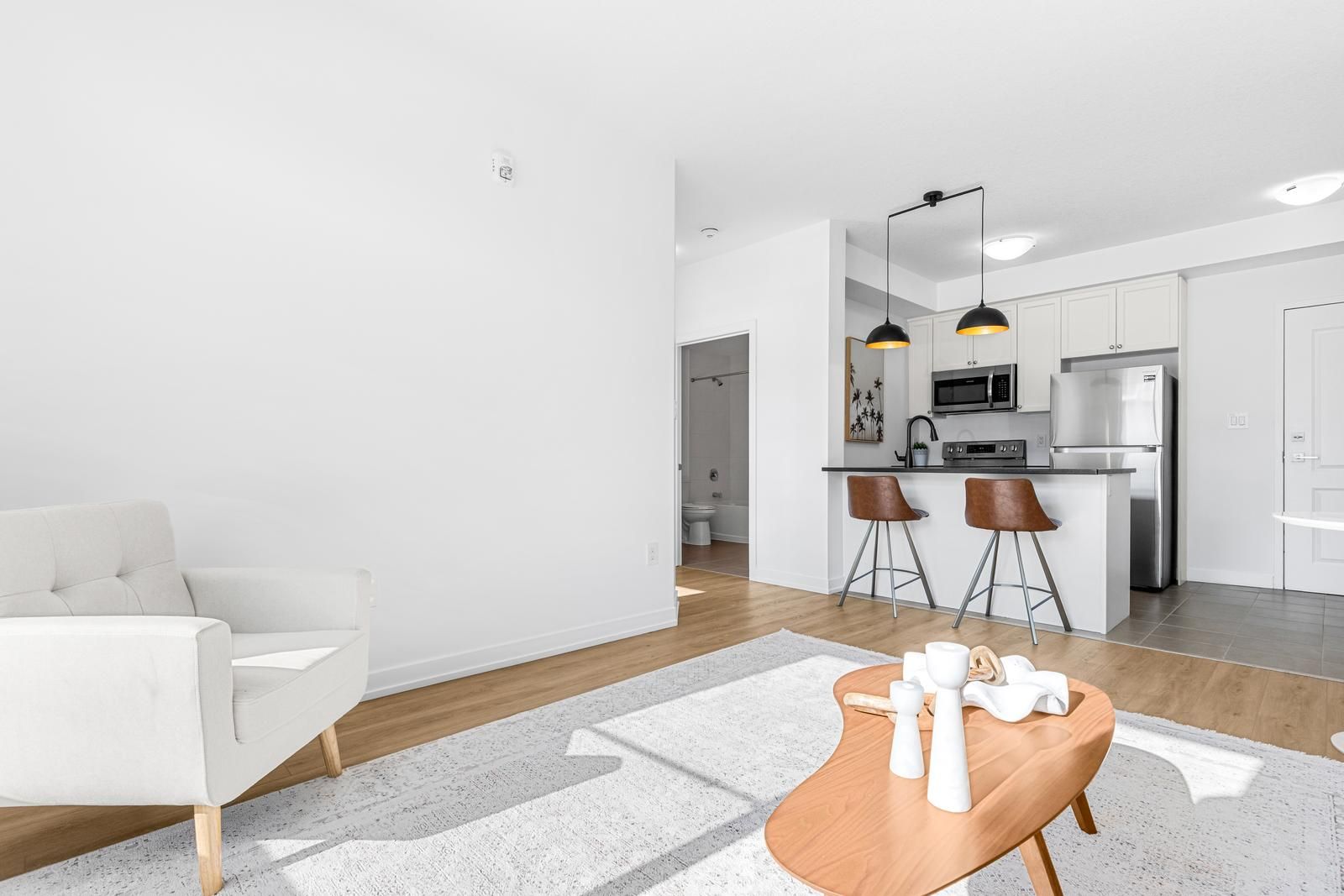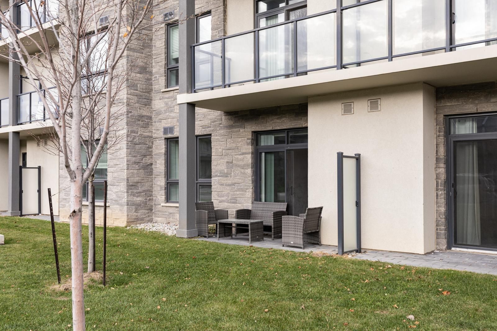 Beautifully renovated and upgraded sun filled lake front unit. Step out directly onto the backyard from this spacious 573 square foot condo that includes a 63 square ft terrace. Being on the main floor is ideal for anyone with pets or those not wanting to give up back yard living. Partial waterview from your patio and steps from the waterfront trail. Modern open concept living/dining/kitchen. In-suite laundry with upgraded full size stacked washer & dryer included. The kitchen features quartz counter tops, upgraded ceramic flooring, stainless steel fridge, stove, dishwasher and microwave. One parking spot and large storage locker. Sapphire condos offer many modern amenities such as roof top patio that offers gorgeous panoramic views of lake ontario. You'll enjoy entertaining in the party room. Stay fit working out at the perfect well equipped gym or running/walking on the waterfront trail. Parcel lockers & bike storage also available.