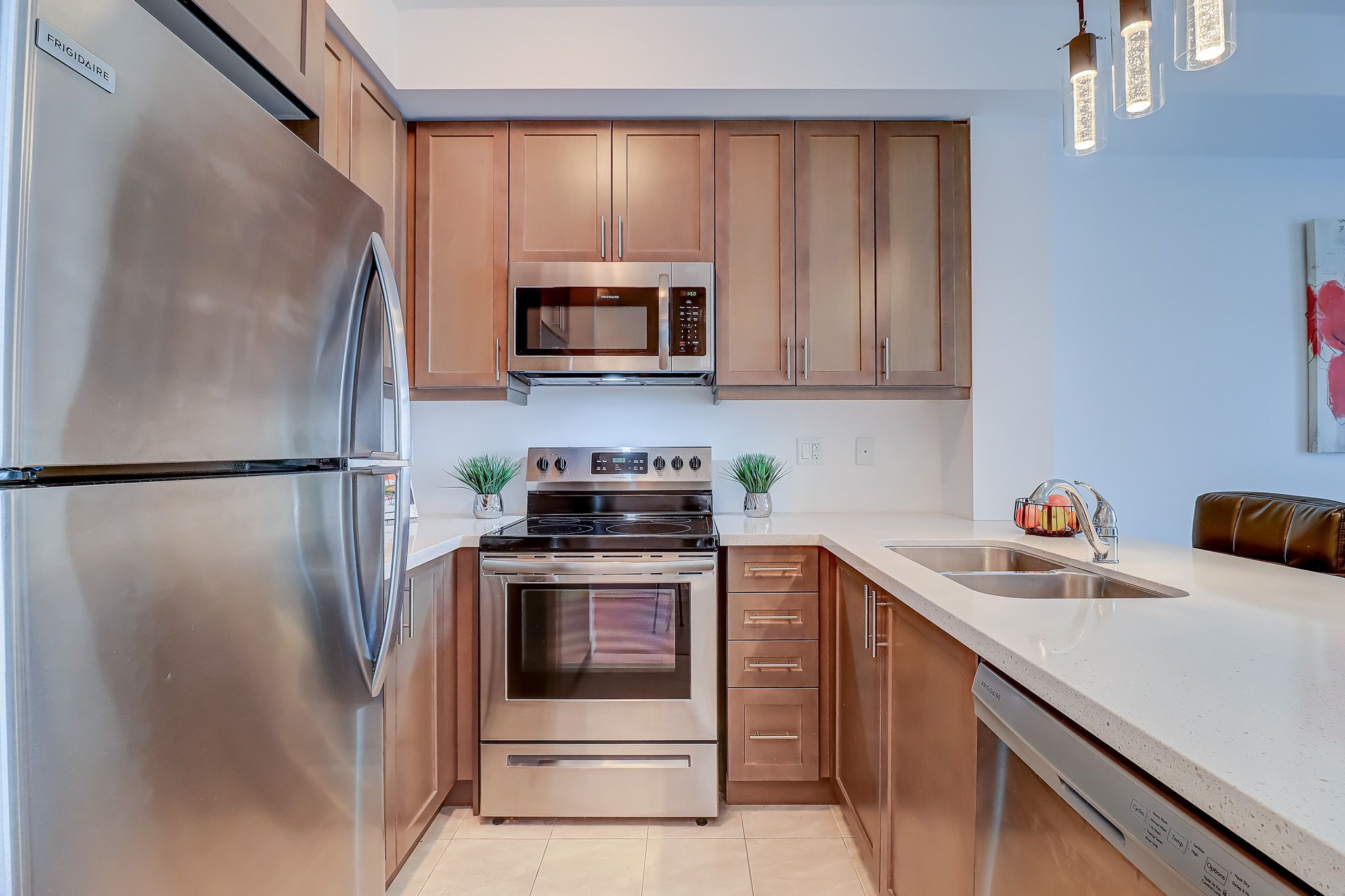 • Modern kitchen with quartz counters and stainless appliances.