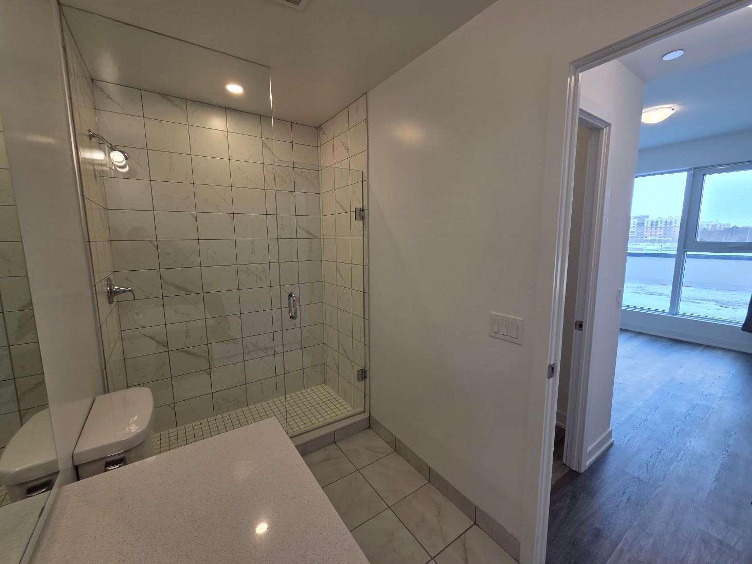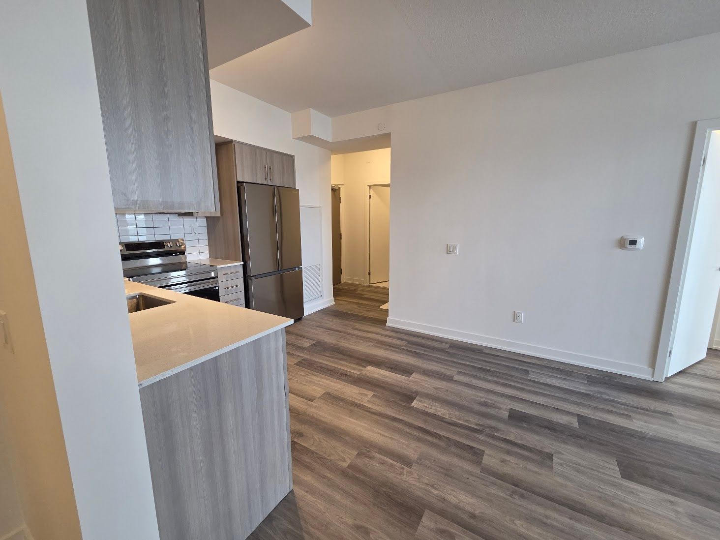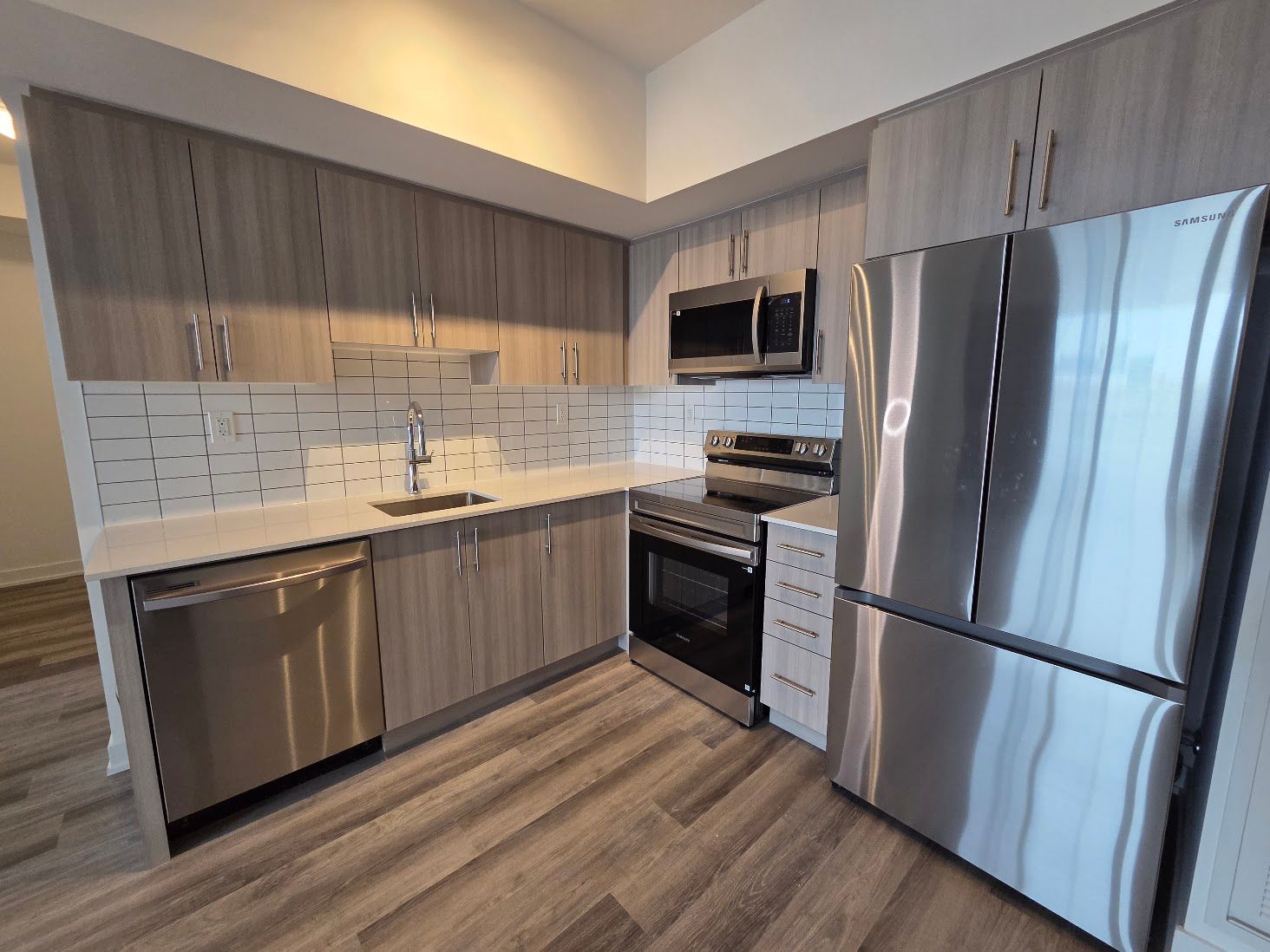 • Contemporary kitchen with quartz countertops and stainless steel appliances.