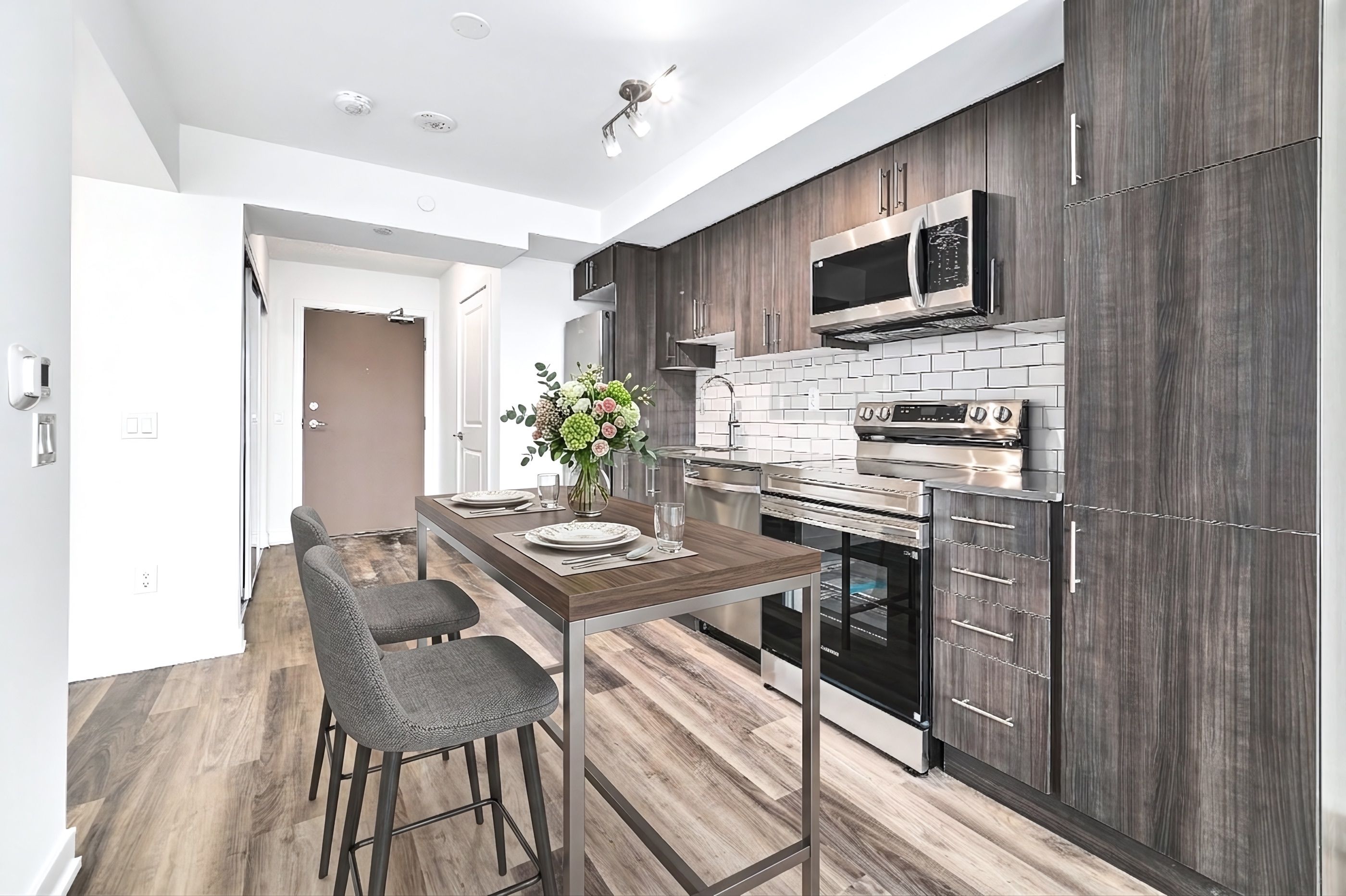 • Contemporary kitchen equipped with quartz countertops and stainless steel appliances.