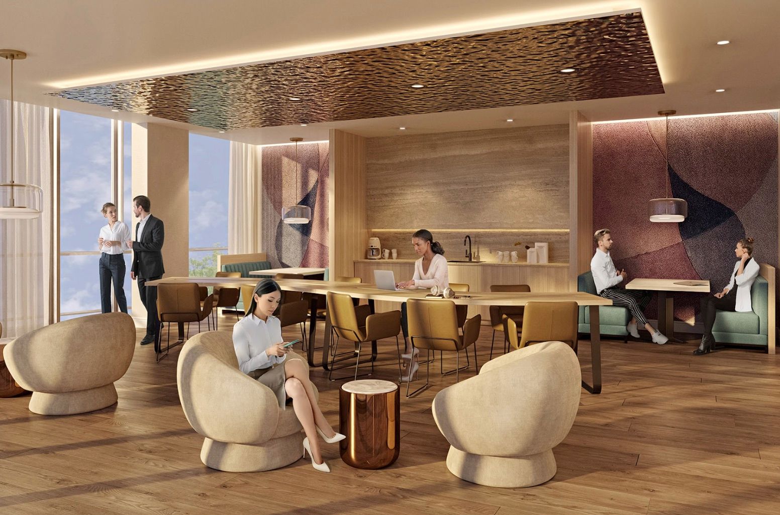 • Resort-style amenities include fitness center, pool, and co-working lounge.