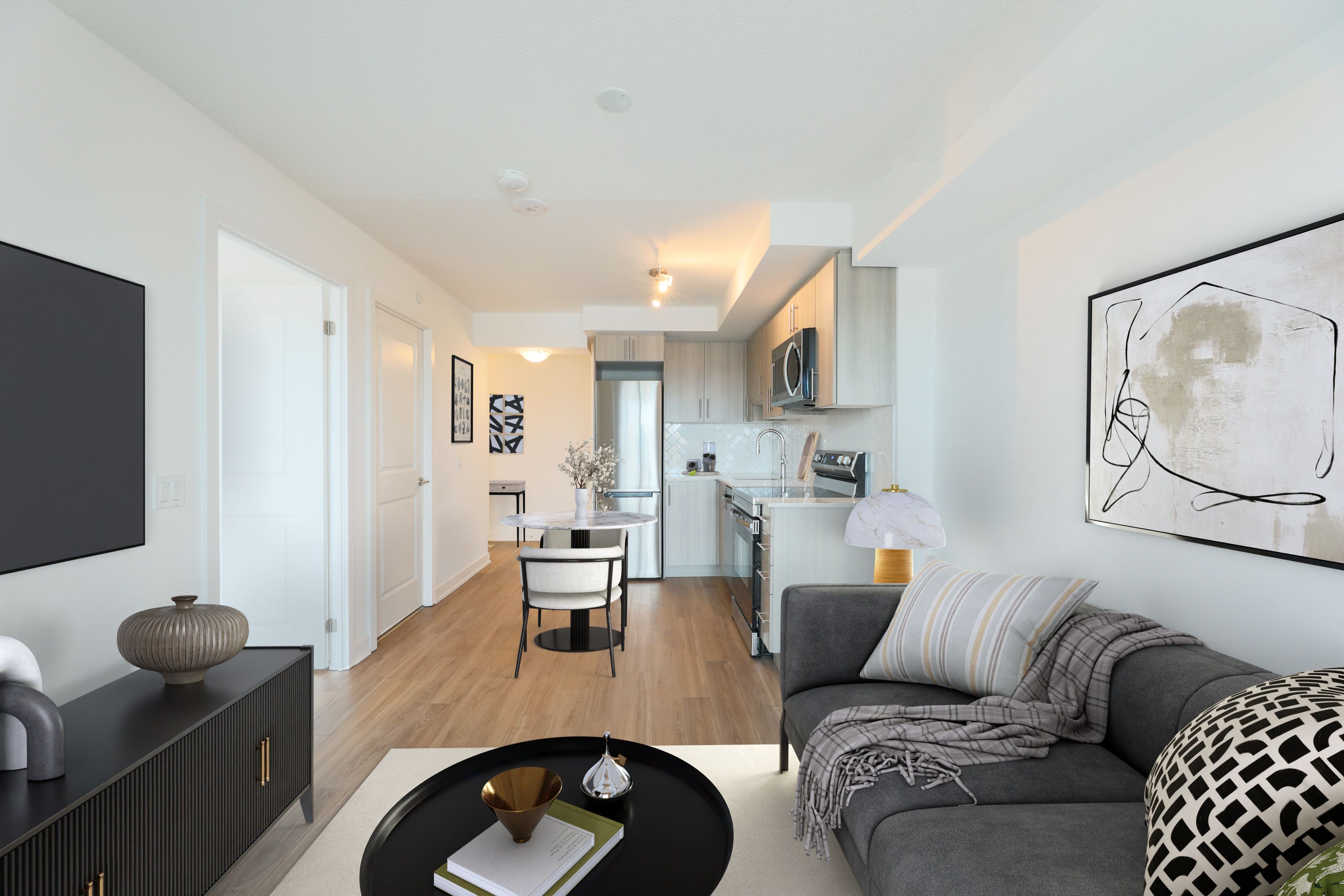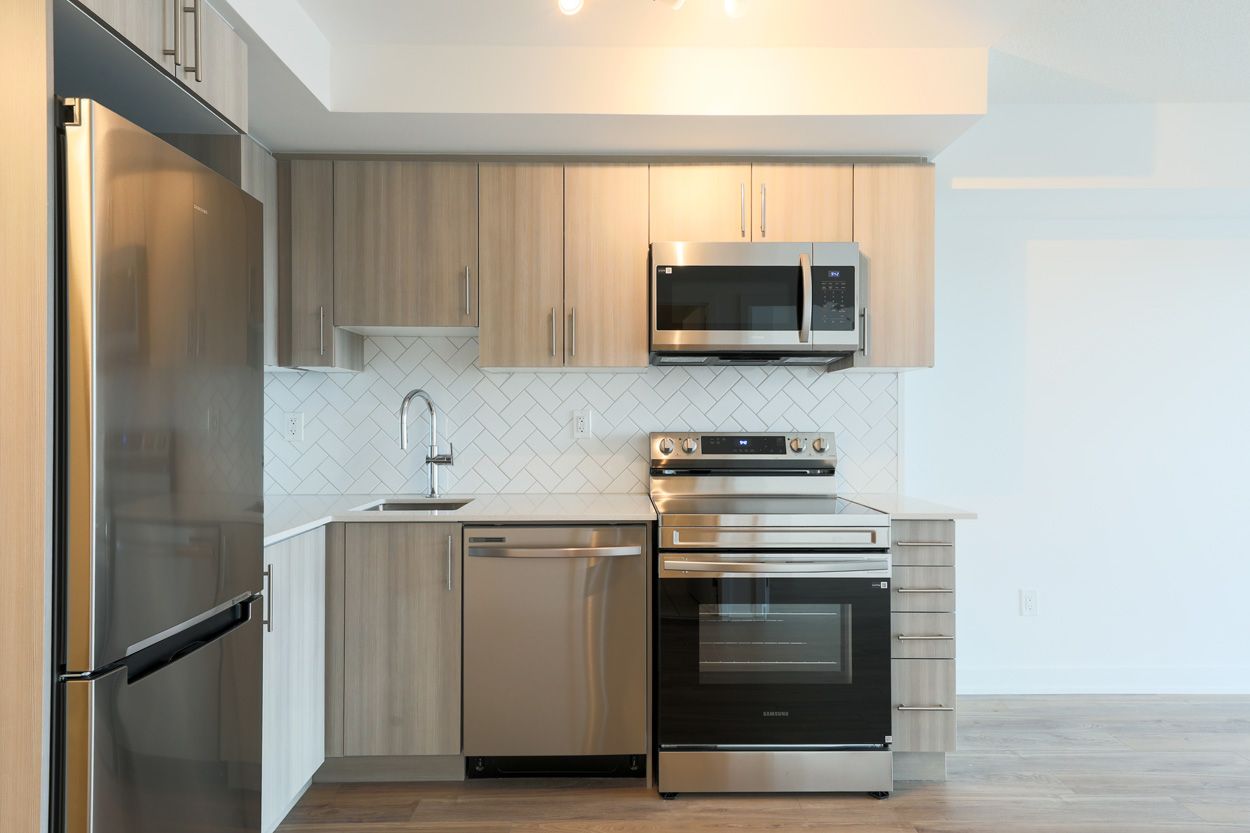 Welcome to this charming one-bedroom, one-bathroom suite, nestled in the lively universal city east in the heart of pickering. Spanning a comfortable 496 square feet, this thoughtfully designed residence also boasts an additional 56 square feet of outdoor space, ideal for savouring the fresh air or sipping your favourite beverage. The suite's north-facing orientation allows for an abundance of natural light to gracefully illuminate the living areas throughout the day, creating a warm and inviting atmosphere. The functional layout of the suite is accentuated by high-quality luxury vinyl flooring that flows seamlessly from room to room, ensuring both durability and elegance. In the kitchen, you'll find soft-closing drawers and contemporary finishes that combine both style and practicality, making it a delight for cooking and entertaining. Strategically located just minutes from the bustling pickering town centre, this location provides convenient access to a variety of shopping and dining options. Transportation is a breeze with the nearby go station, which offers a quick 30-minute commute to union station in downtown toronto. Additionally, outdoor enthusiasts will appreciate the picturesque waterfront trails that invite exploration of the area's natural beauty. With easy access to major highways, this residence strikes a perfect balance between comfort, style, and accessibility. This exceptional opportunity for urban living in a vibrant community is not to be overlooked. Tenant pays for water, hydro, and heat pump.
