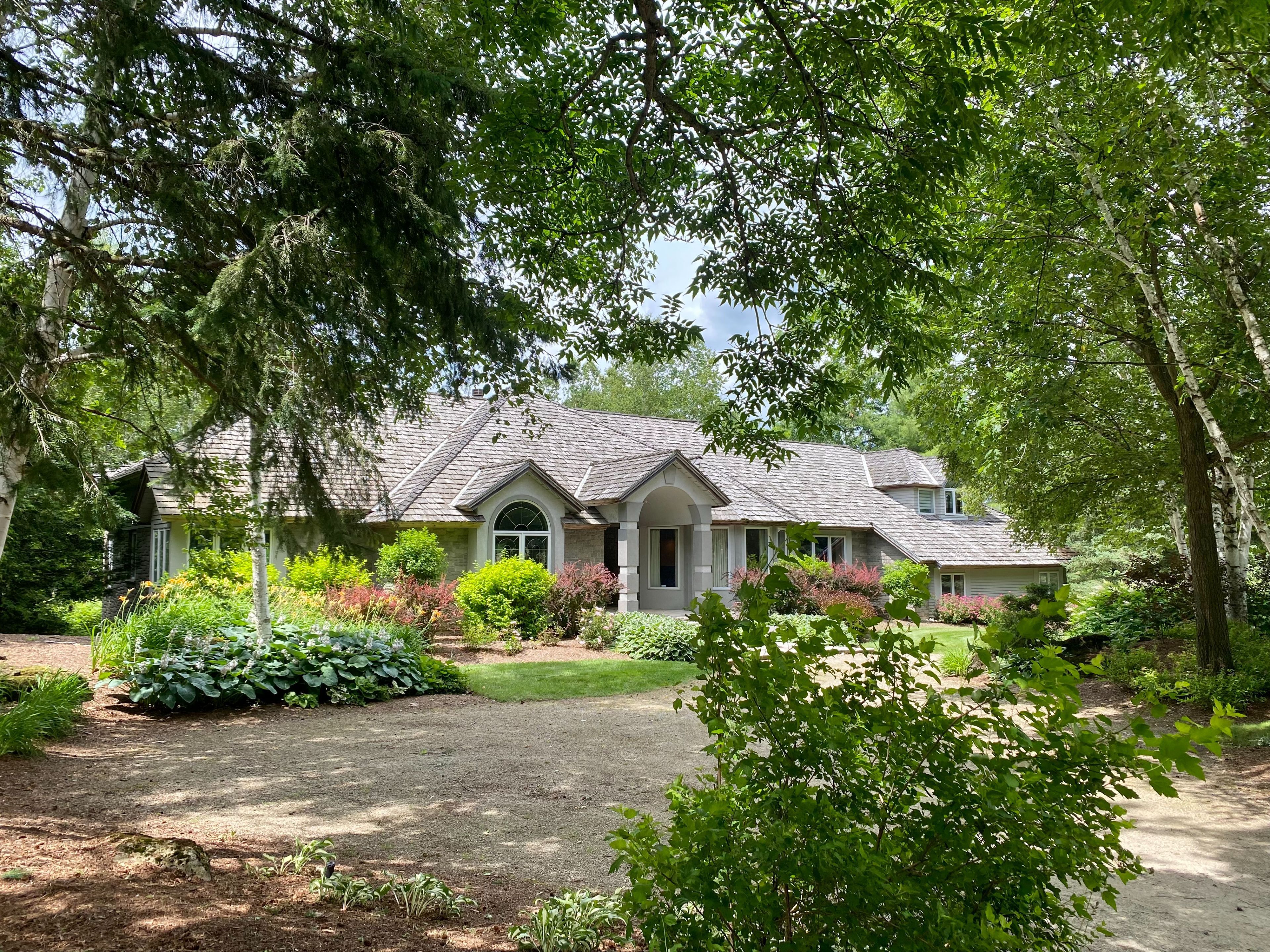 Welcome to this breathtaking countryside estate, a true gem set on 28 acres of picturesque land. This stunning property boasts mature trees, meticulously designed perennial gardens, and views of rolling hills. Offering 4,963 square feet of above-grade living space, plus a fully finished walkout basement, this luxurious home is designed for both entertaining and everyday comfort. Step inside to find 9 spacious bedrooms and 7 bathrooms, ensuring ample space for family and guests. The primary suite is a true retreat, complete with its own private balcony, a sunlit sitting room with panoramic windows, spacious walk-in closet, and a 5-piece ensuite. The main level showcases multiple walkouts to an expansive deck, where you will find a beautifully landscaped inground pool, surrounded by stone and lush gardens. Enjoy the serene surroundings from the charming gazebo, an ideal spot for relaxation. At the heart of the home, the large eat-in kitchen is a chefs dream, complete with a central island and an open-concept layout ideal for both everyday dining and entertaining. Additionally, the home includes a separate entrance to the second storey, which could serve as a nanny or in-law suite, providing added privacy and flexibility for extended family and guests. This estate is as practical as it is beautiful, featuring a triple-car garage, a cedar shingle roof, and an energy-efficient geothermal heating and cooling system. A carriage barn on the property adds character and offers additional storage or potential for various uses. Offering the perfect blend of luxury, comfort, and natural beauty, this extraordinary estate invites you to embrace the tranquility of country living. Do not miss your opportunity to make this exceptional home your own!