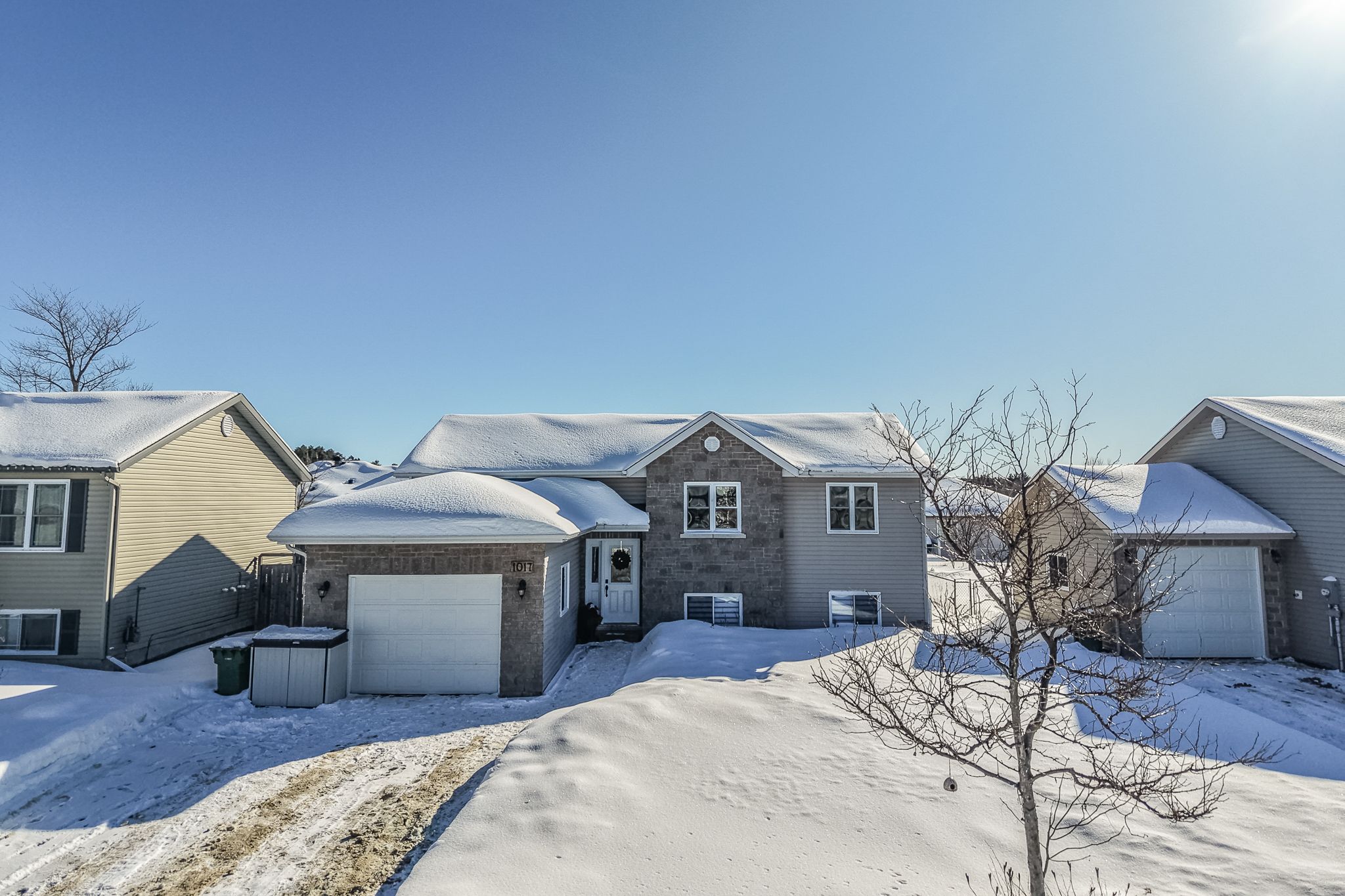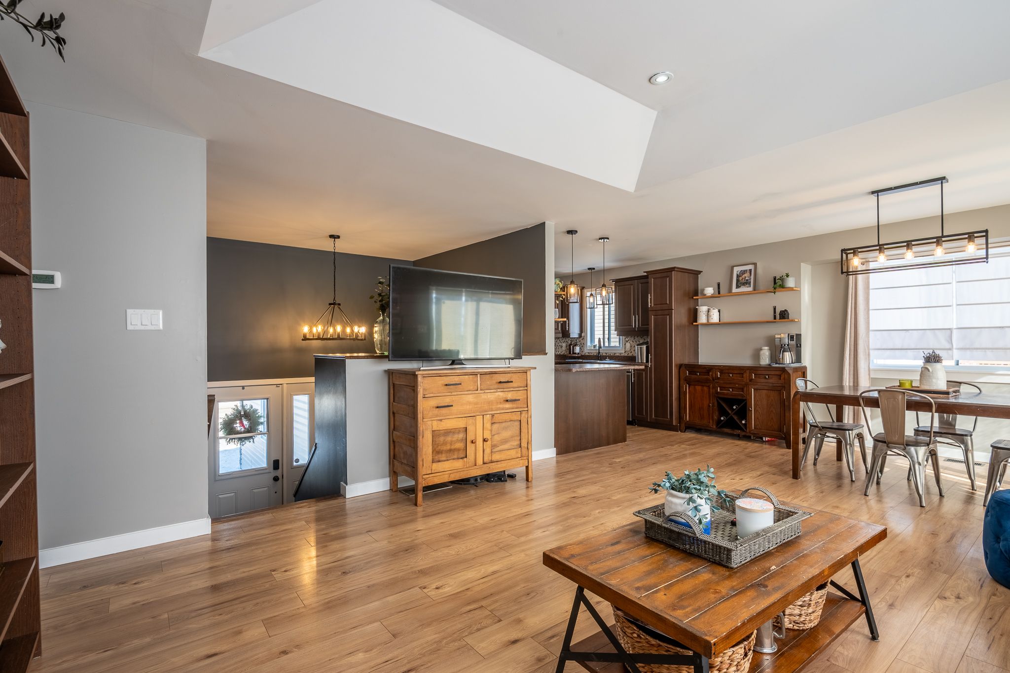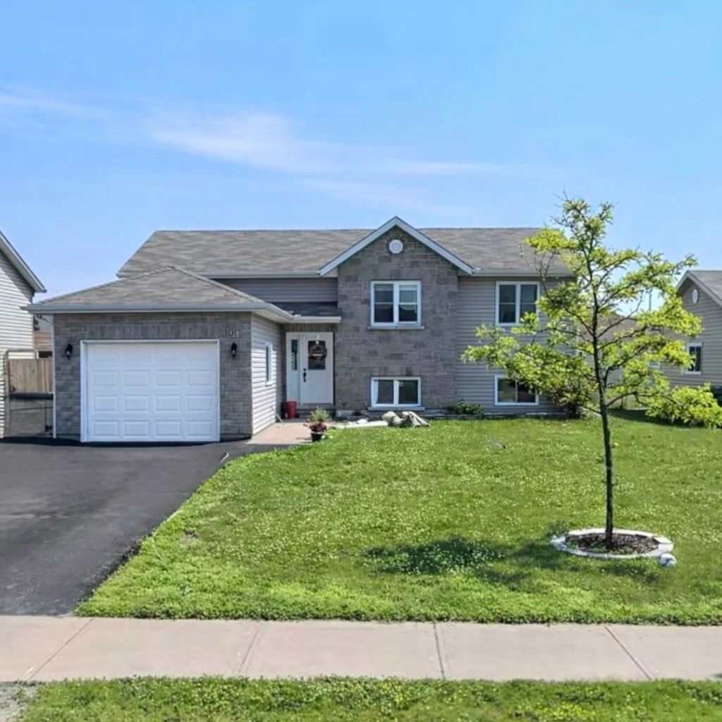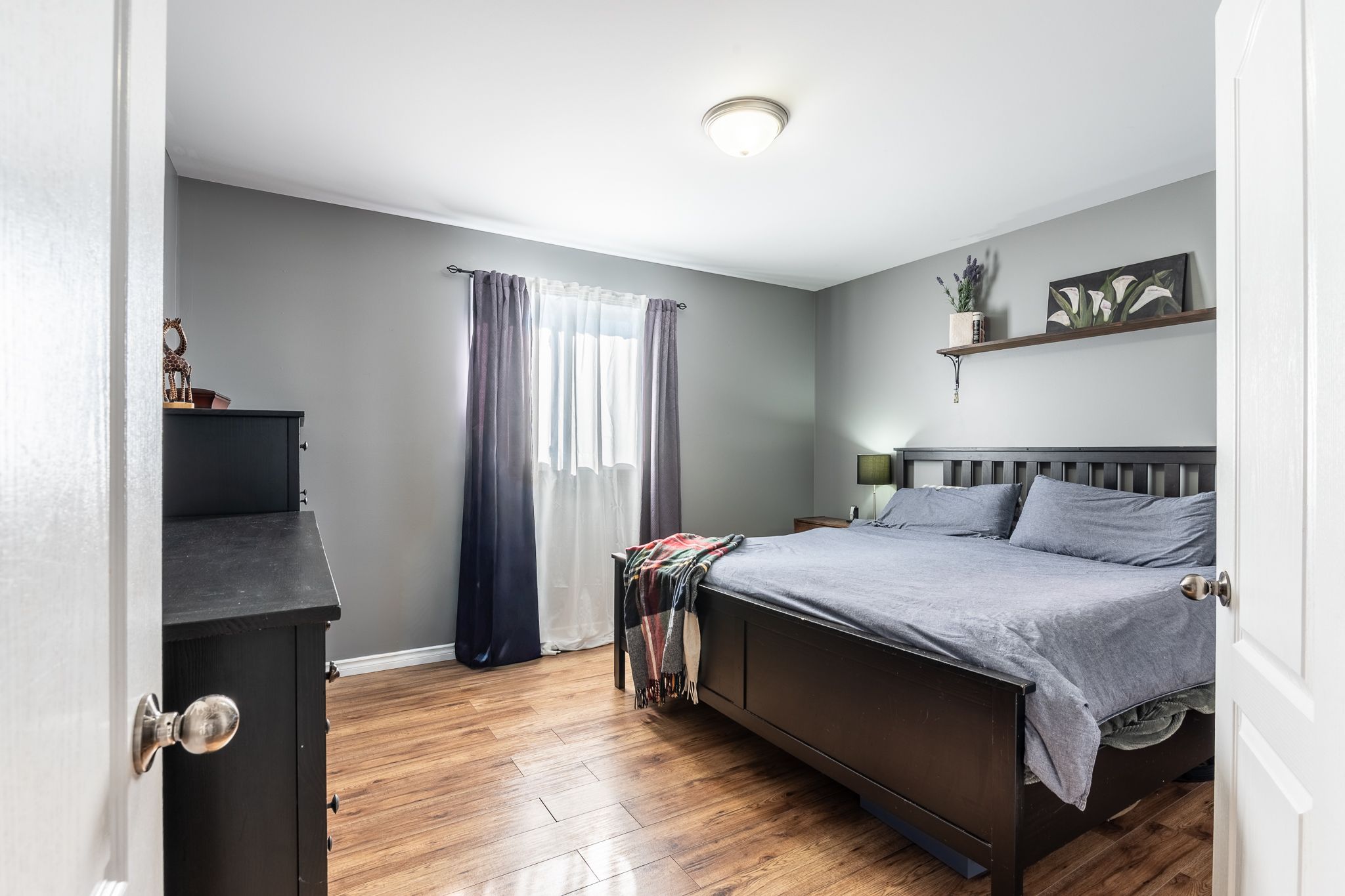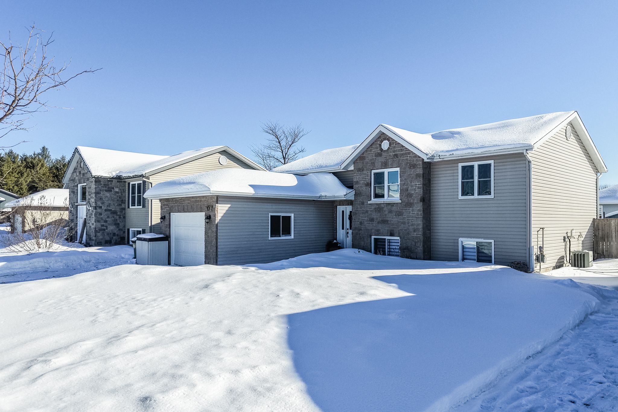 Welcome to this bright and welcoming home, ideally situated close to schools, parks, shopping, and more. You will appreciate the lovely curb appeal with gardens, and once inside, you will find a spacious and functional foyer with access to the attached garage. The upper level offers an open-concept layout that is perfect for both everyday living and entertaining, and is complete with elegant light fixtures. The living room flows seamlessly into the dining and kitchen areas, where you will find additional prep space and seating at the peninsula, ample cabinetry, and a sliding door leading outside to the 12'x14' composite deck with access to the fenced yard. This is the ideal spot to host summer barbecues or have your morning coffee with the sunrise. The main level includes a primary bedroom, which you enter through french doors, two additional bedrooms and a full bathroom with a convenient linen closet. The lower level features two more gathering spaces offering plenty of flexibility for a home office space, play area or gym. A fourth bedroom and a second full bathroom adorn this level. If you are looking for additional space for your outdoor equipment or a work kit, there is a bonus storage room approximately 6'x10' with shelves. Once outside, you will enjoy the fenced backyard, complete with a shed for quick and easy storage of your garden tools. Perfectly located in the desirable limestone trail subdivision, this home is a fantastic opportunity for anyone looking for a great balance of space, comfort, and convenience.