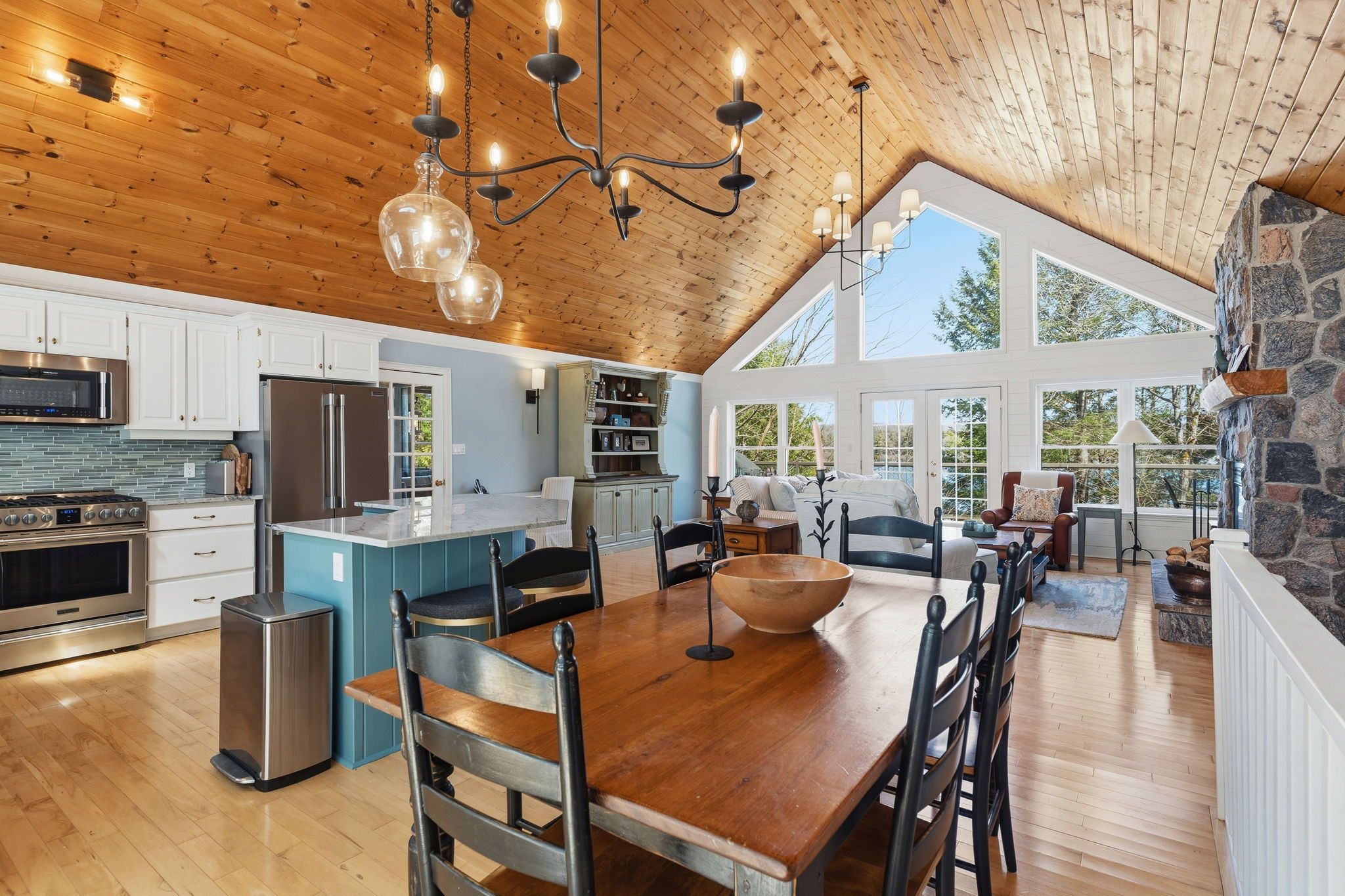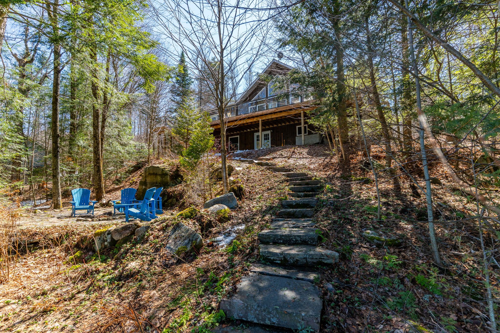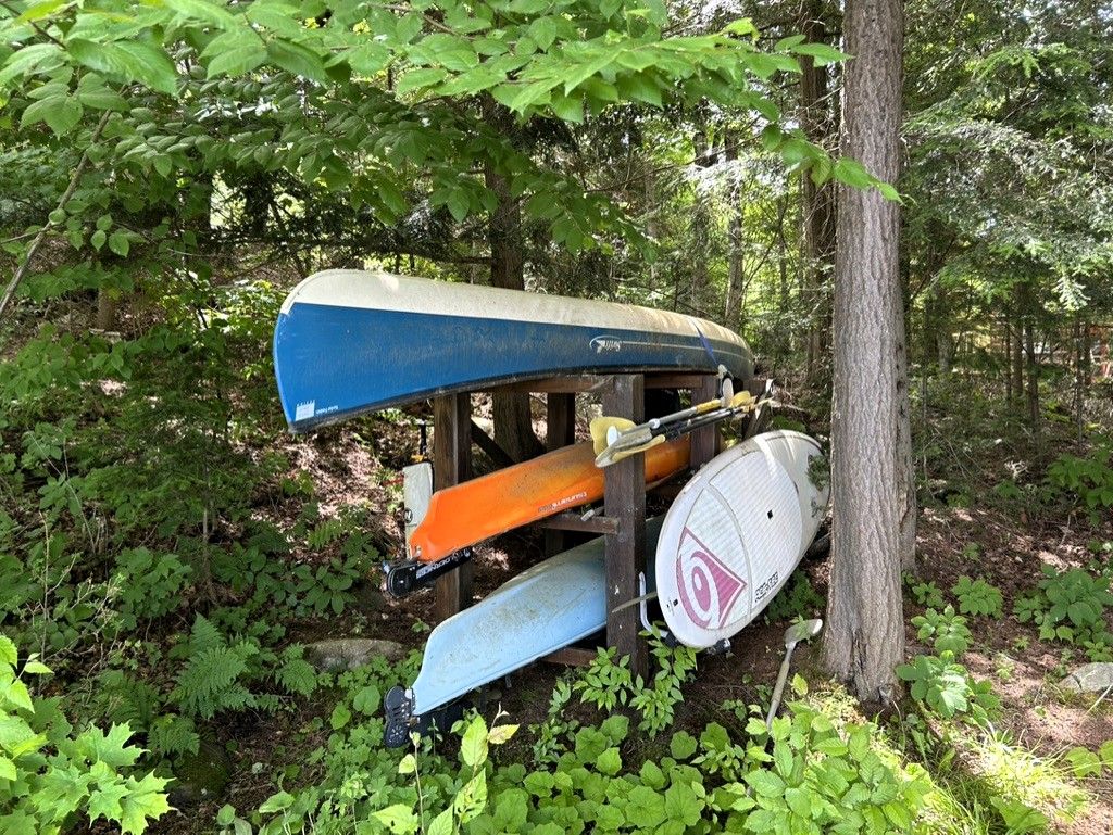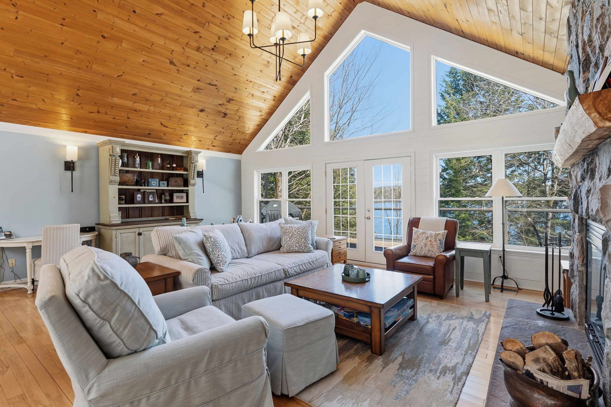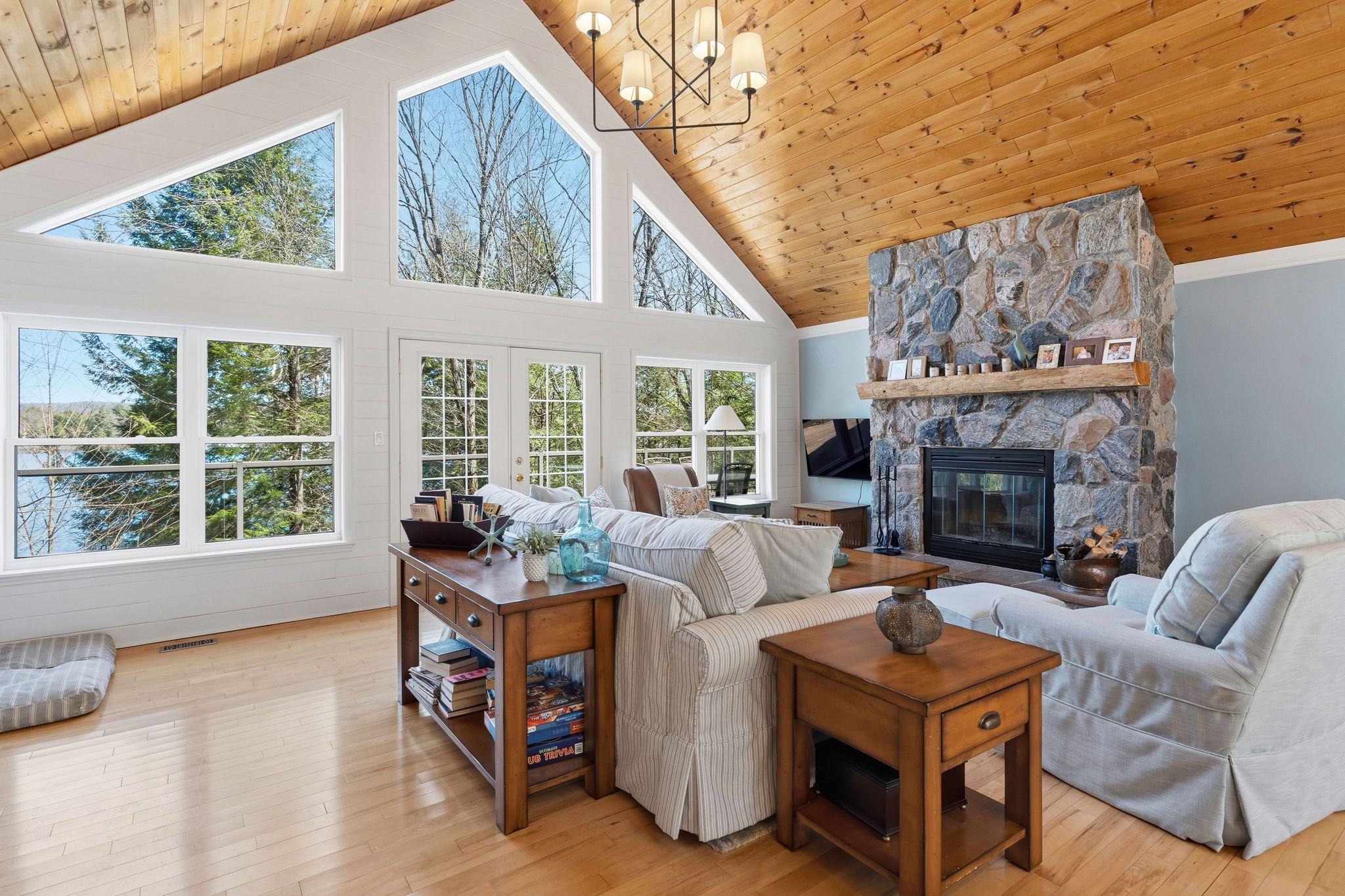Exceptional redstone lake waterfront in one of the haliburton highlands' most sought-after executive enclaves. This premium offering features 150 feet of pristine shoreline and just under an acre of private, well-landscaped grounds, delivering a refined four-season lifestyle. Designed for effortless living and entertaining, the home offers 4 bedrooms and 3 bathrooms with a seamless open-concept layout oriented to expansive lake views. Vaulted ceilings and a wood-burning fireplace define the principal living space, while the gourmet kitchen with professional-grade appliances flows seamlessly into the dining and living areas. A bright lakeside sunroom provides a relaxed retreat, and the main floor primary suite offers a private escape with ensuite and walkout to the deck. Expansive decking extends the living space outdoors with multiple areas for dining and lounging. The fully finished lower level adds excellent additional space for entertaining family and guests. Landscaping is thoughtfully executed with granite steps, walkways, and patios that blend naturally with the setting. At the shoreline, a fire pit area creates an ideal lakeside gathering space, while the large dock captures full sun and provides access to redstone's deep, clean water for swimming and boating. A premium haliburton highlands waterfront property defined by privacy, quality, and a highly desirable lakefront setting.