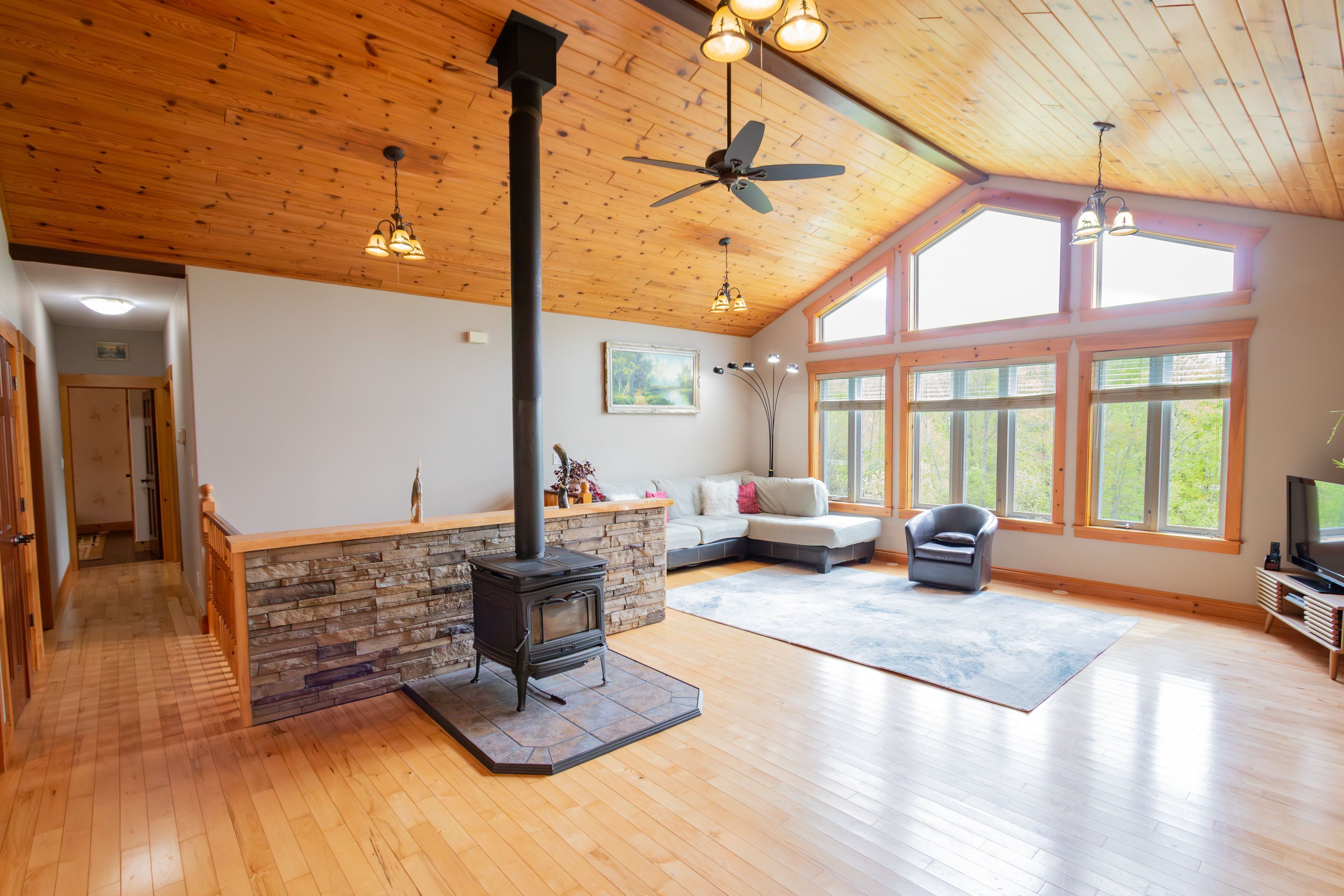 • Bright living areas with large windows and cathedral ceilings.