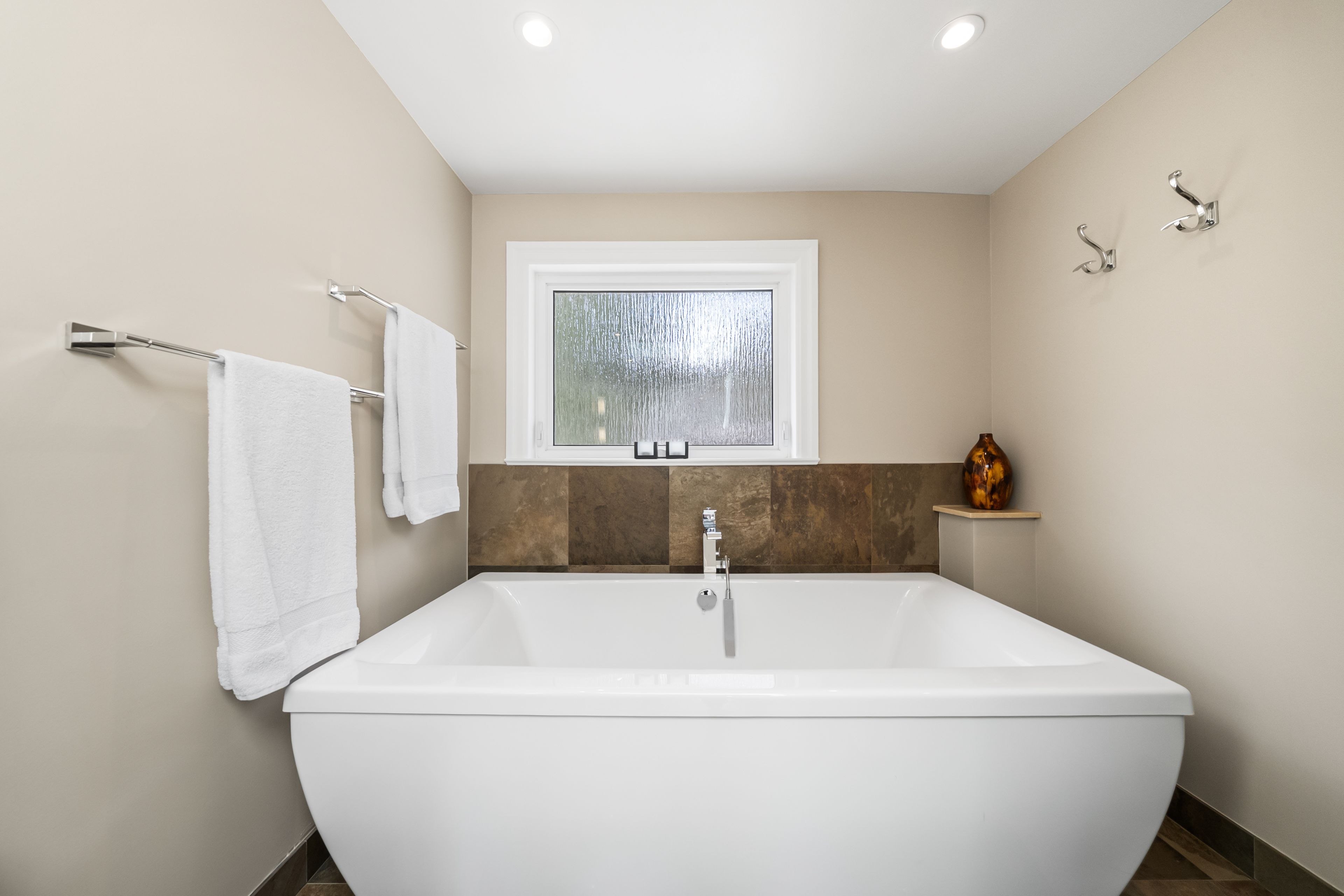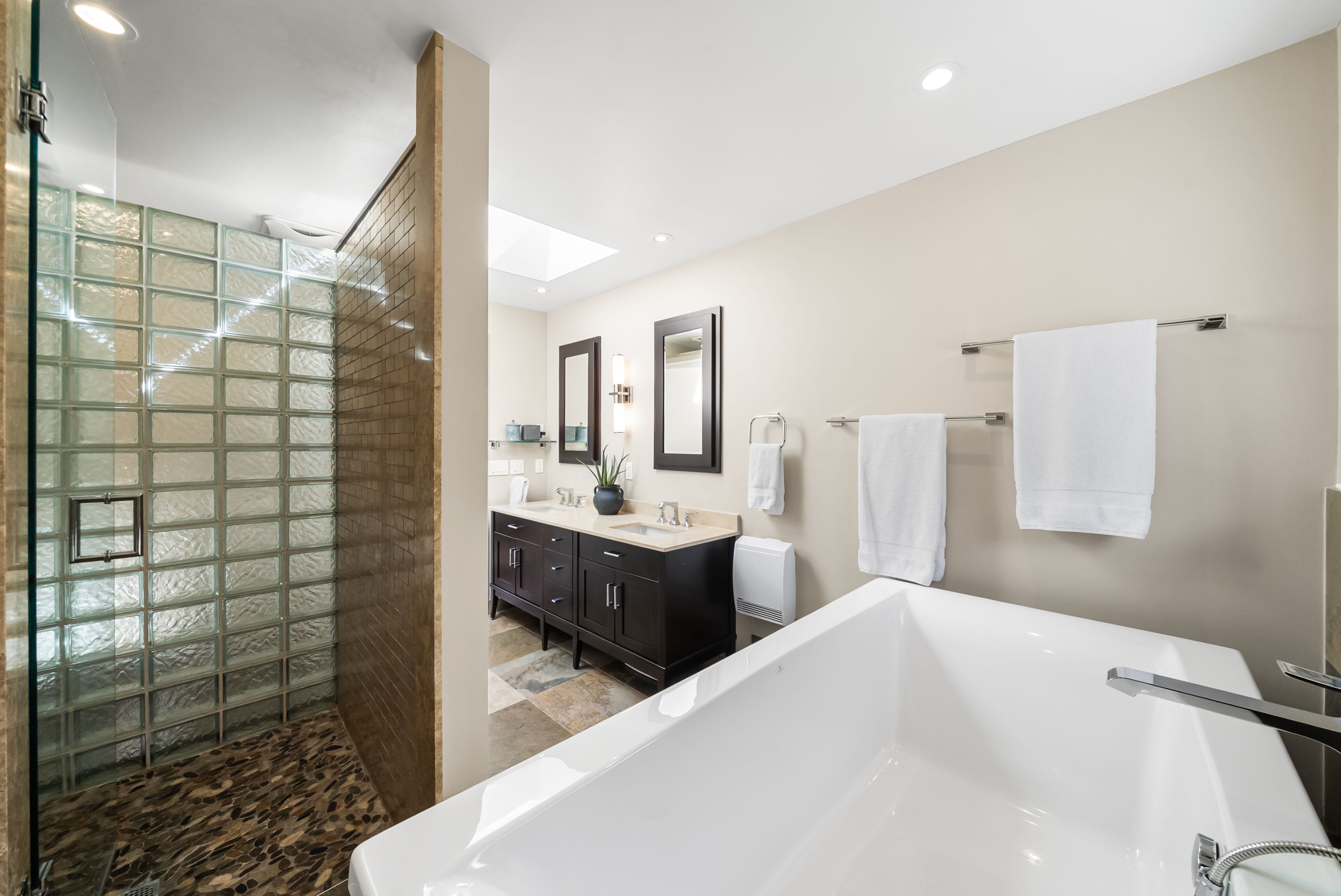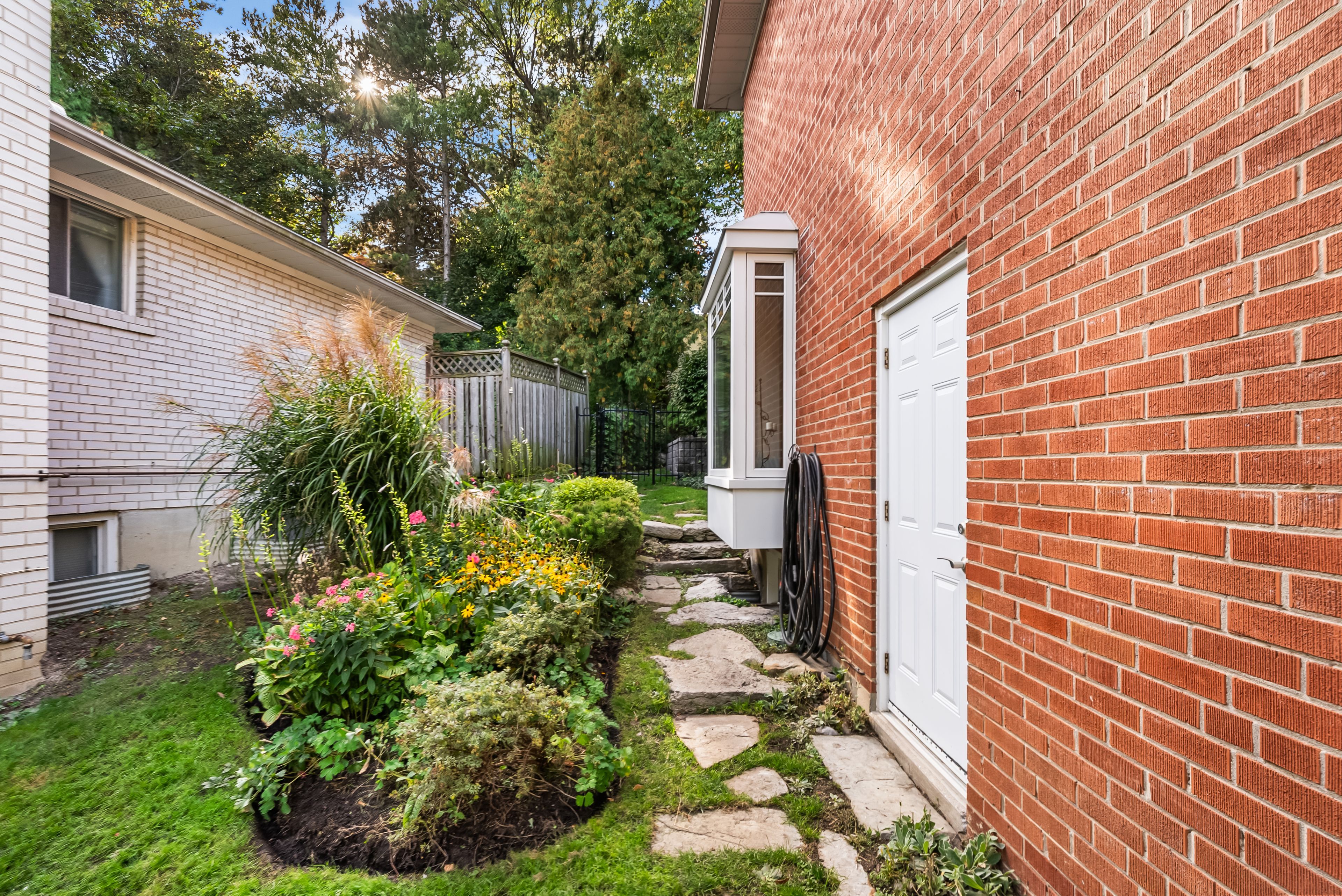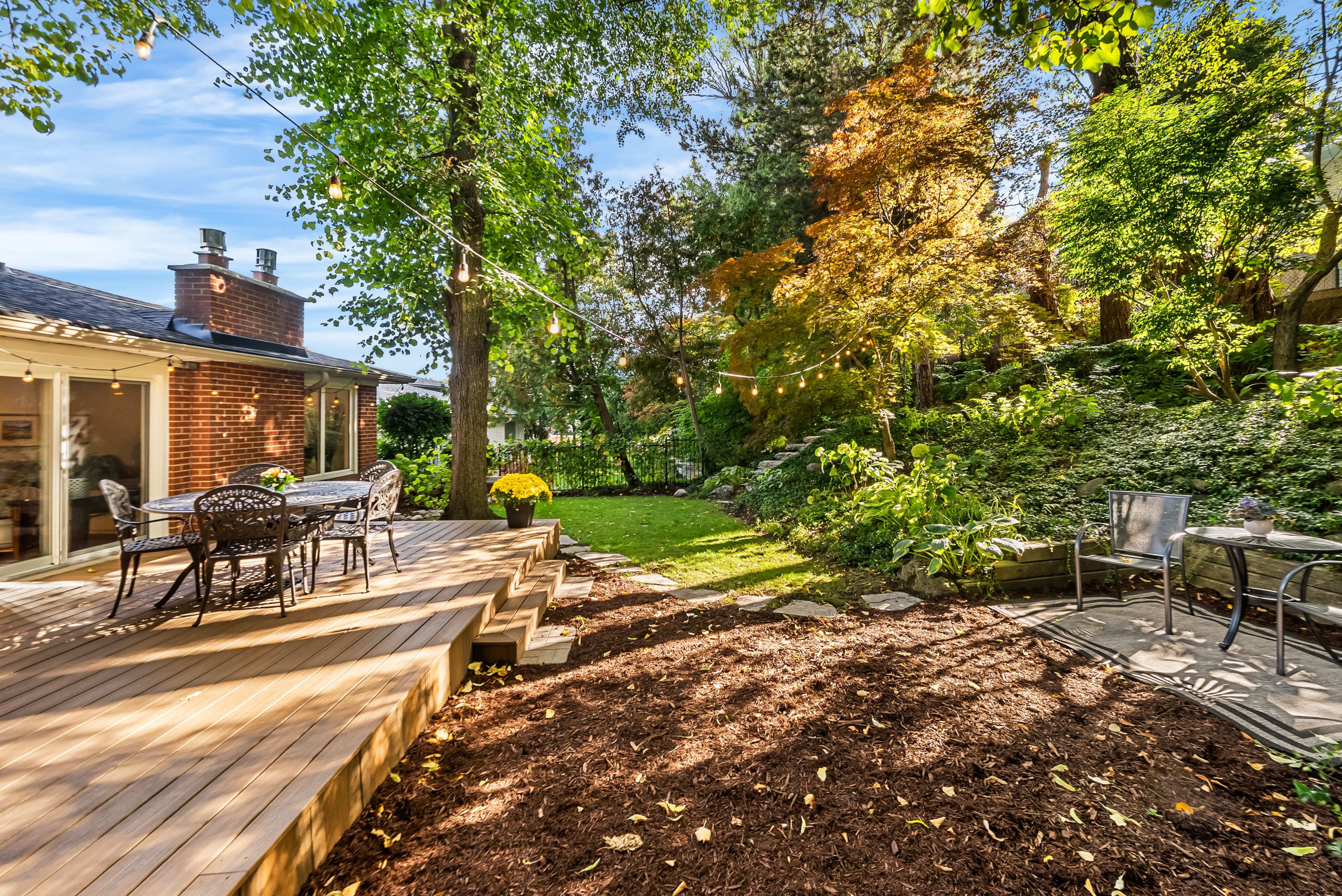 • Private backyard oasis with Trex deck, mature trees, and perennial gardens.