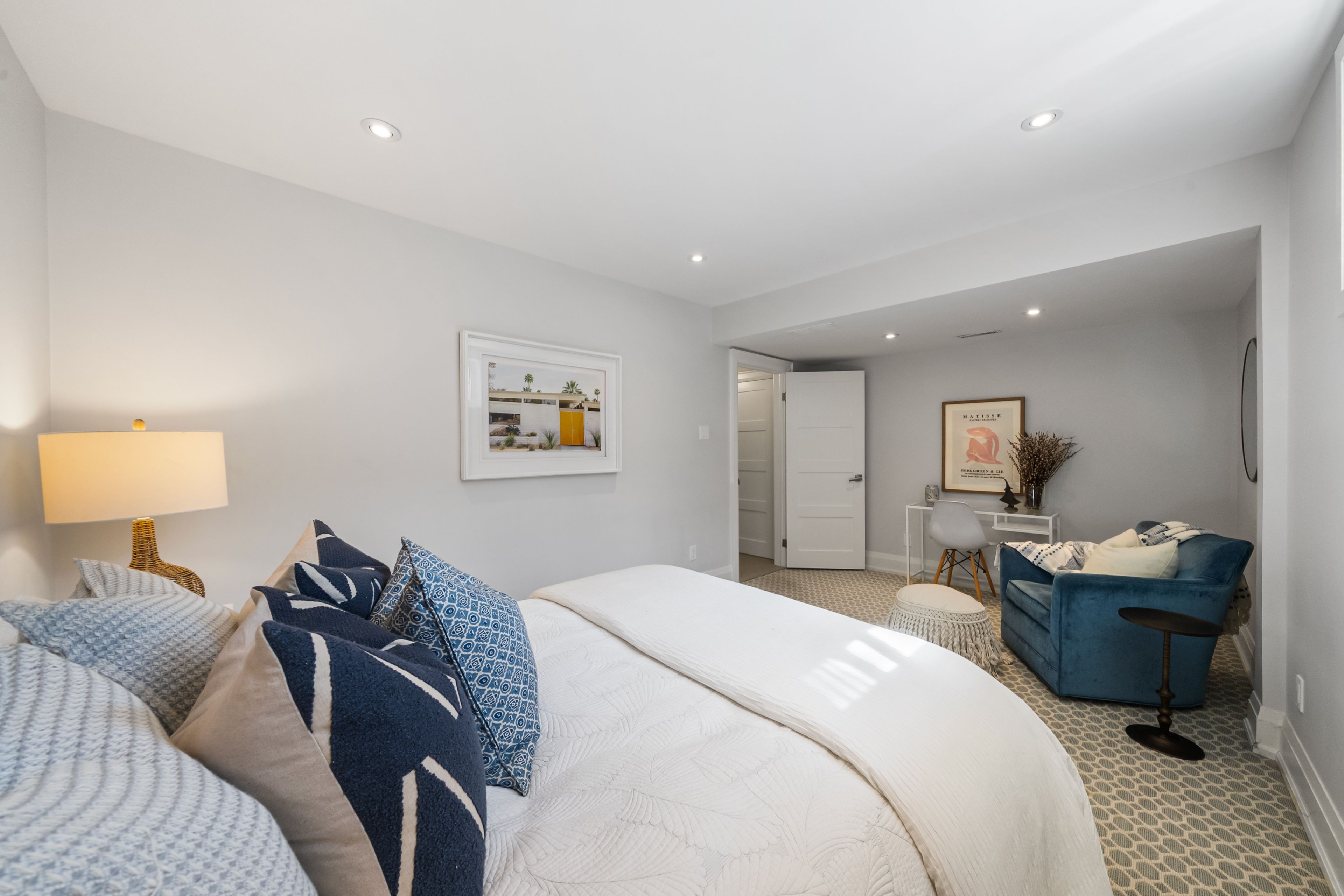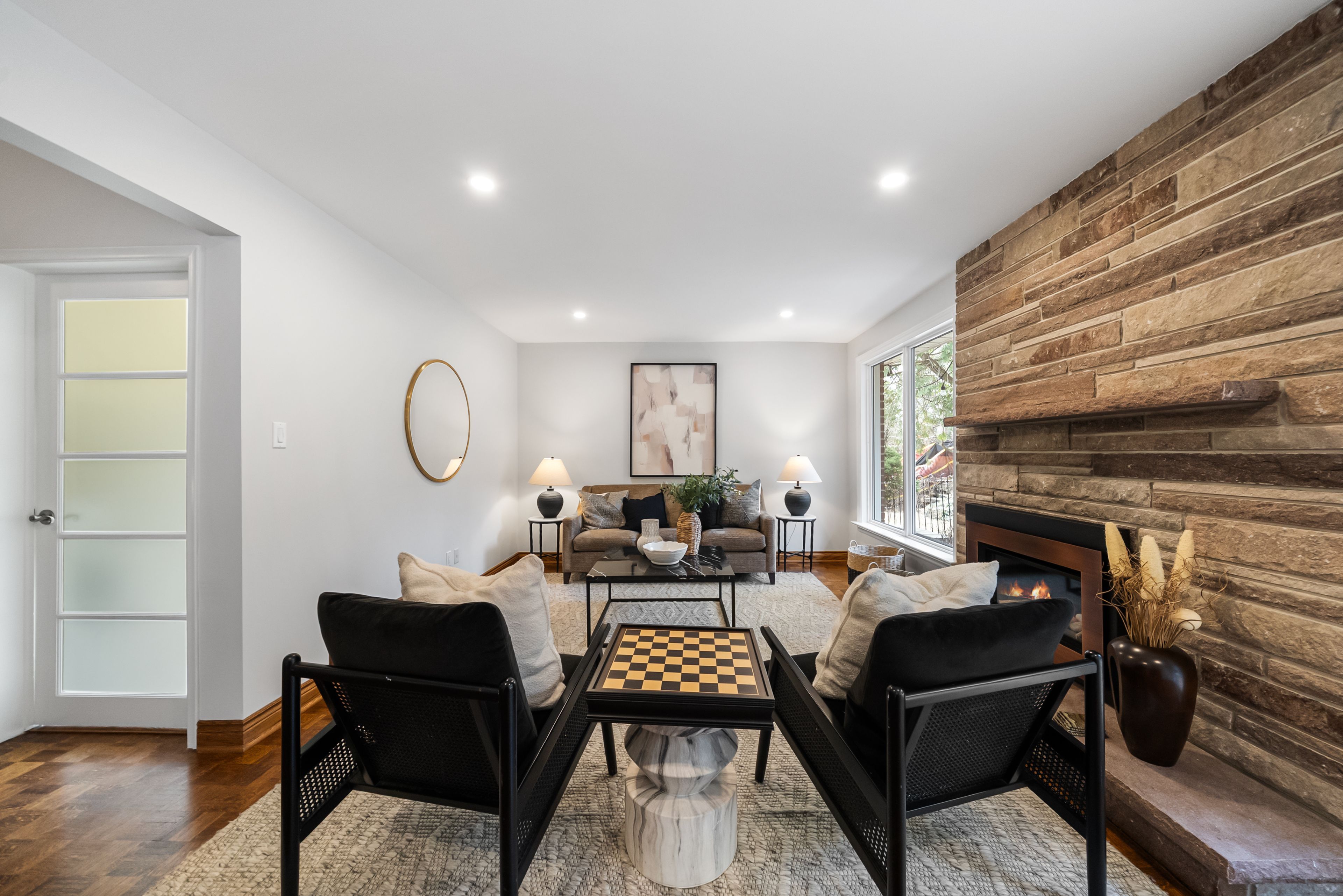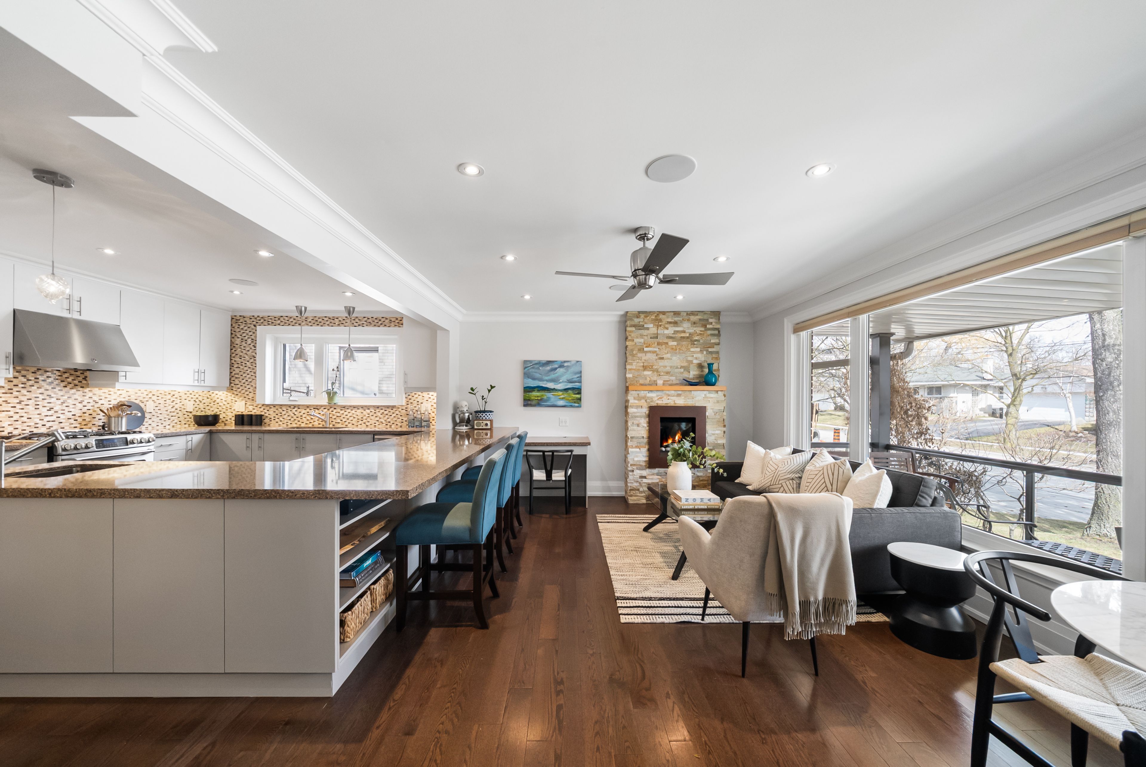 • Bright living room with gas fireplace and built-in speakers for ambiance.