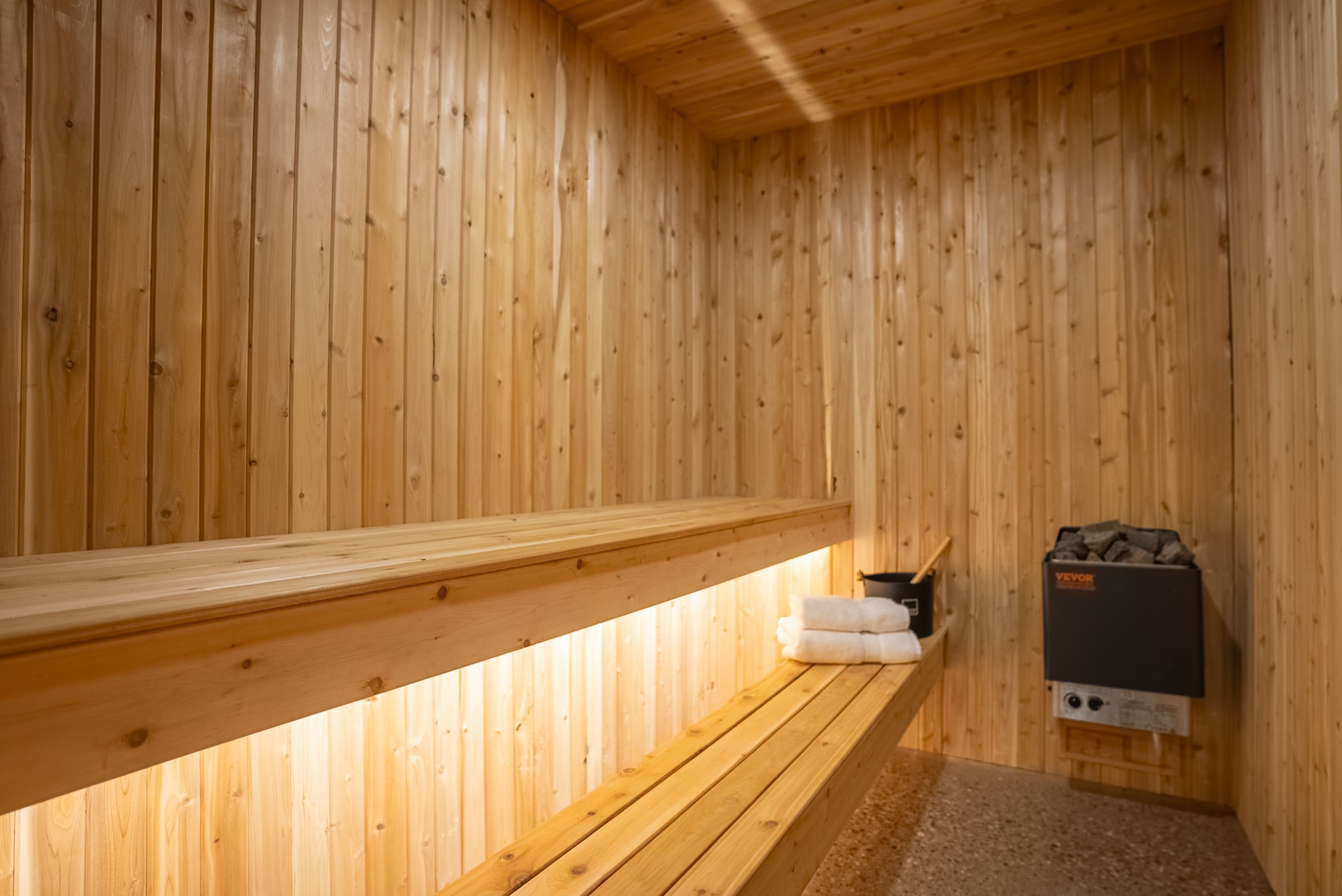 • Finished lower level includes a gym, sauna, and golf simulator.