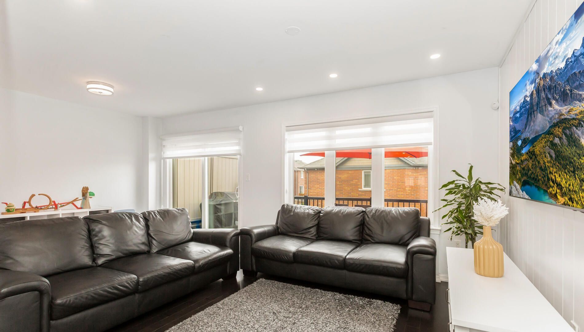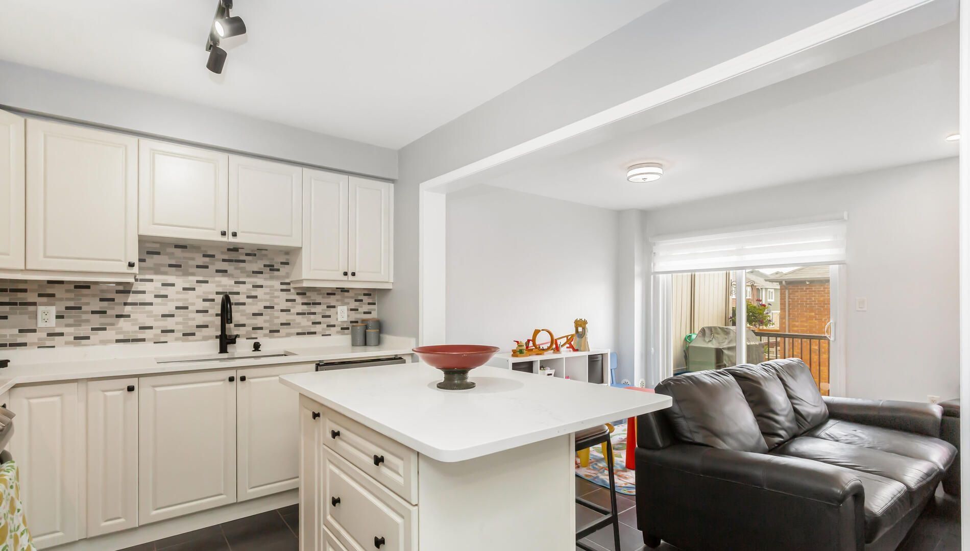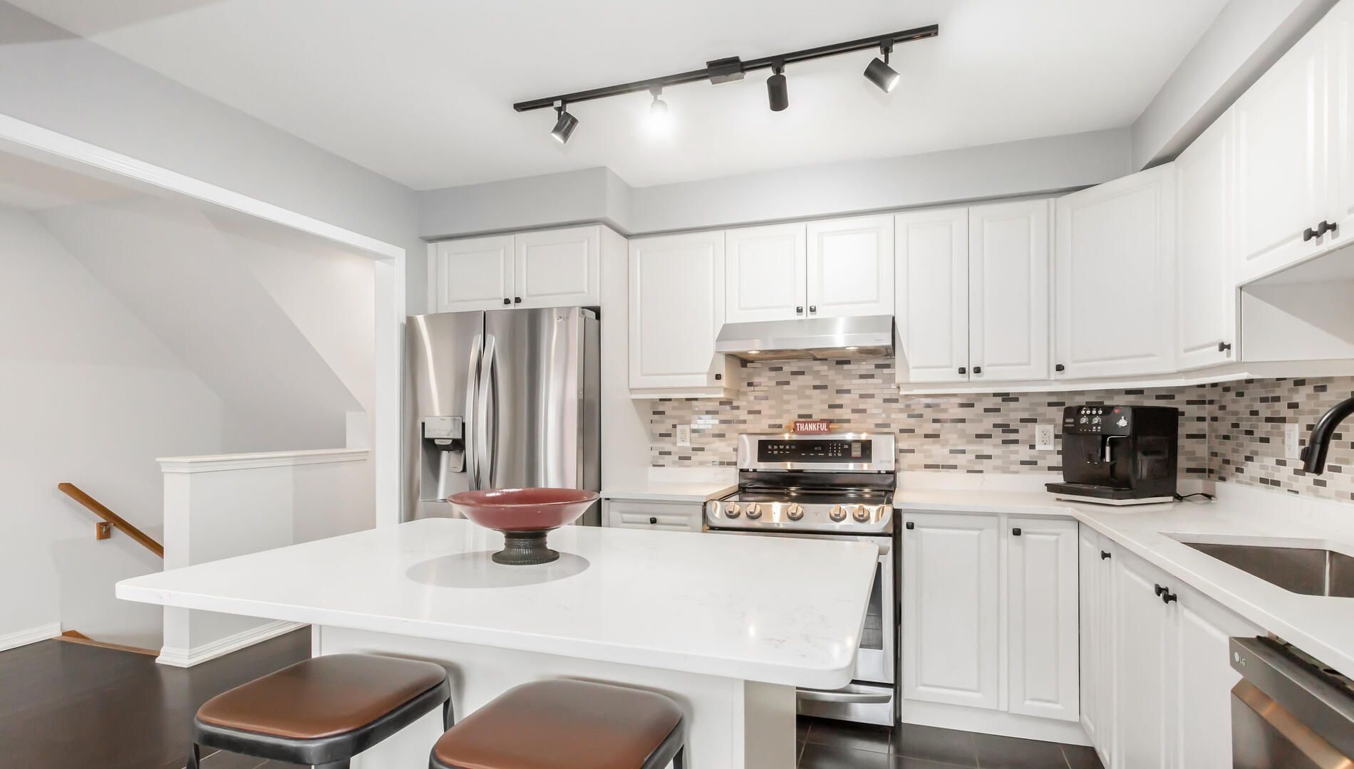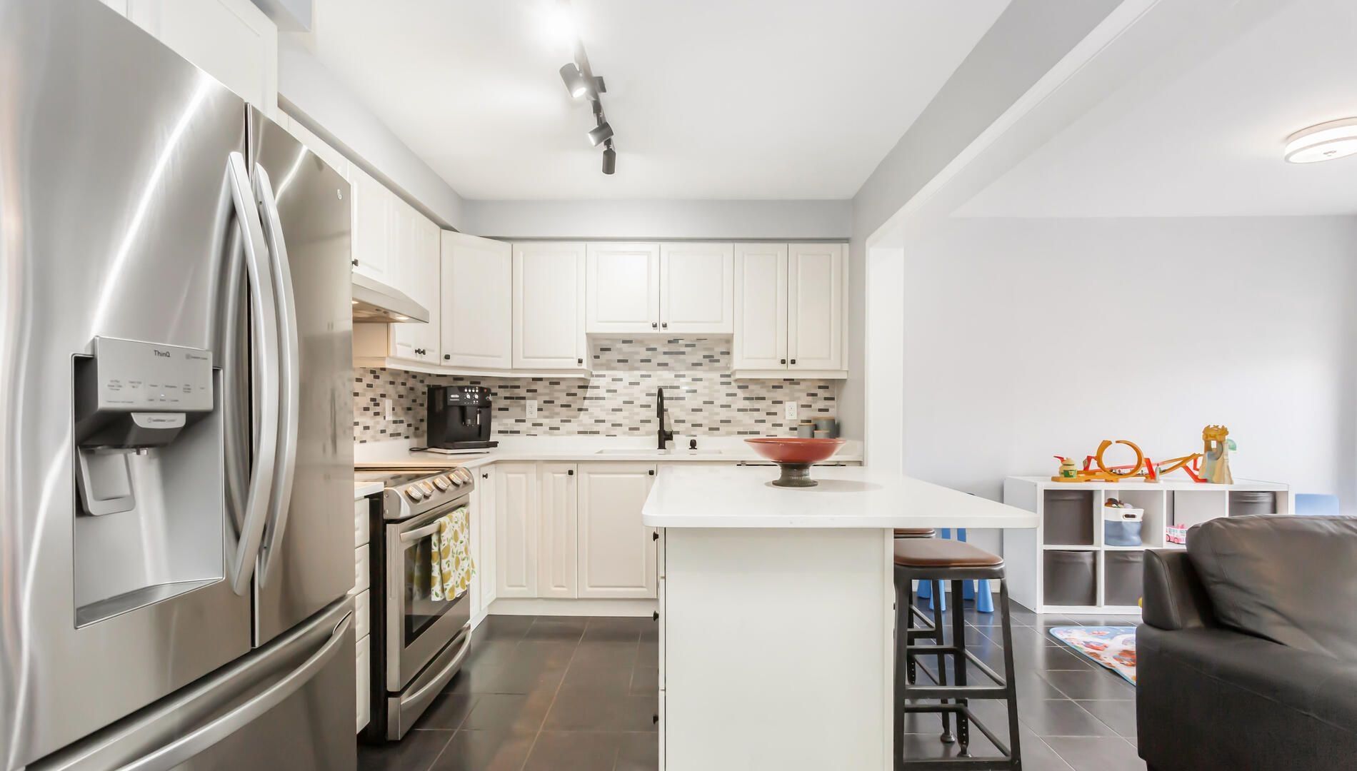 Stunning freehold urban townhouse, meticulously maintained and ideally located near public transit, the go station, and places of worship. The main level features a spacious bedroom with a full bathroom, perfect for a home office, guest suite, or additional living space. The heart of the home is the expansive, renovated kitchen, showcasing quartz countertops and a stylish backsplash that adds a modern, elegant touch. The kitchen flows seamlessly into a bright breakfast/dining area with a walk-out to a cedar deck, perfect for outdoor enjoyment. Well maintained with a true move-in ready feel, the home offers tons of storage throughout for everyday practicality. The primary bedroom serves as a peaceful retreat with a large closet providing ample space. The second and third bedrooms on the upper level are well-sized, while the main floor fourth bedroom adds flexibility for a home office, guest room, or additional living space. The updated walk-in mudroom features a built-in bench and added storage, and the conveniently located laundry room includes brand new appliances. With approximately 2,000 sq ft of living space, this home offers exceptional versatility and comfort for families or those seeking extra room. A must see with many updates!