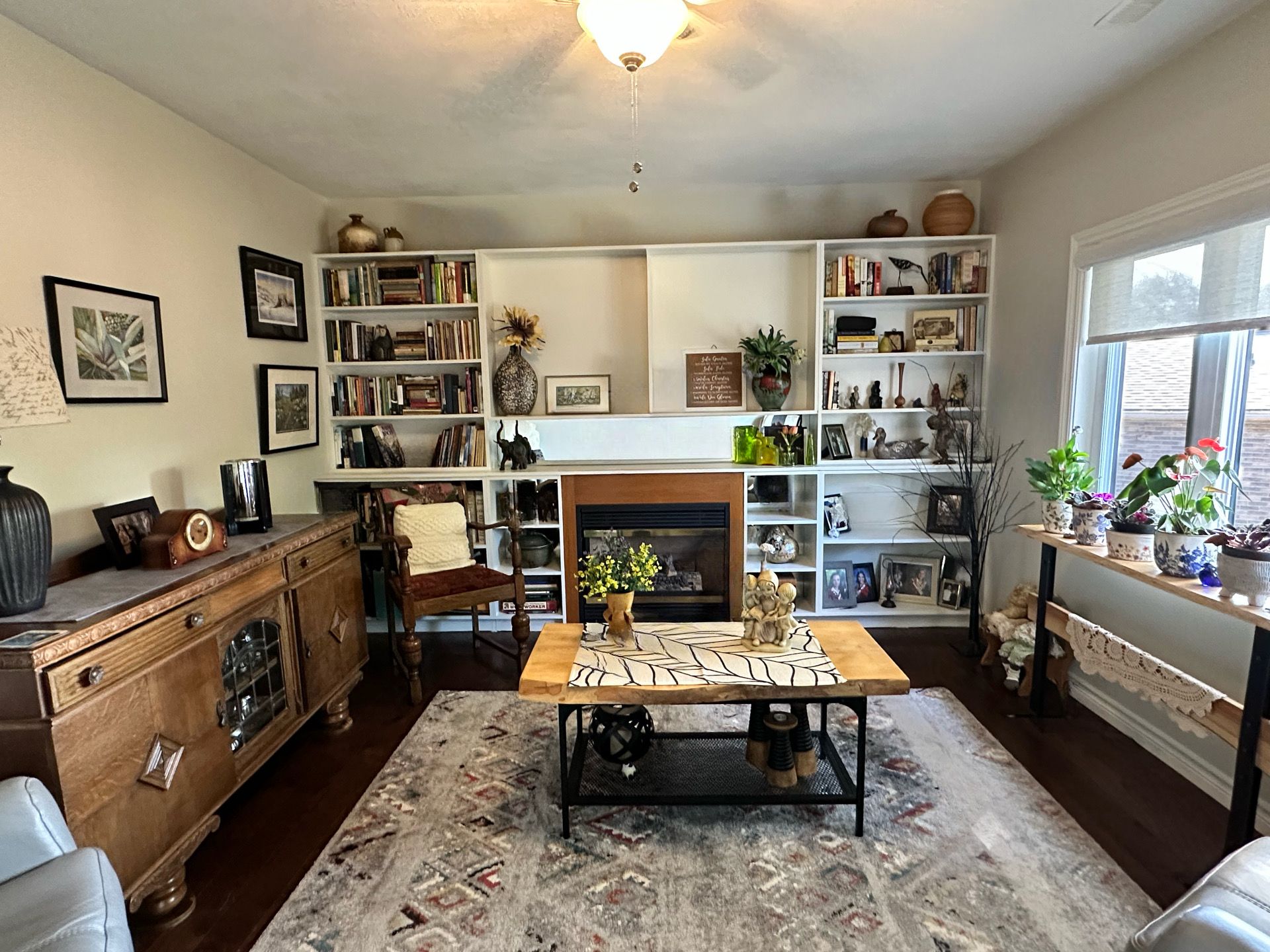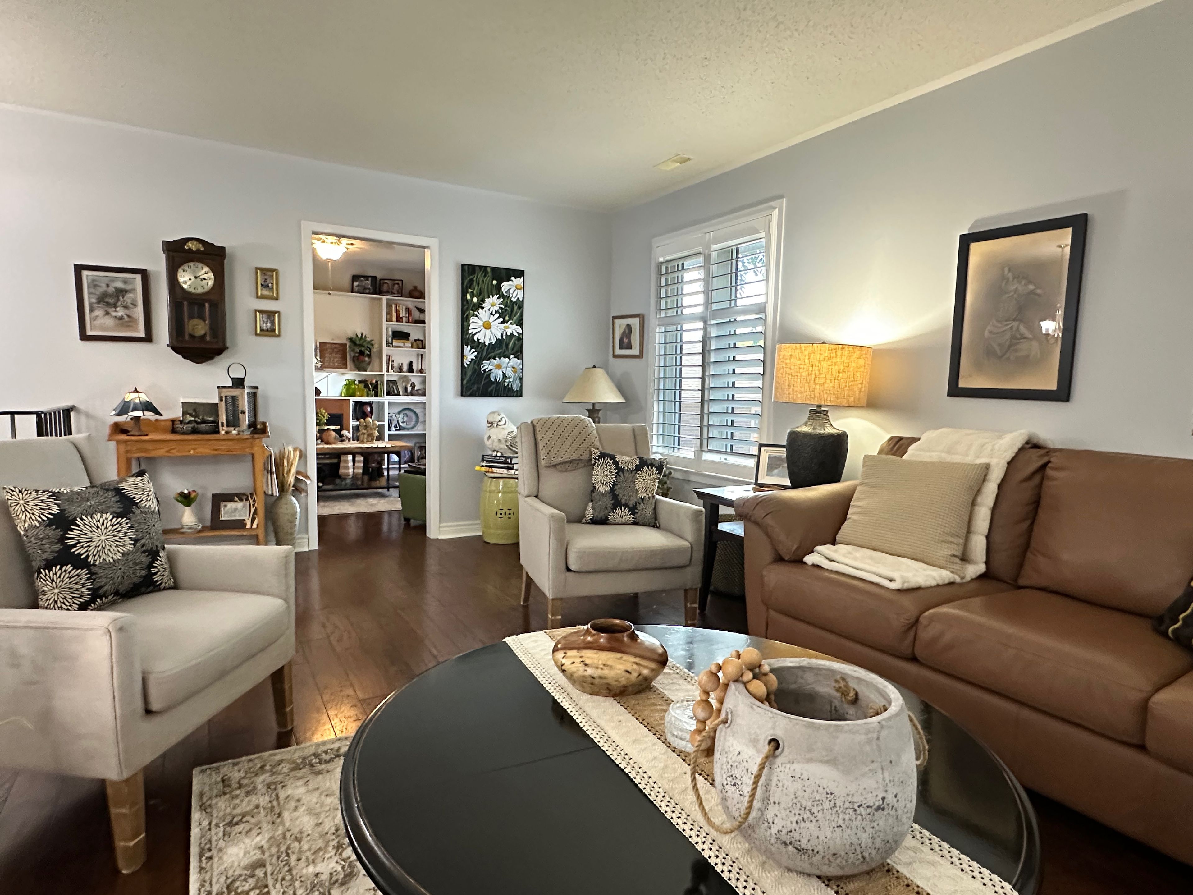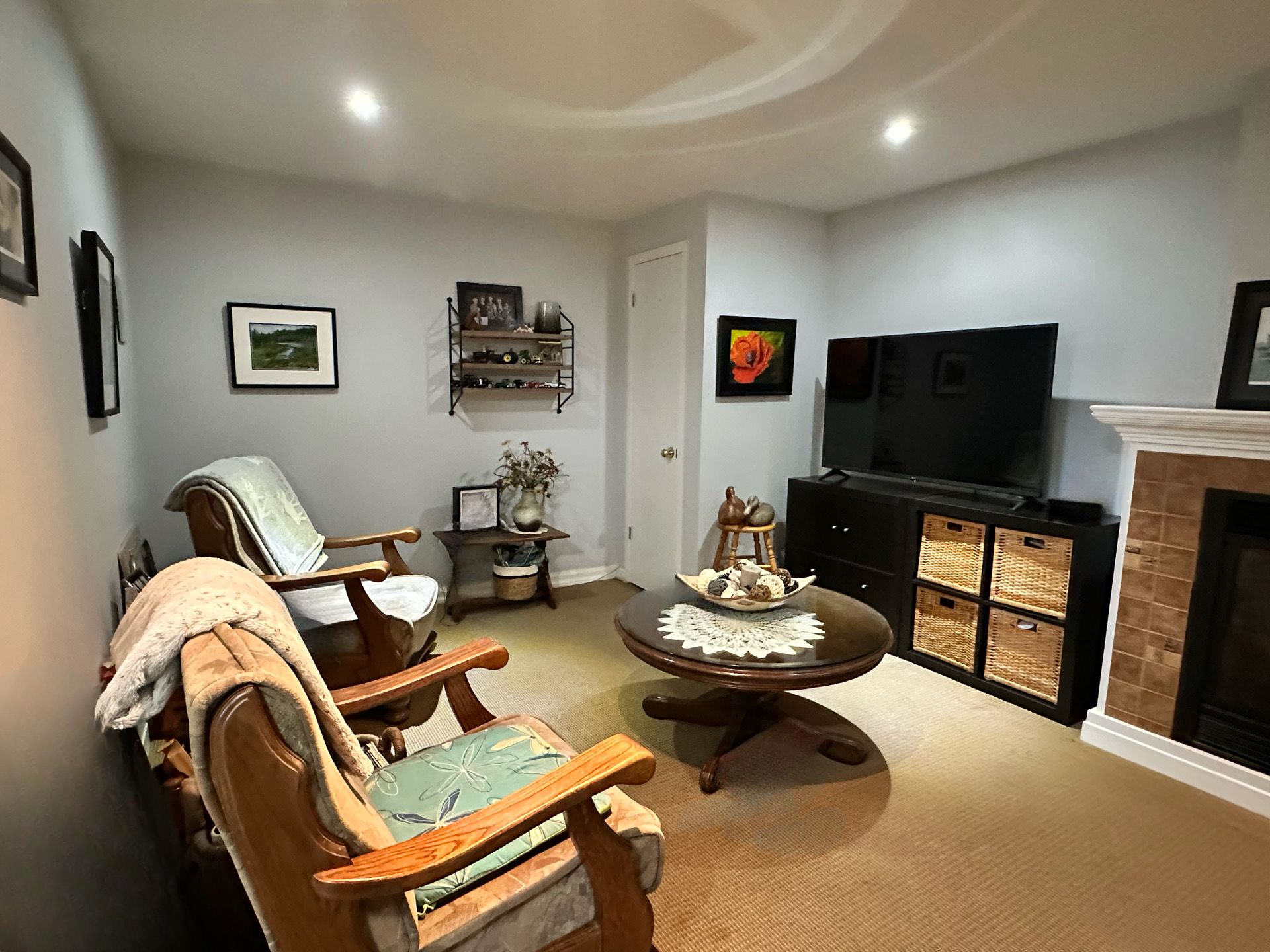 • Living room overlooks a park-like backyard, perfect for relaxation.