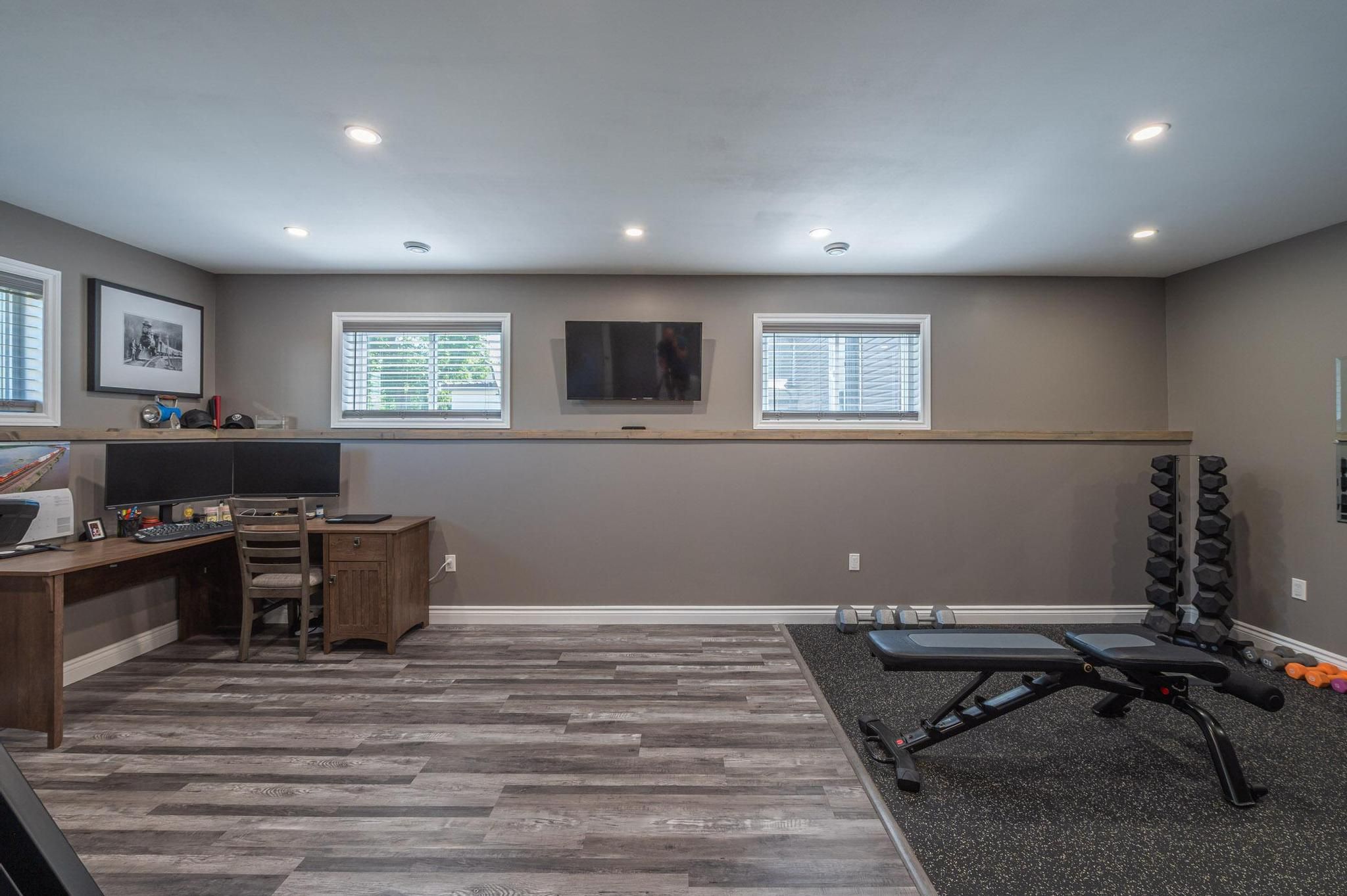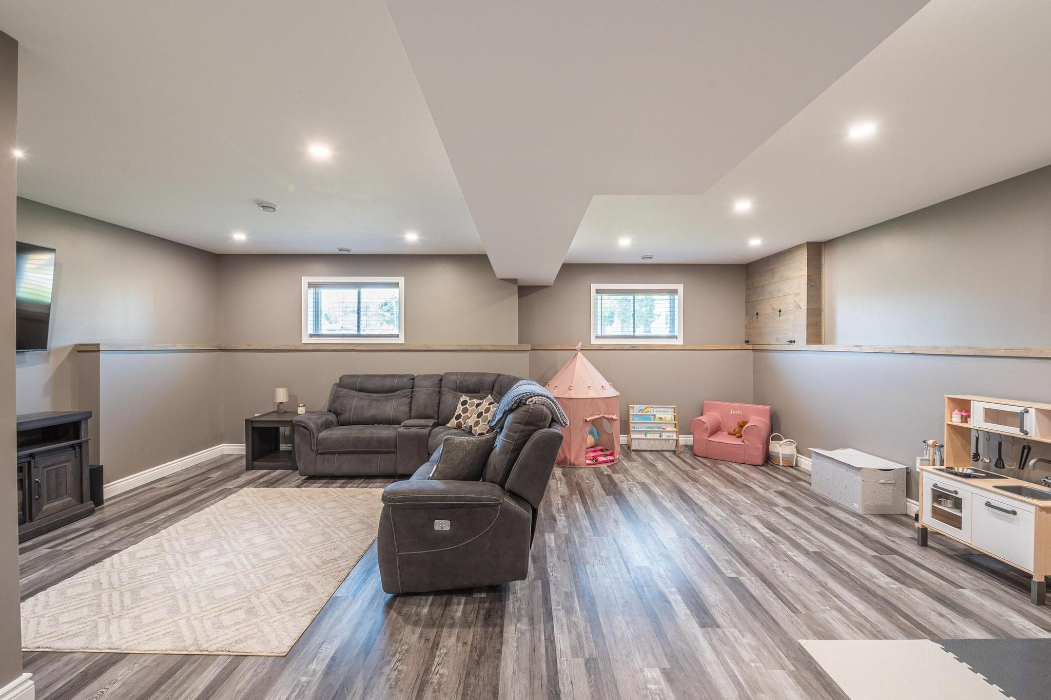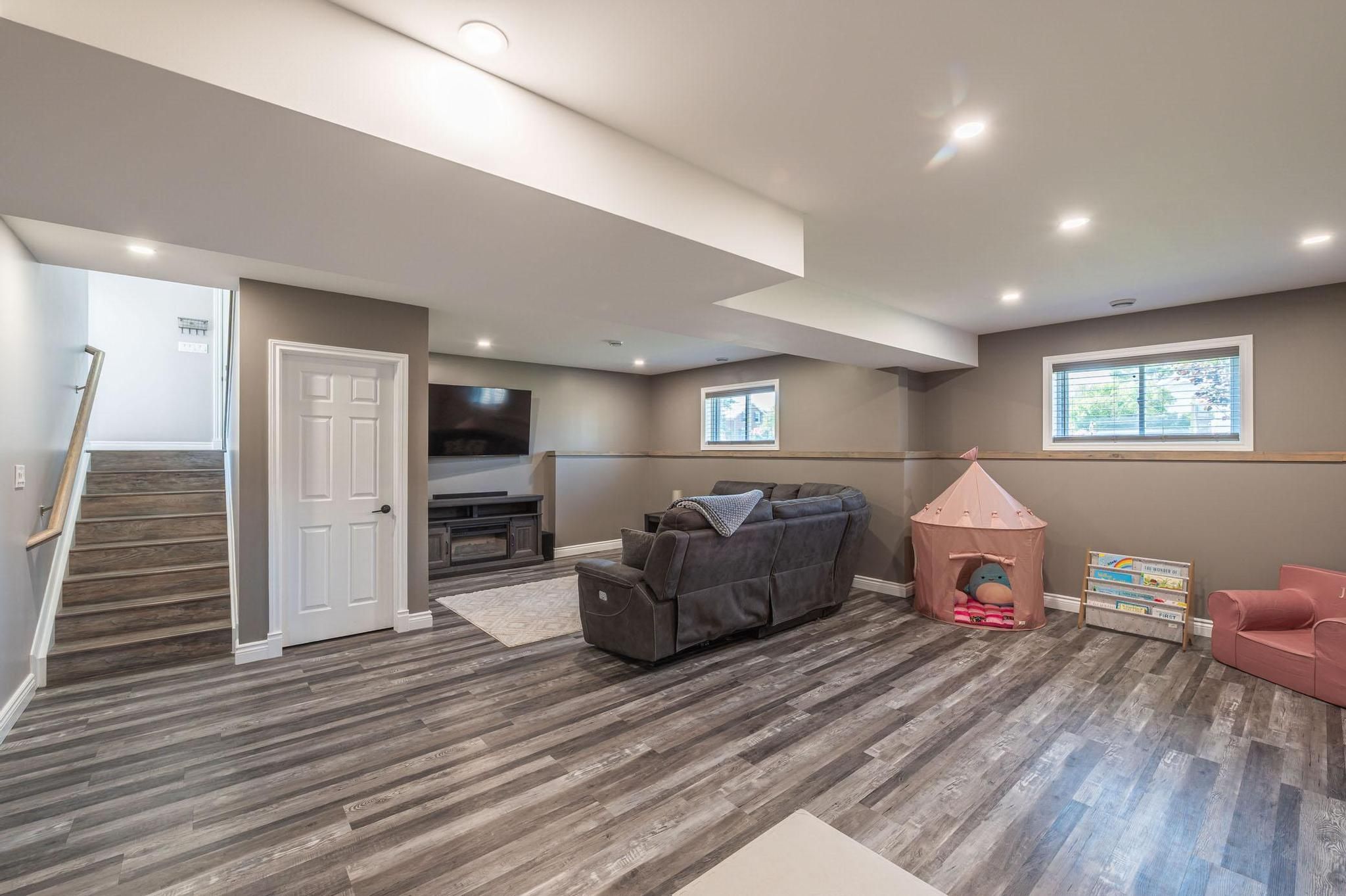 • Finished basement with family room, recreation space, and extra bathroom.