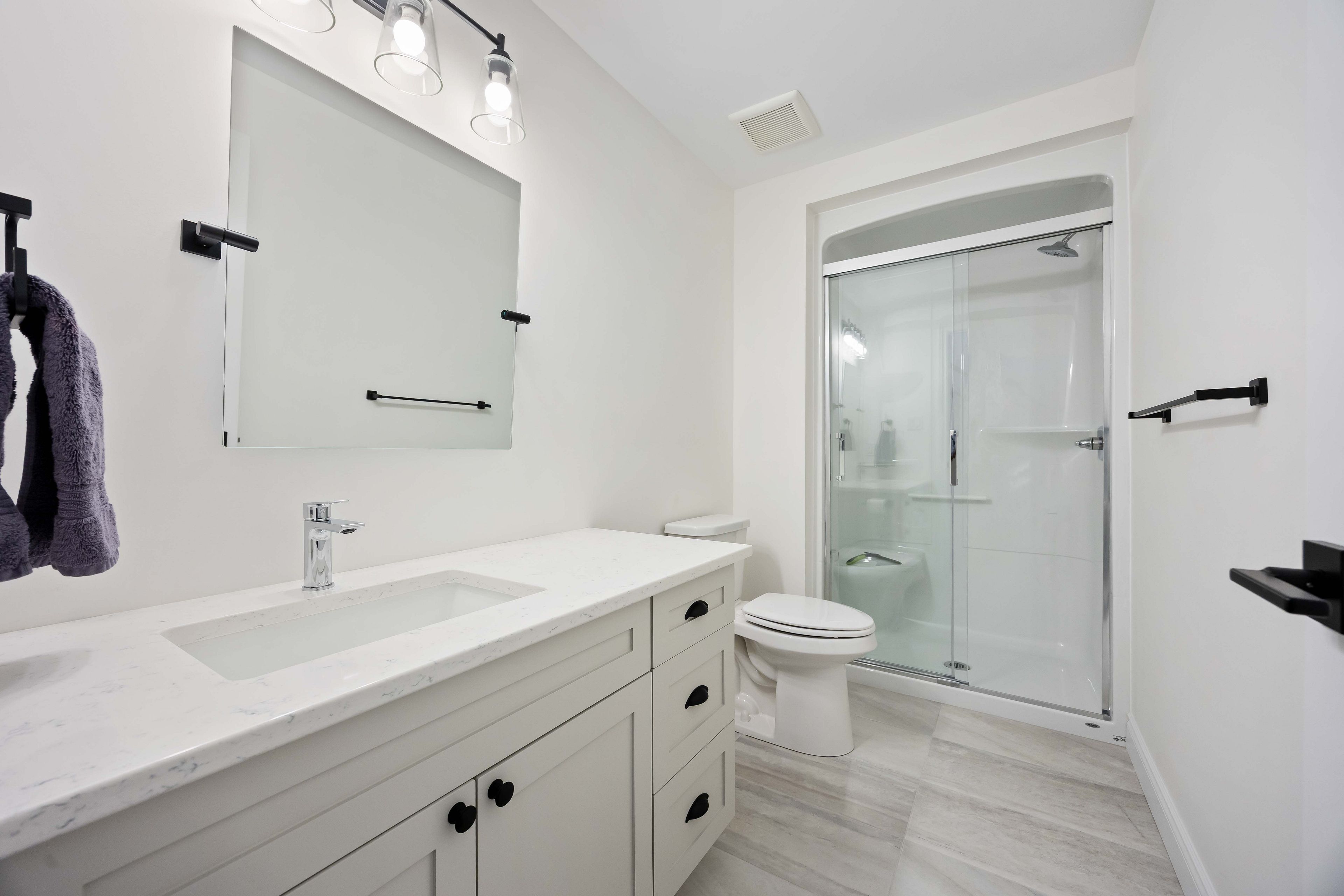 • Stylish kitchen features quartz countertops and a coffee bar for morning routines.