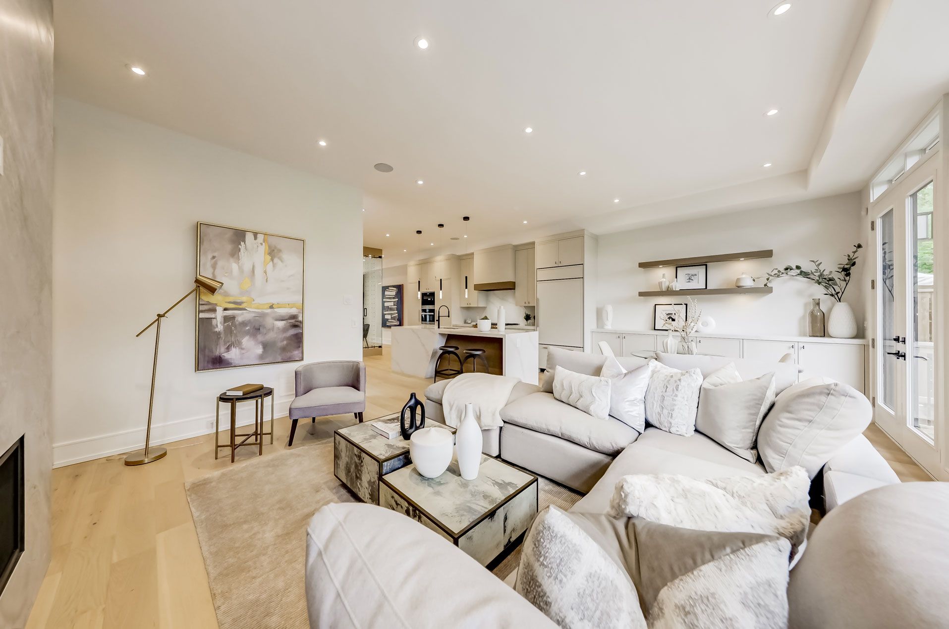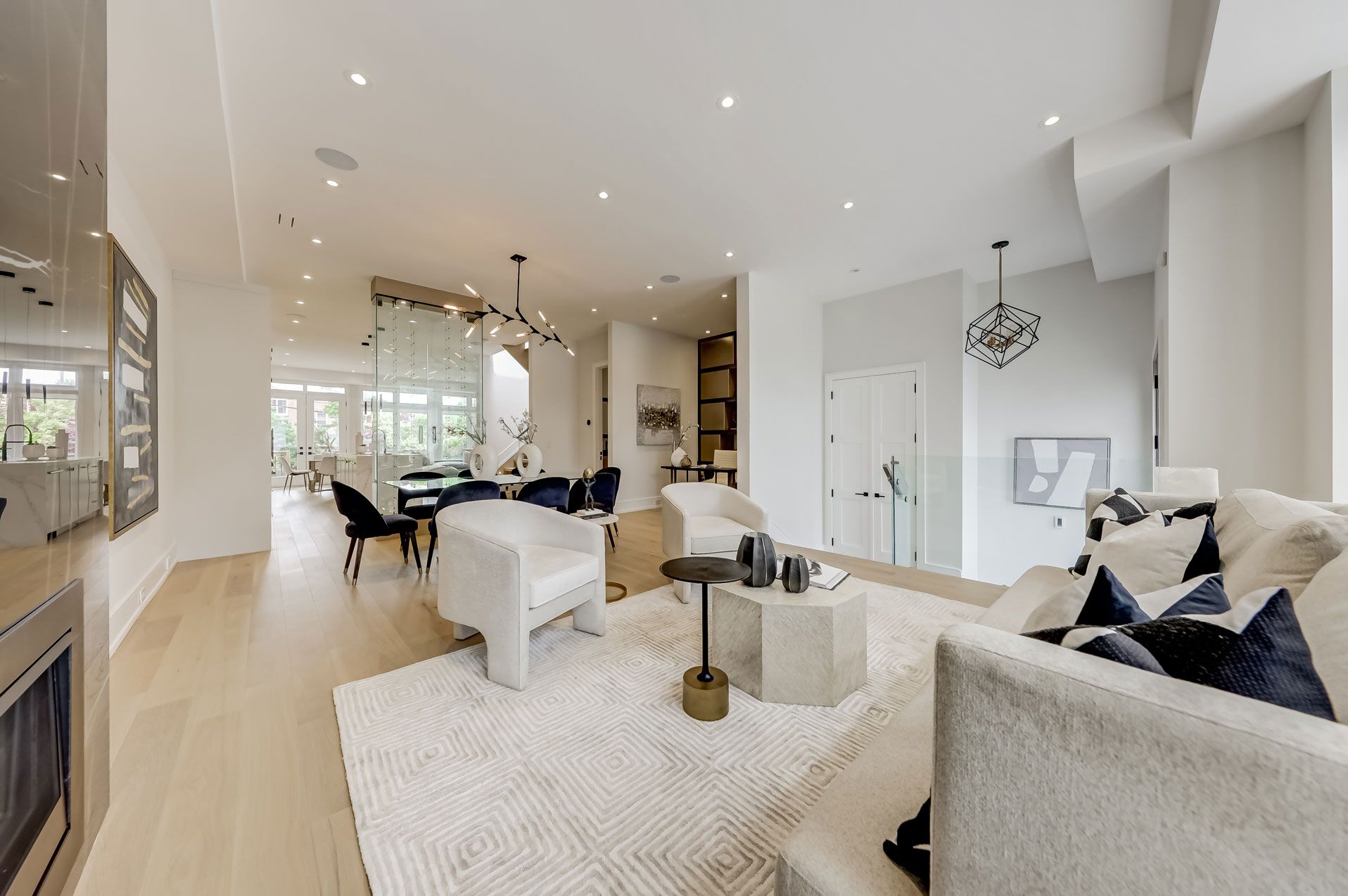 • Open concept living and dining area with a sleek glass wine cabinet.