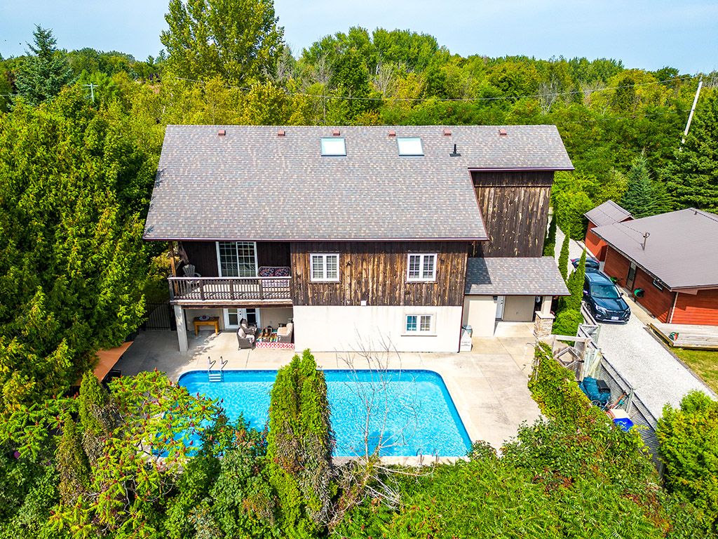 Located on a private lane, this architecturally designed chalet offers refined living within walking distance to blue mountain resort and monterra golf. Situated on a 1/4 acre lot, this property features a private inground pool, spa amenities including a sauna, wet room, and steam shower, with no additional fees. The spacious foyer leads to a gourmet kitchen with quartz countertops and an oversized island. The main level features a primary bedroom with a luxury ensuite and walk-in closet. The great room boasts vaulted ceilings, a stone gas fireplace, and a walkout to a covered deck overlooking the 27' x 40' pool. The side yard provides space for outdoor activities, while the upper level offers 5 additional bedrooms, a 5-piece bathroom, and a sauna. Close to hiking, skiing, and the amenities of blue mountain village, and just minutes from collingwood, this property offers year-round enjoyment.
