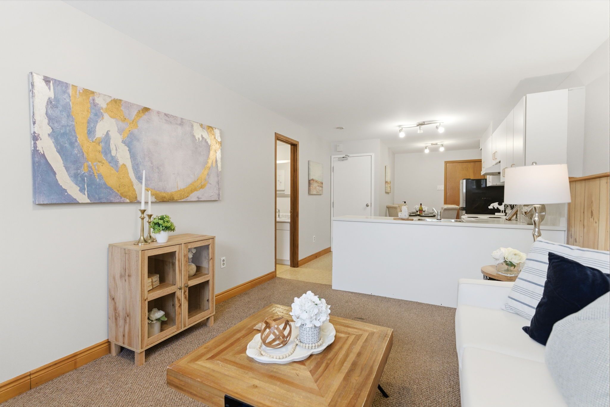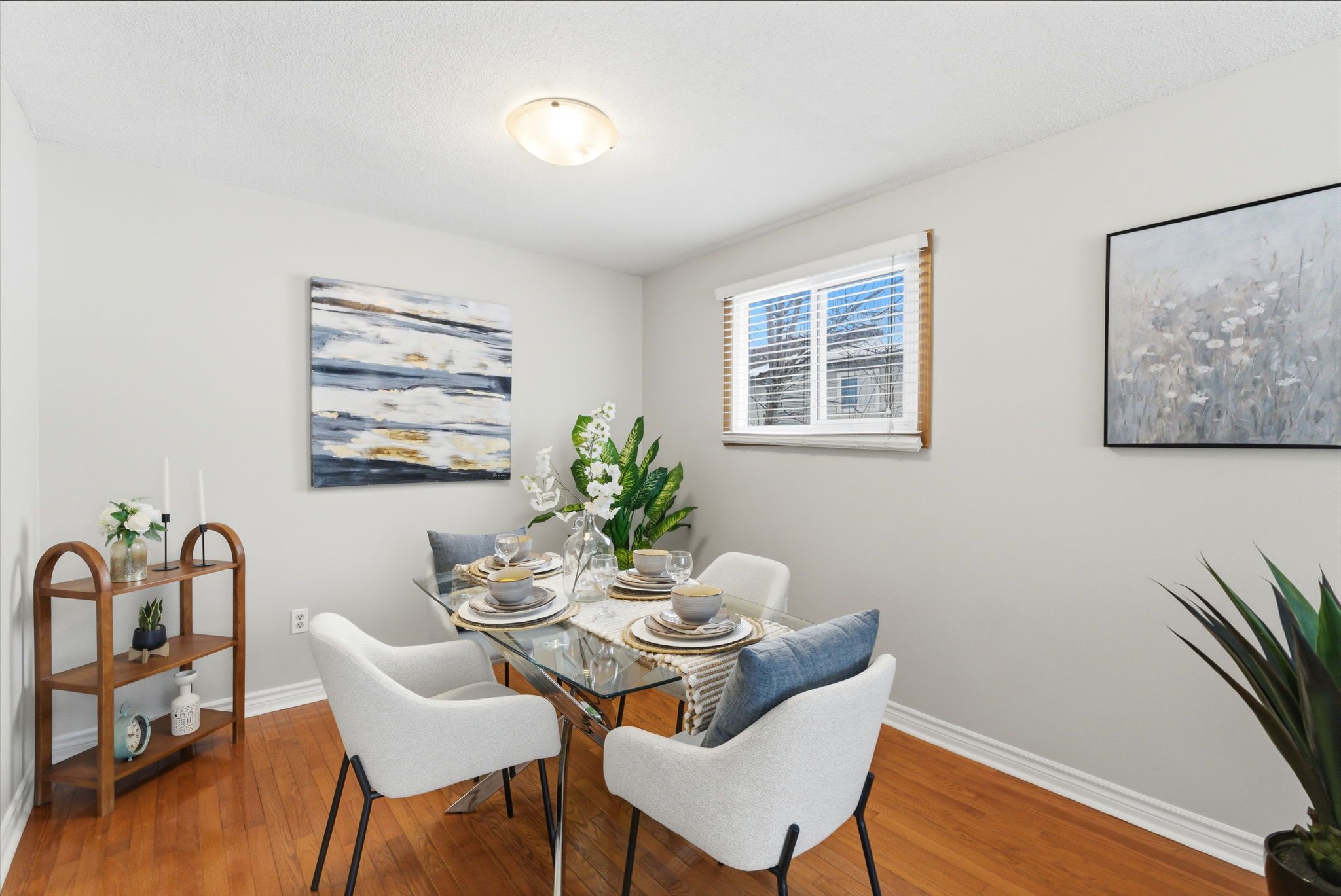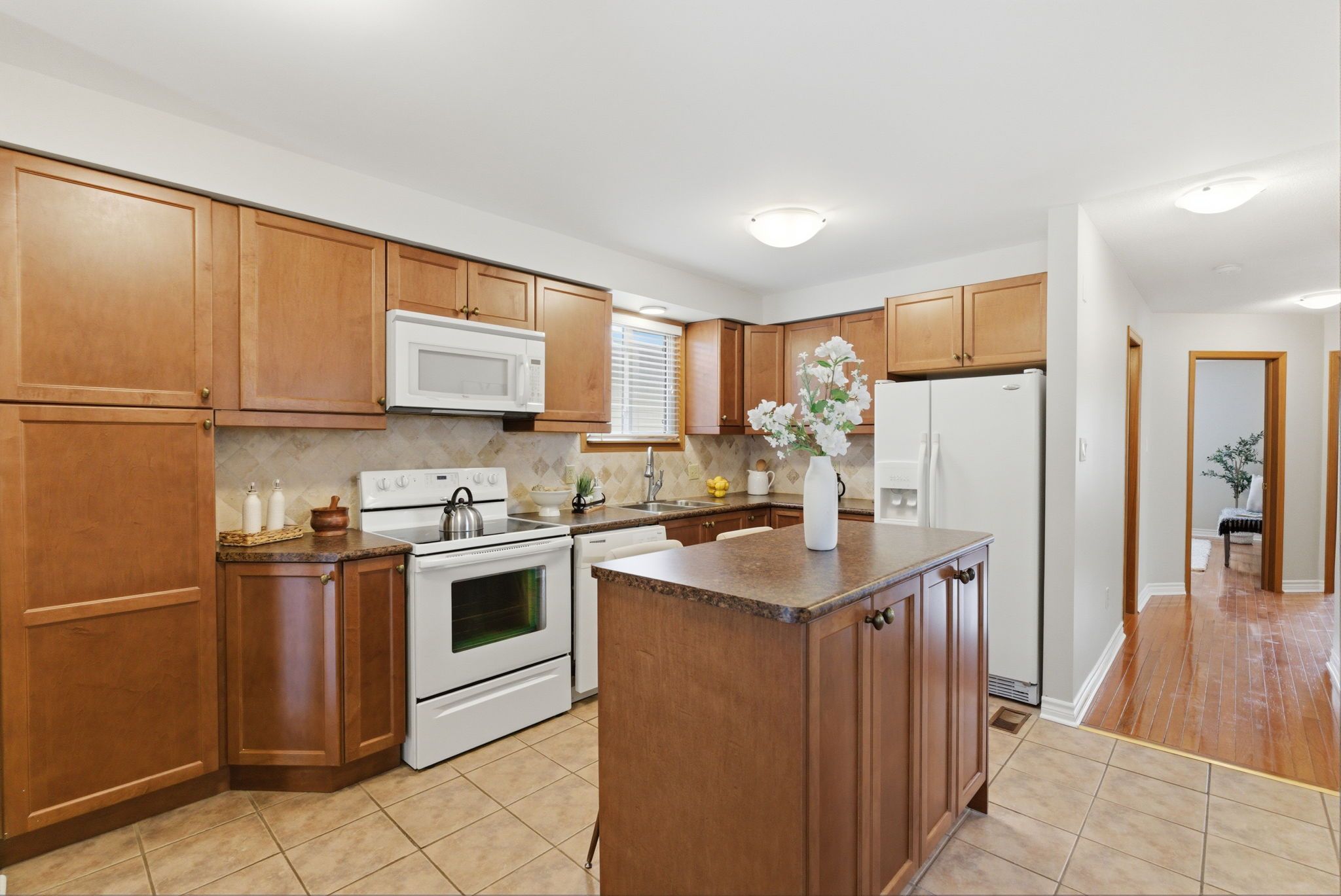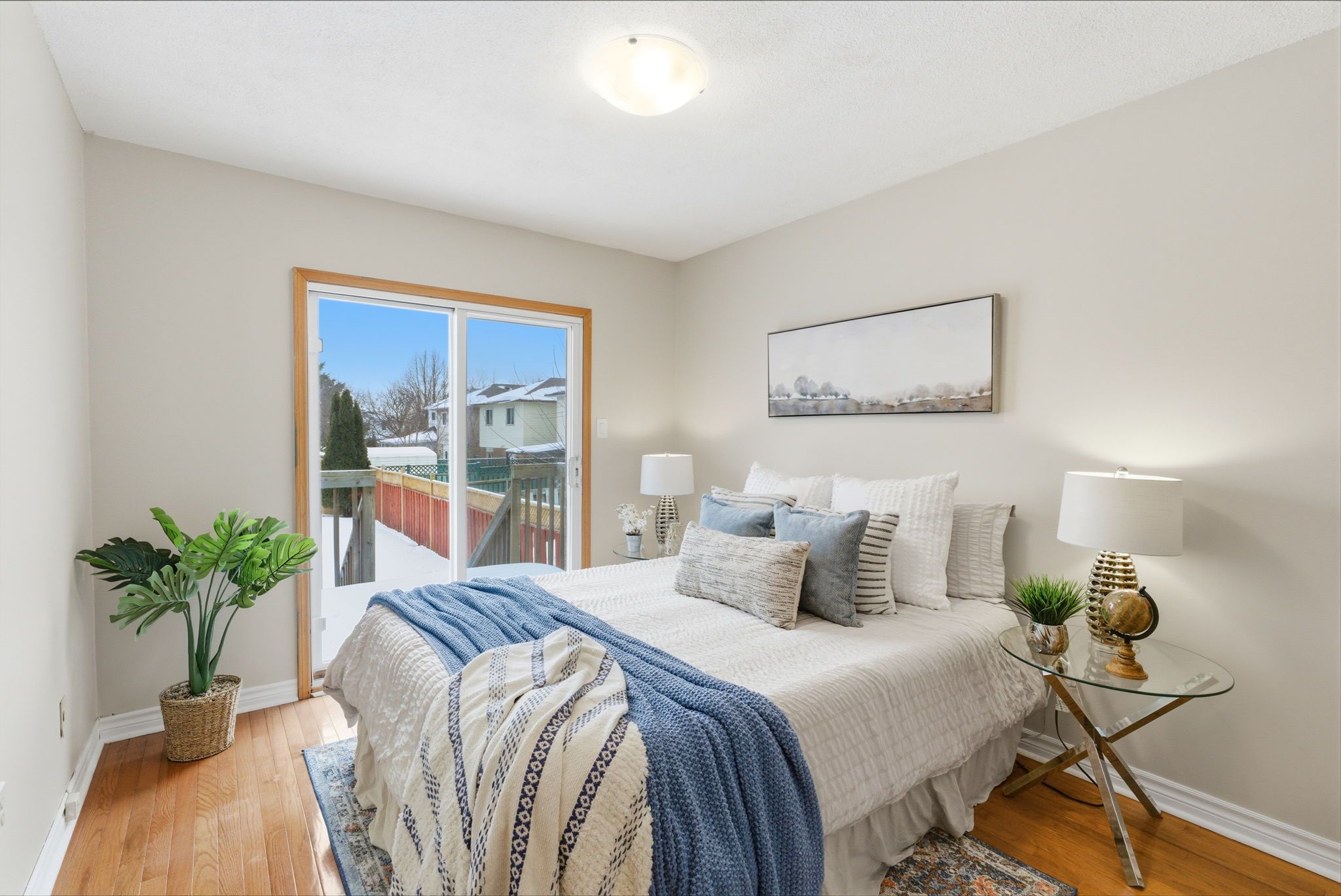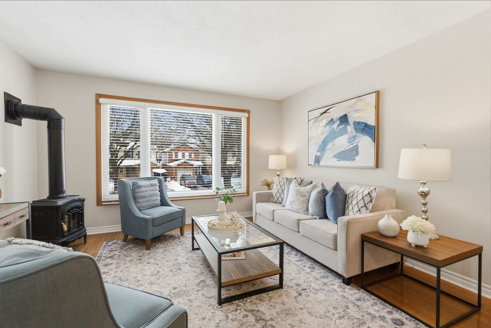• Three spacious bedrooms with hardwood floors and a cozy gas fireplace.