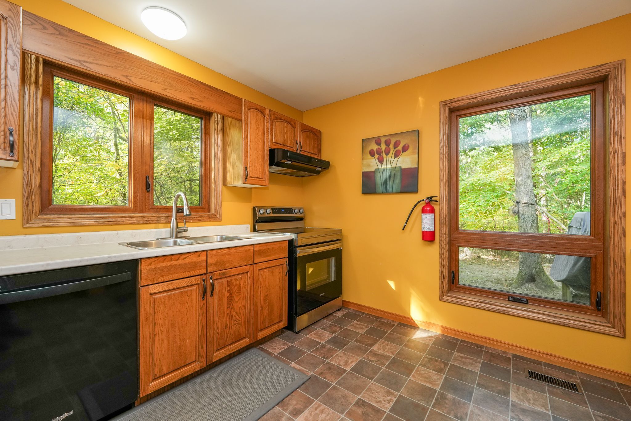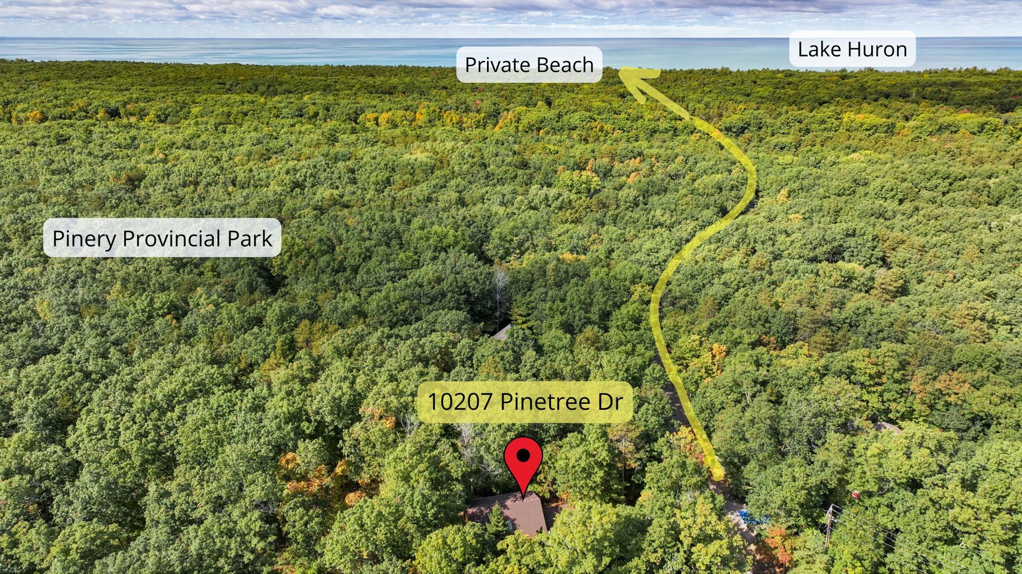 With deeded beach access to a stretch of stunning lake huron beach, a prime location backing onto pinery provincial park, and plenty of room for family and friends, this beautiful home or cottage offers the ultimate lakeside lifestyle. Don't miss your chance to own this incredible property in one of the areas most desirable neighborhoods! Step inside to an inviting, open-concept great room with soaring two-story vaulted ceilings, a cozy wood-burning fireplace and an abundance of natural light that fills the living space. The location of the spacious kitchen offers easy access to the dining area and side yard, perfect for entertaining. The main floor also includes a comfortable bedroom with a cheater two-piece bathroom, ideal for guests. Upstairs, you'll find three additional spacious bedrooms and a full bathroom, providing ample space for the whole family. The finished lower level offers even more living space, with a walkout to the rear yard from the large recreation room area that includes a wet bar, workout room or office space, and a full custom bathroom. A screened-in patio at the side of the house is perfect for relaxing or dining while you take in the peaceful view of the woods. The large . 75 acre treed lot has tons of potential for further development if desired. Huron woods has so much more to offer, including access to an incredible clubhouse, tennis / pickleball courts, playground and canoe storage along the old ausable river channel. This is more than just a home or cottage; it's an invitation to experience the unparalleled beauty and recreational opportunities that huron woods and pinery provincial park have to offer. Shopping, restaurants, marinas, golf courses, wineries, breweries and more are all just a short drive away.