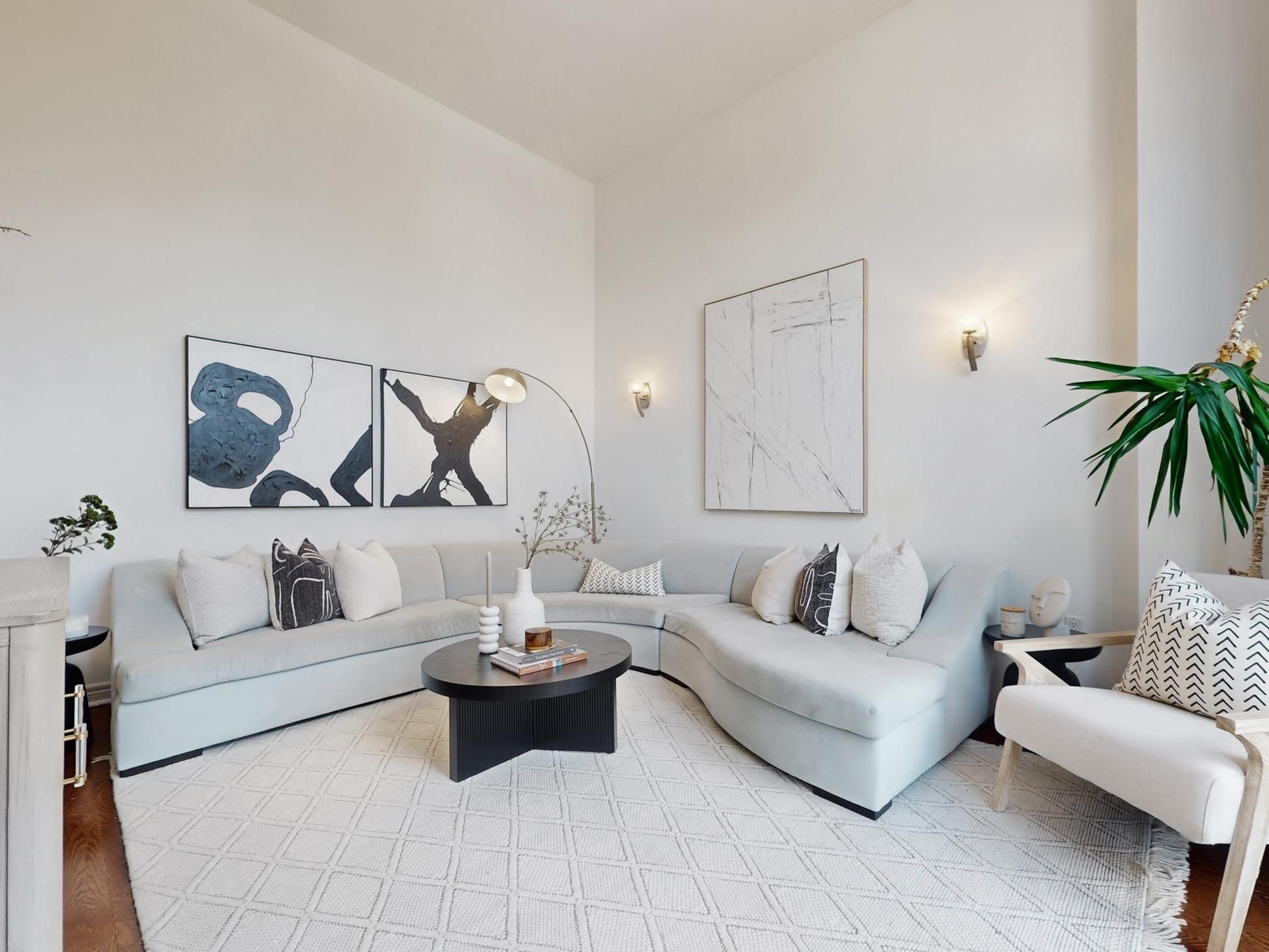 • Expansive family room with 12+ ft ceilings and private balcony.