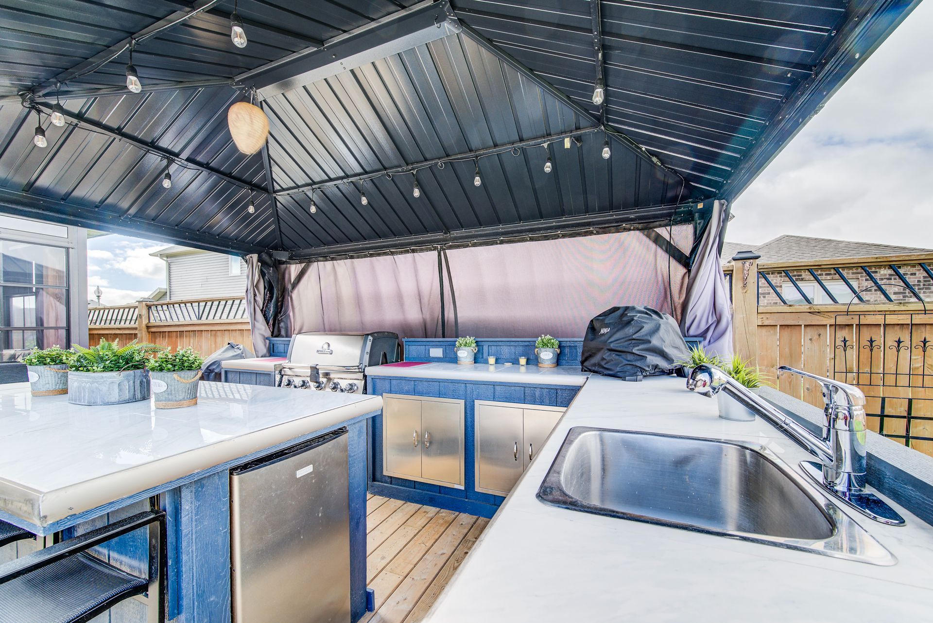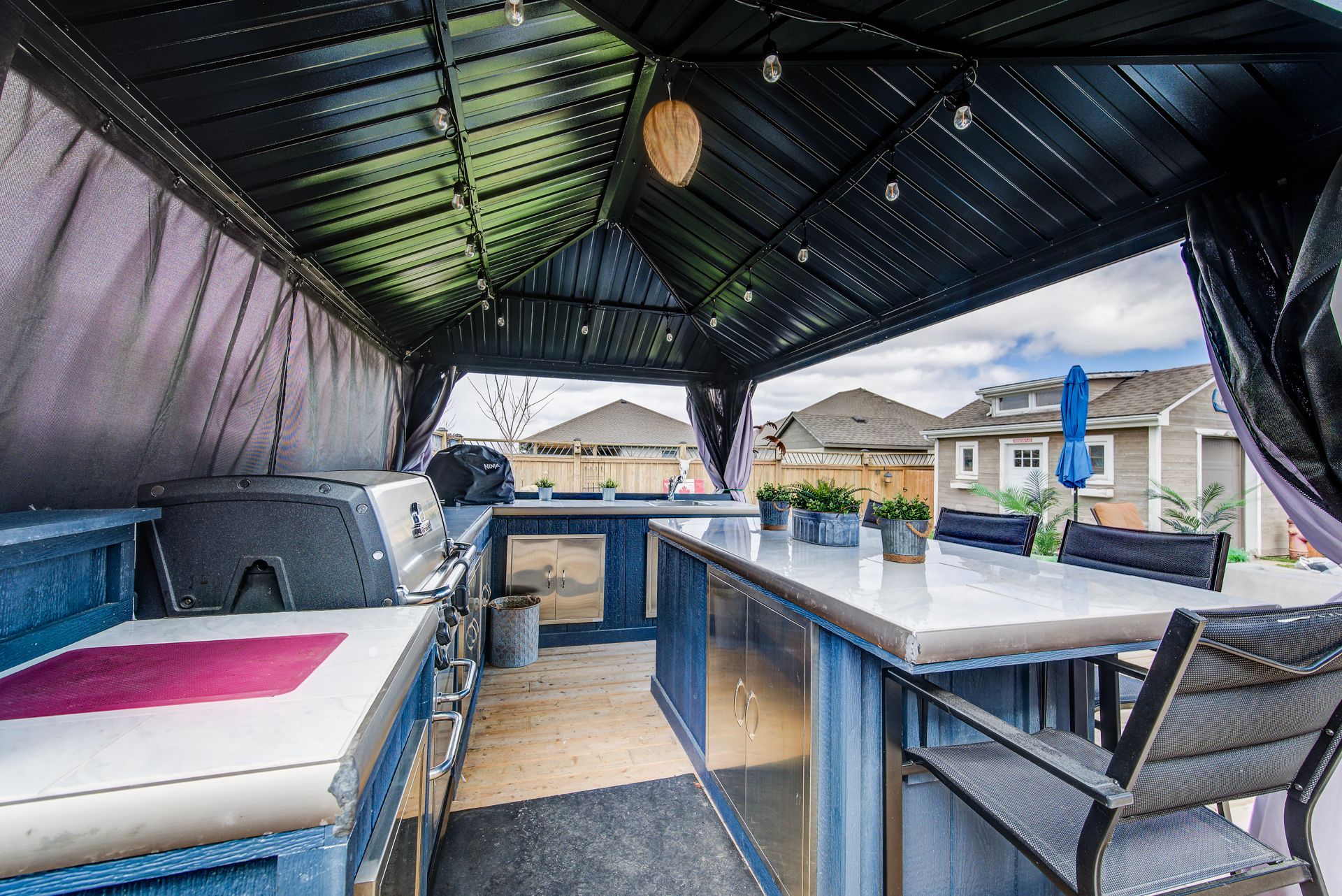 • Fully equipped outdoor kitchen and dining island in a gazebo.