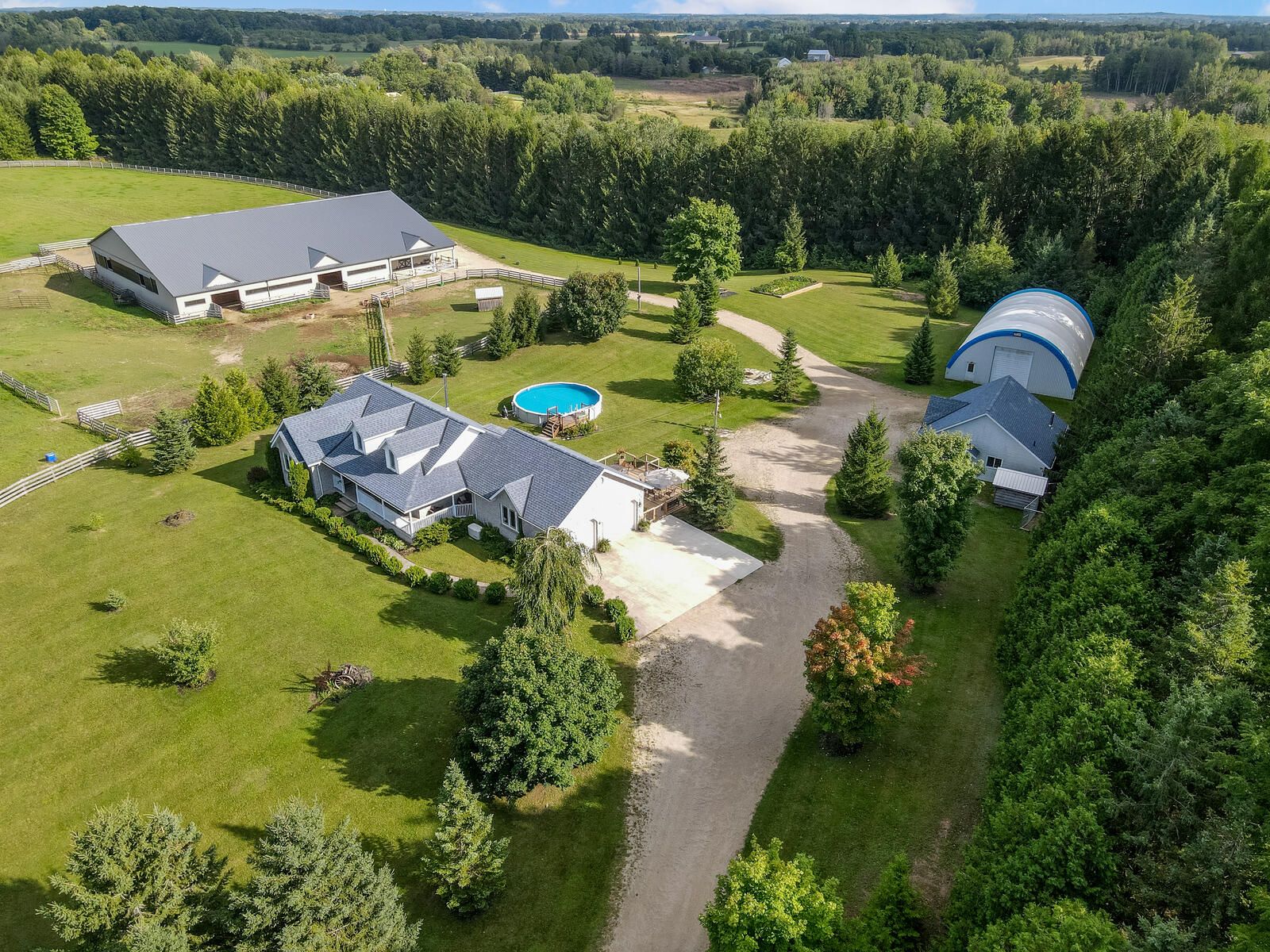 This exceptional property is situated on 25 rolling acres and features an all brick bungalow built in 2002 that has been beautifully updated and maintained throughout. The main floor features 2 master bedrooms both with walk-in cosets and ensuite baths with heated floors. Large living room with hardwood floors, cathedral ceiling and walk-out to decks, separate formal dining room and lovely eat-in kitchen with built-in appliances, lots of cupboards and granite countertops. Main floor laundry with w/o to garage and newer deck and a 2pc bath. The lower level offers 2 more bedrooms, 3 pc bath, a huge family room with wood burning fireplace and walk-out to patio and above-ground pool. Lots of storage, 2 cold cellars, office and staircase to garage. Attached double car garage with access to the house and a separate 2 car garage/workshop for all your toys and equipment. 60 x 40 coverall perfect for any of storage. Sixteen kilo watt power generac propane generator is included. Zoning is a2 which allows for several permitted uses. Please see the attached list of uses. **extras** four year old 36 x 40 barn w/ 4 box stalls & tackroom. Attached 80 x 100 indoor arena and also an attached 36 x 40 hay storage area with 2 huge garage doors. 6 paddocks w/ new oak board fencing. Large run-in area with heated water.