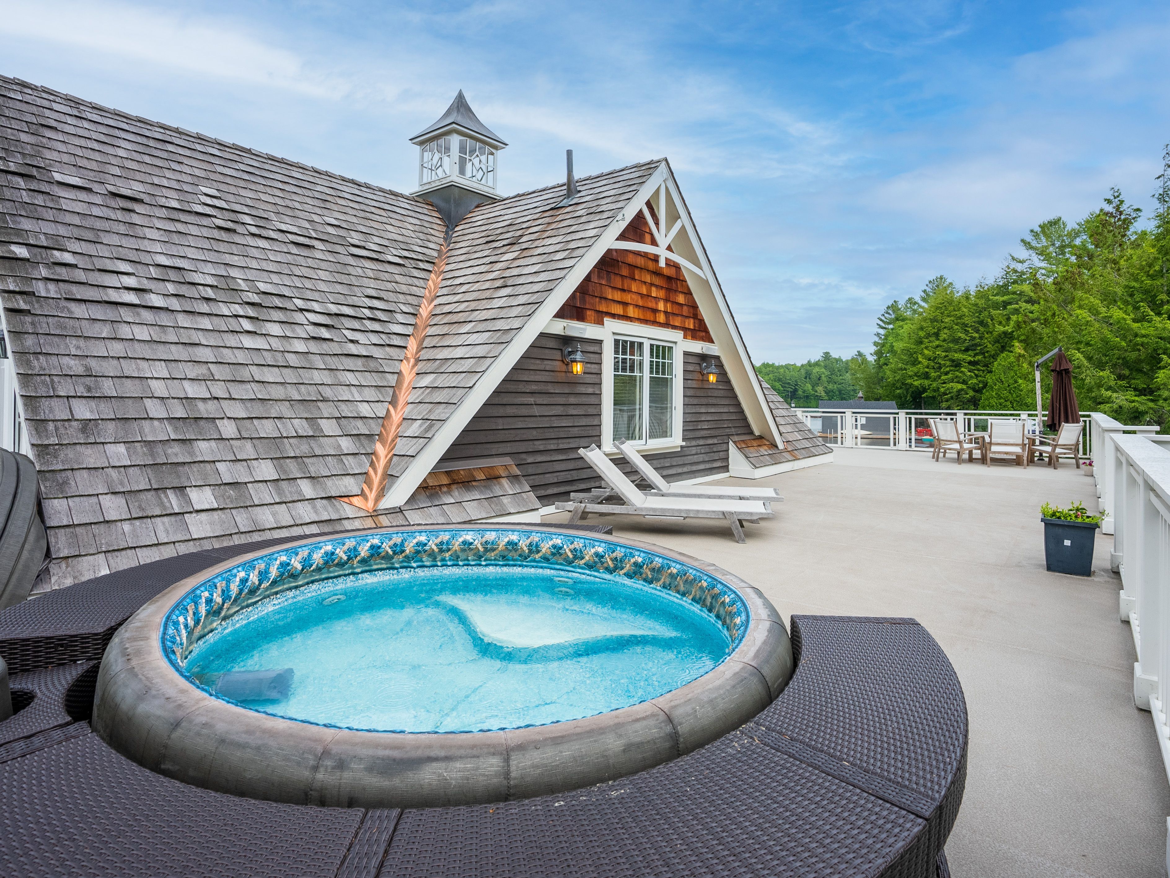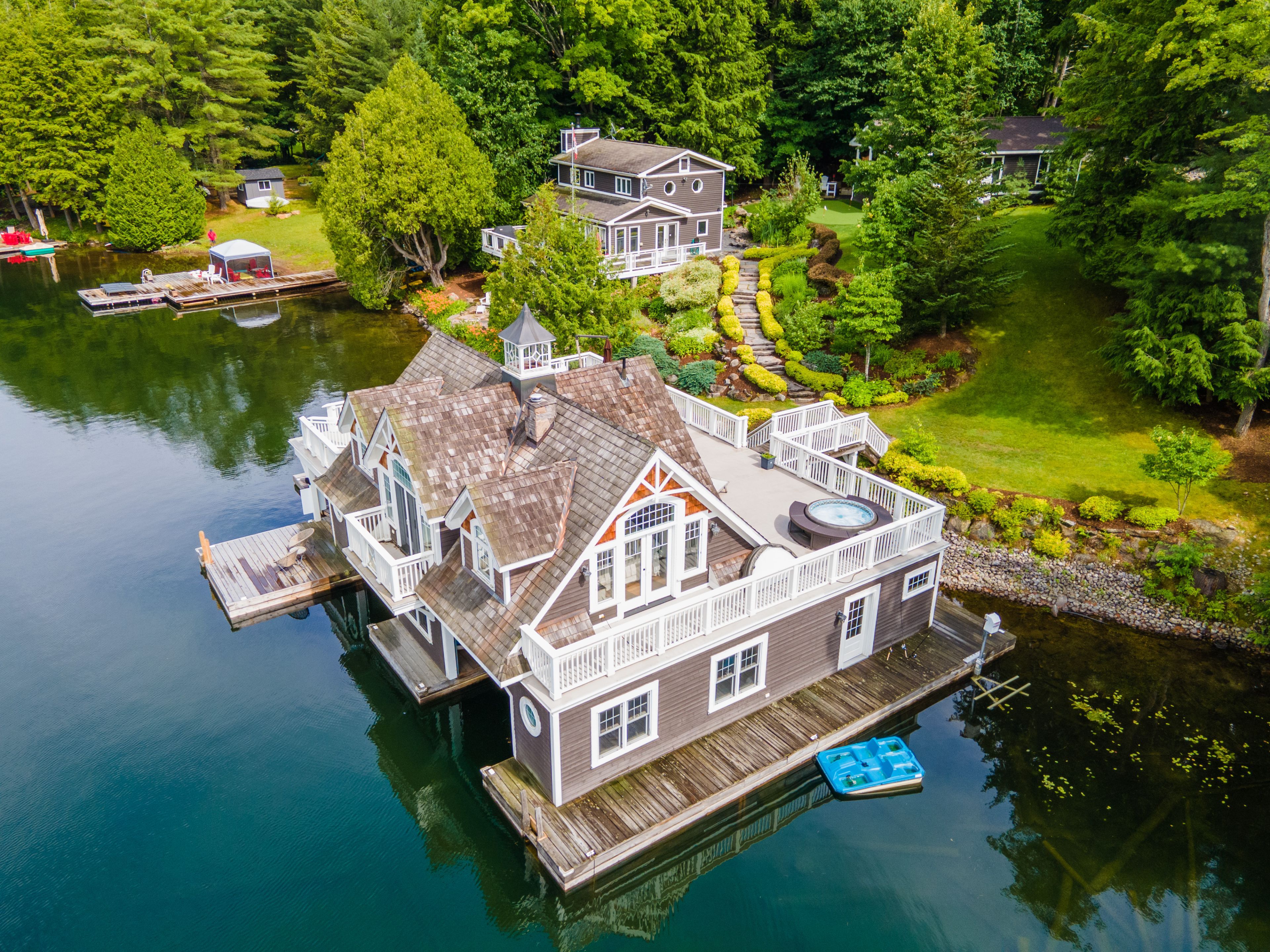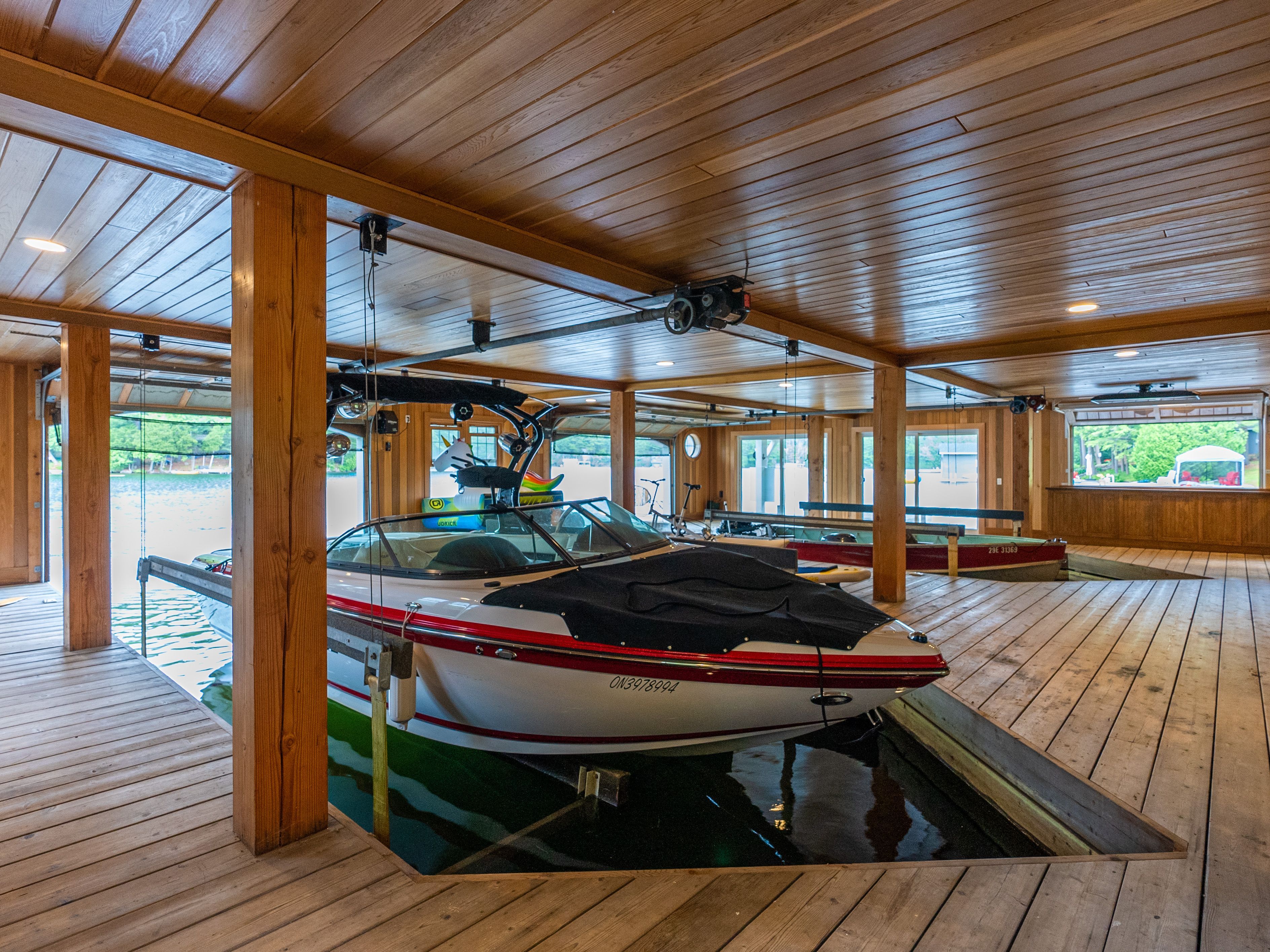 • Private boathouse with slips, kitchenette, and spa-like upper deck.