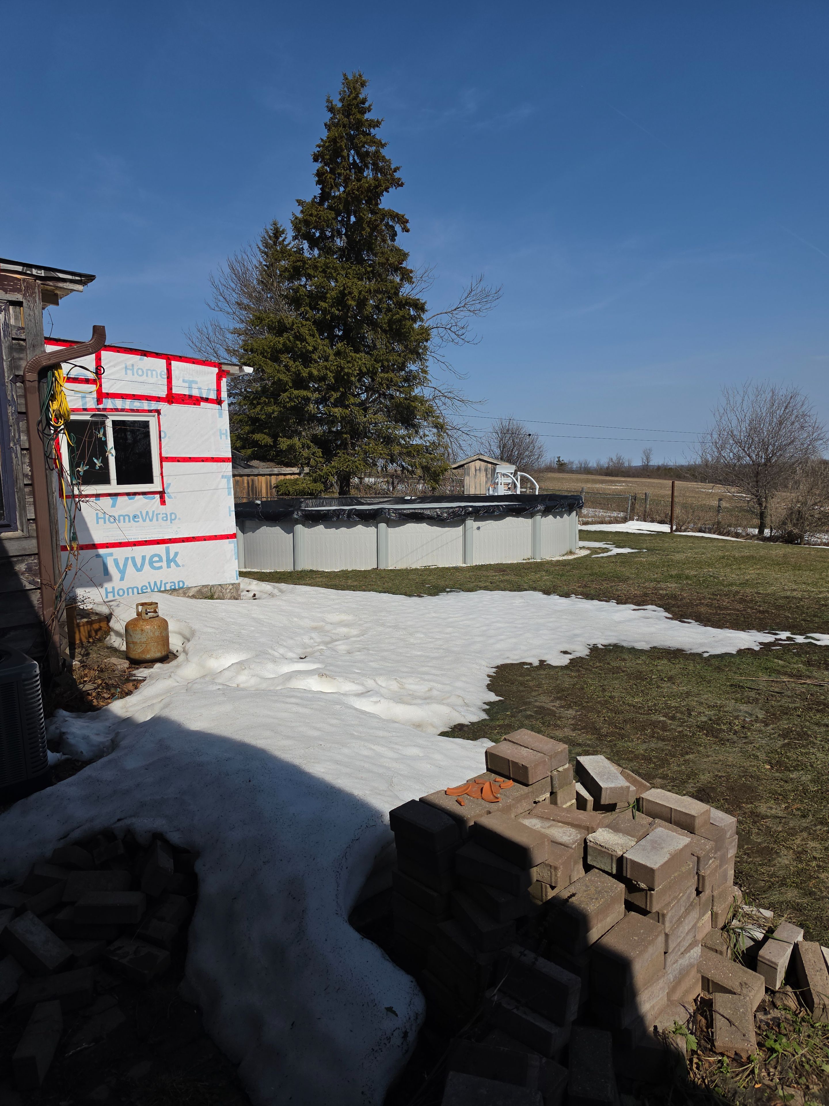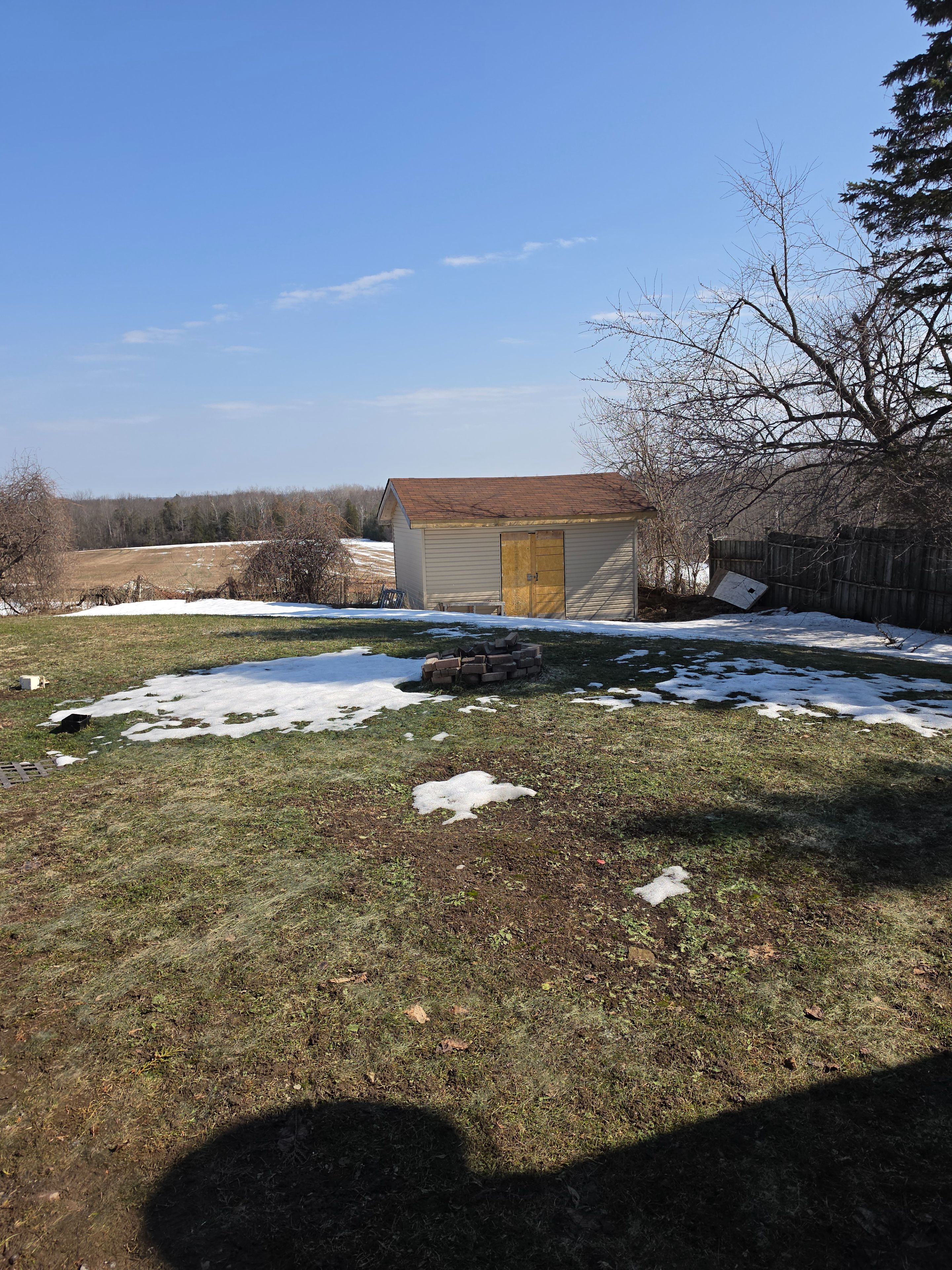 • Backyard features above-ground pool, fire pit, and storage shed.