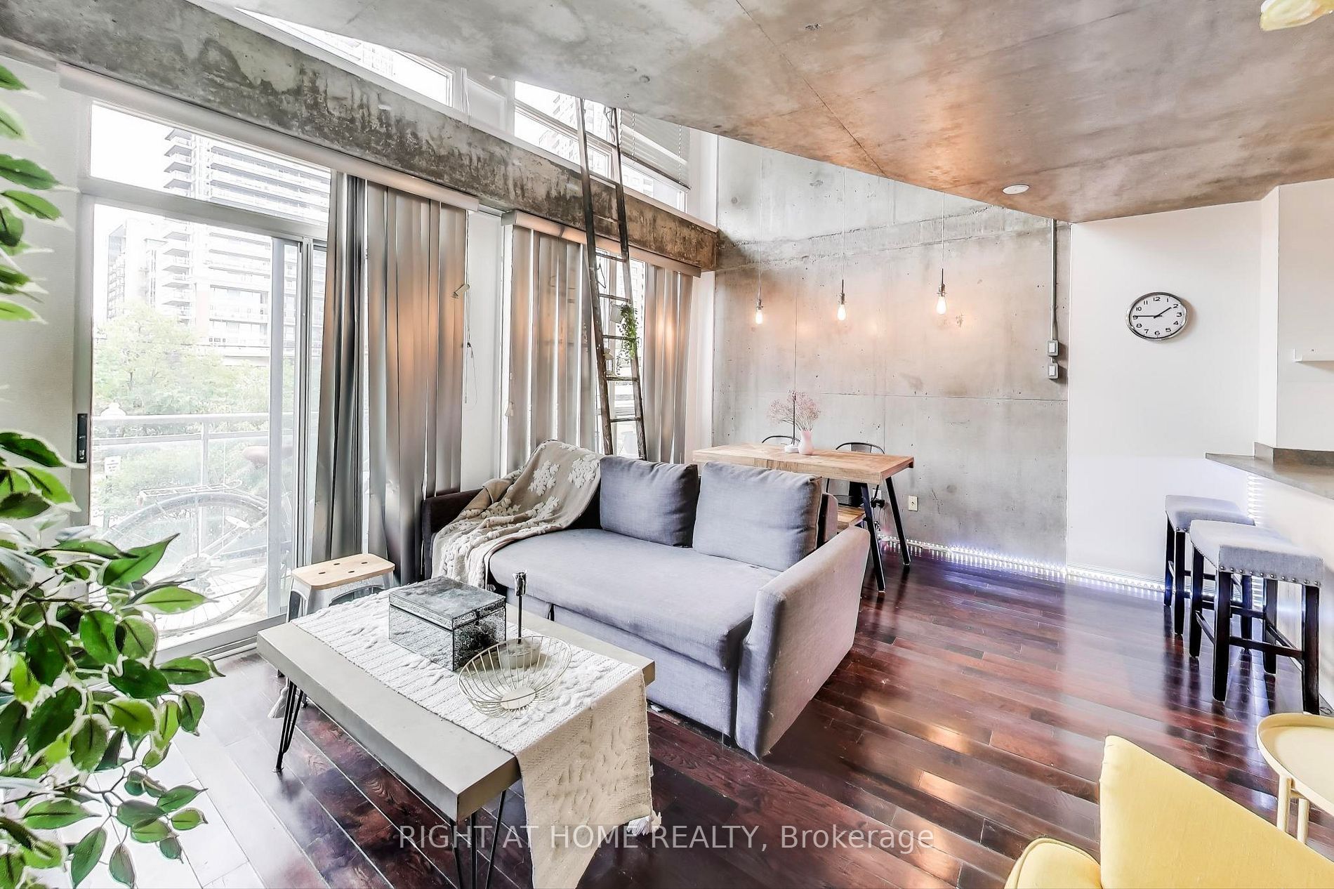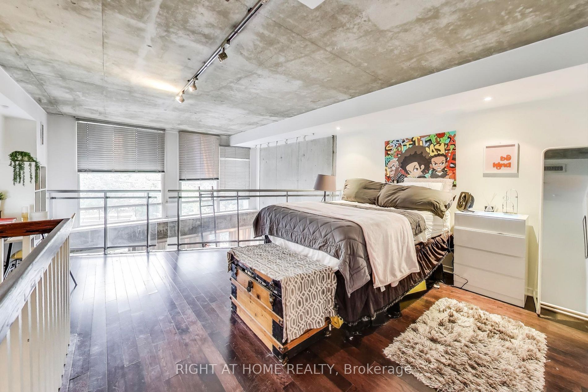Welcome home to unit 246 at 1029 king st w - a bright and spacious 1-bedroom + den, 2 bath, 2-level loft in the sought-after electra lofts. Boasting approx. 810 sq. Ft. Of bauhaus-inspired design, this south-facing unit is flooded with natural light through dramatic double-height windows. The open-concept layout features soaring ceilings in the living area, upgraded modern glass and steel railings on the upper level, and a sleek urban vibe throughout. Enjoy the perfect blend of style and function, with a generously sized bedroom (opened up wall separating the den), and an oversized 6' x 6' private storage locker included. Live in one of toronto's most dynamic neighbourhoods steps from trendy restaurants, nightlife, transit, parks, the bentway, and everything downtown has to offer. Whether you're entertaining at home or exploring the city, this is the ultimate king west lifestyle.