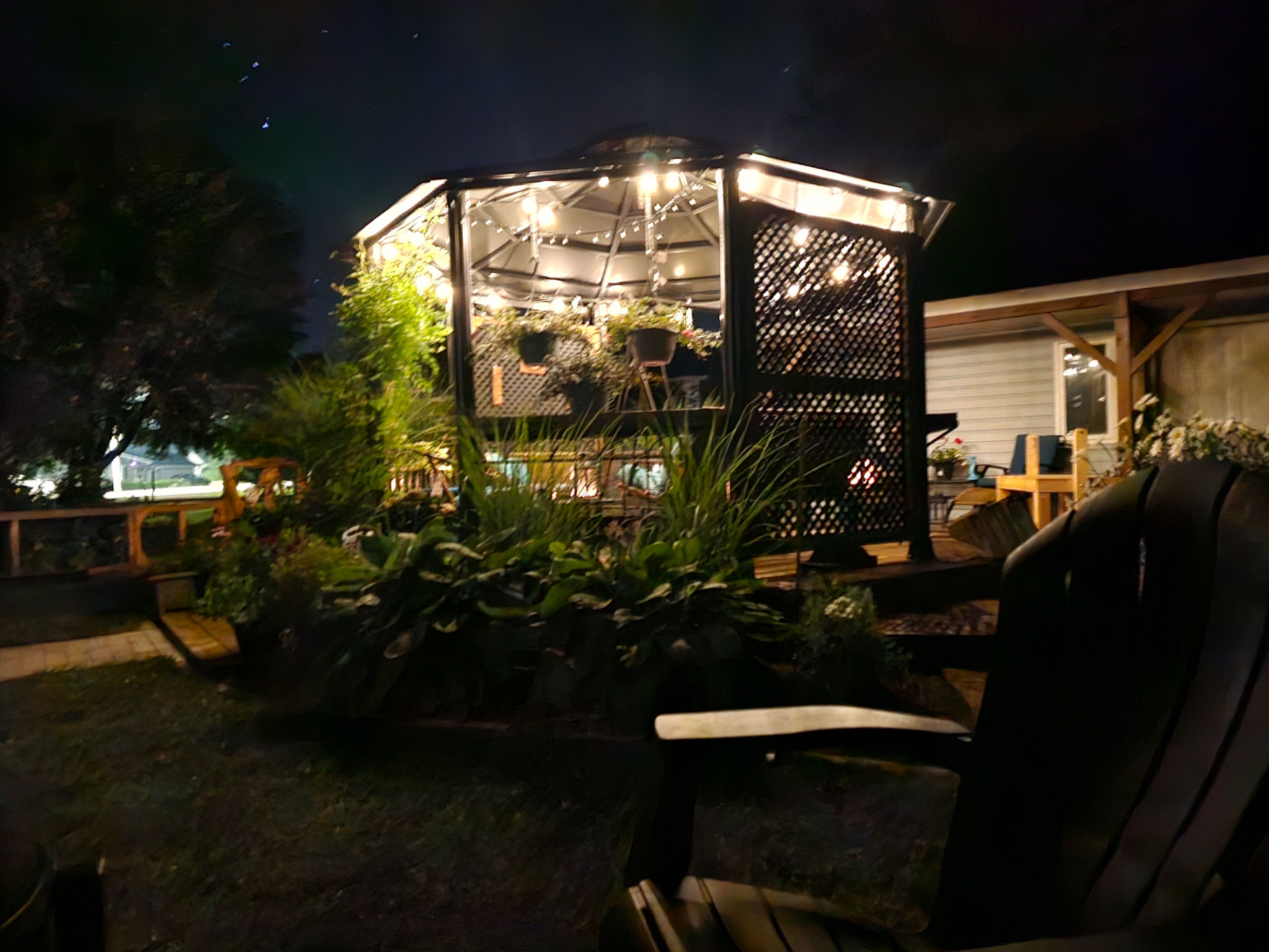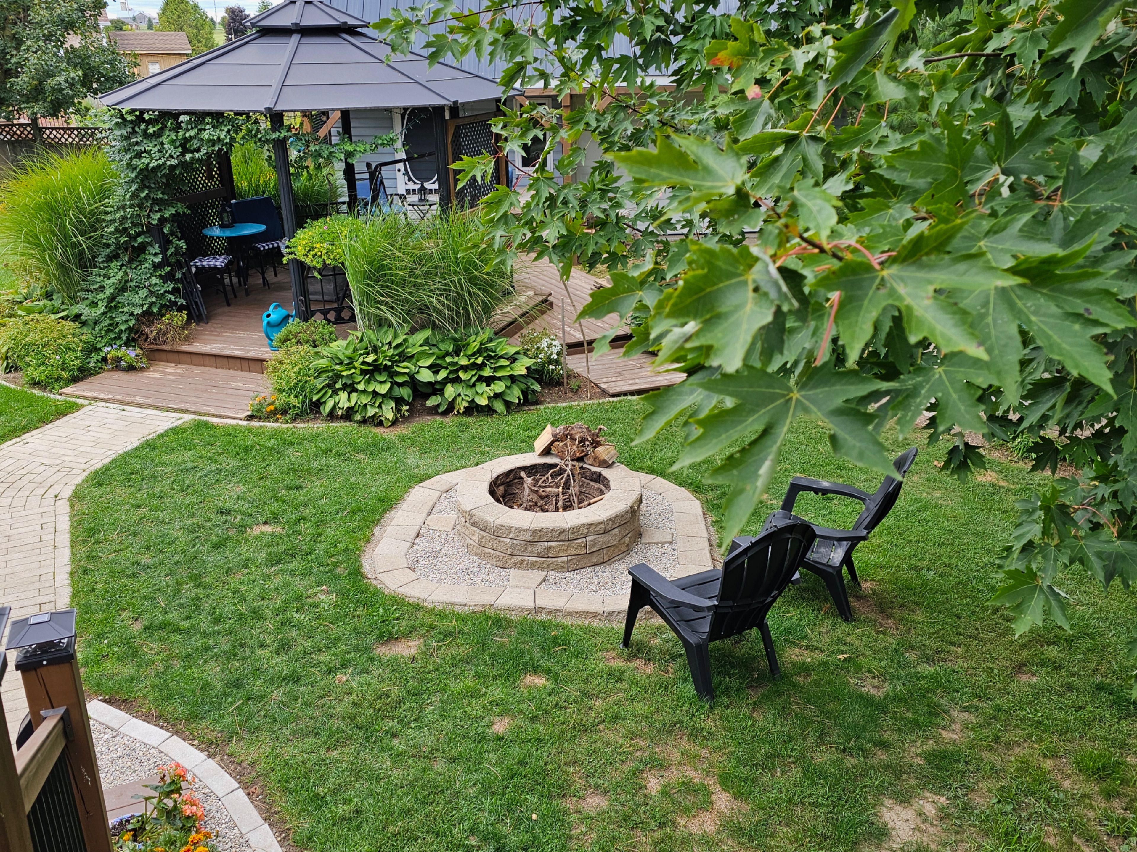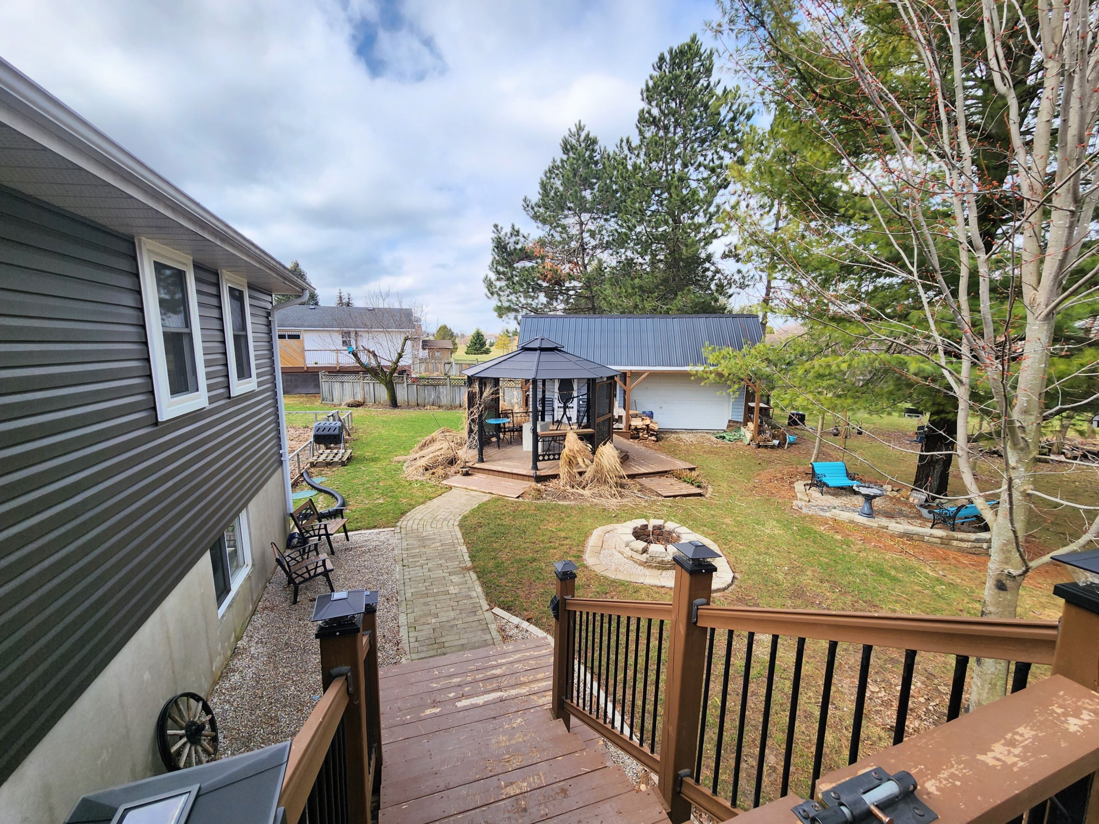 • Private outdoor retreat with deck, gazebo, and fire pit area.