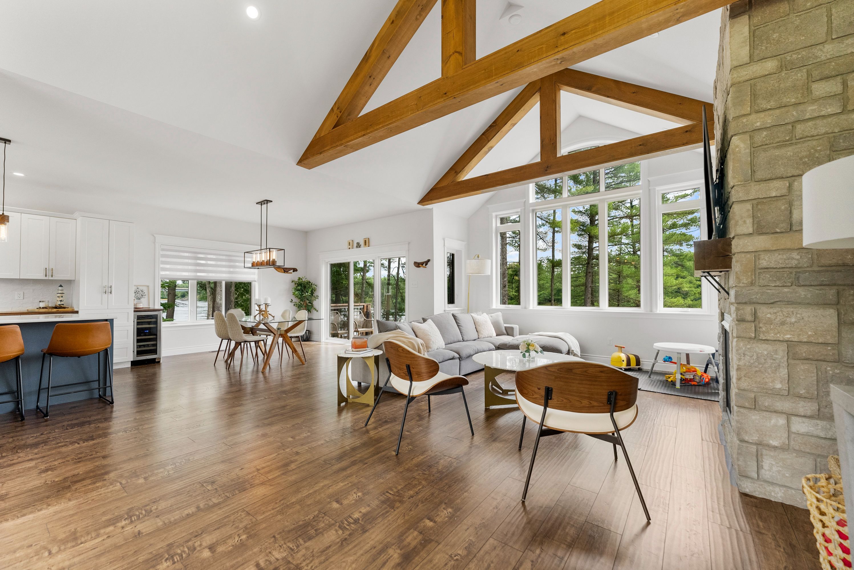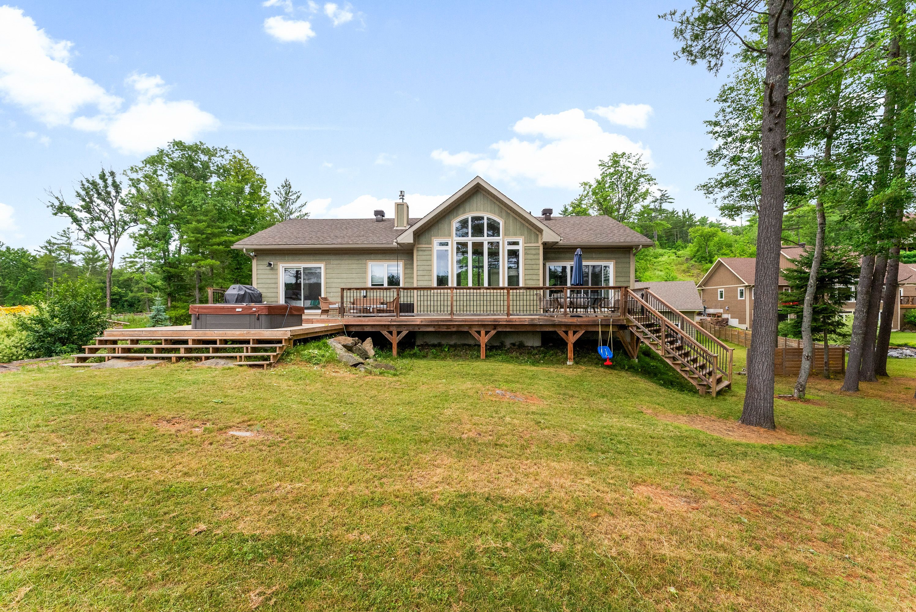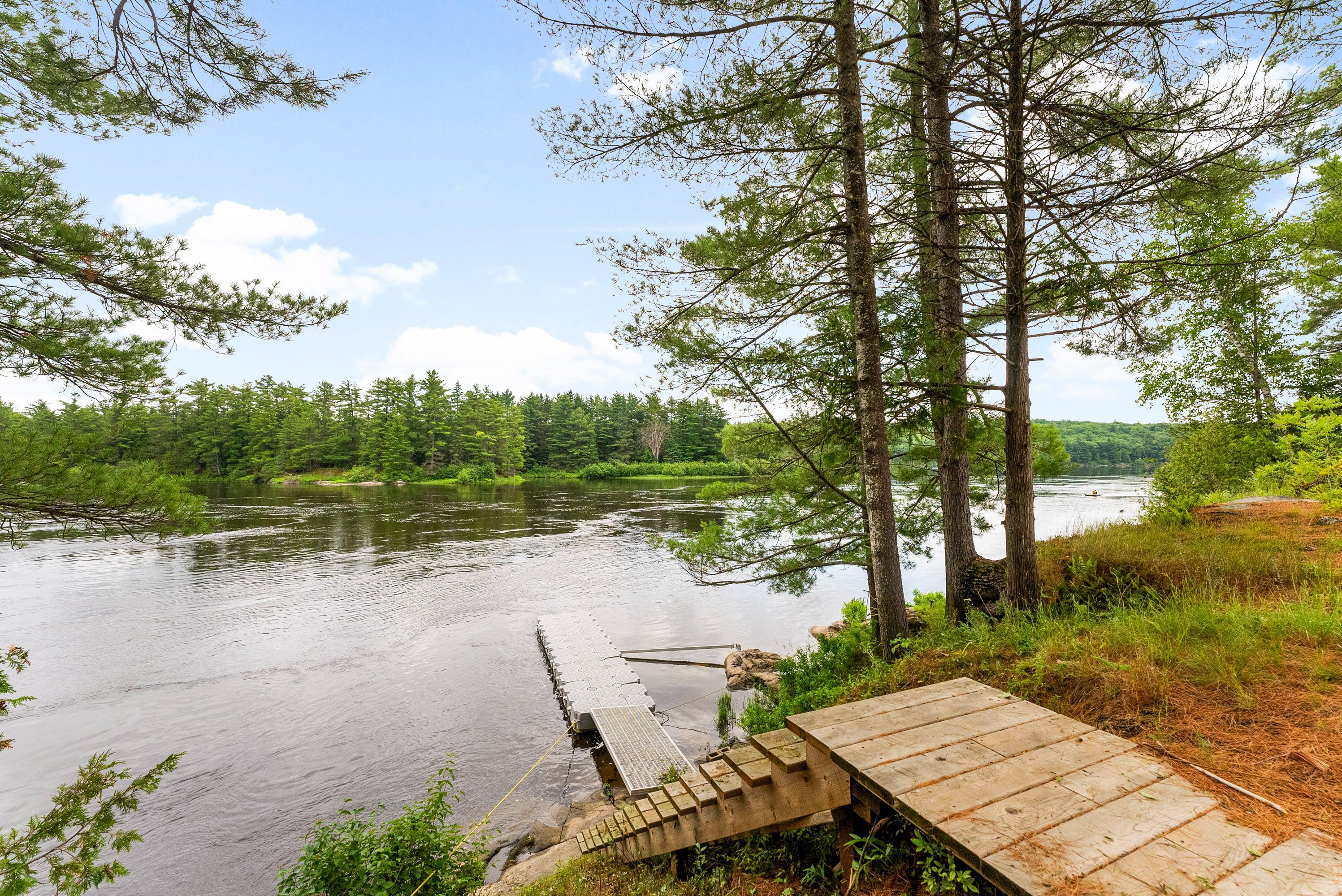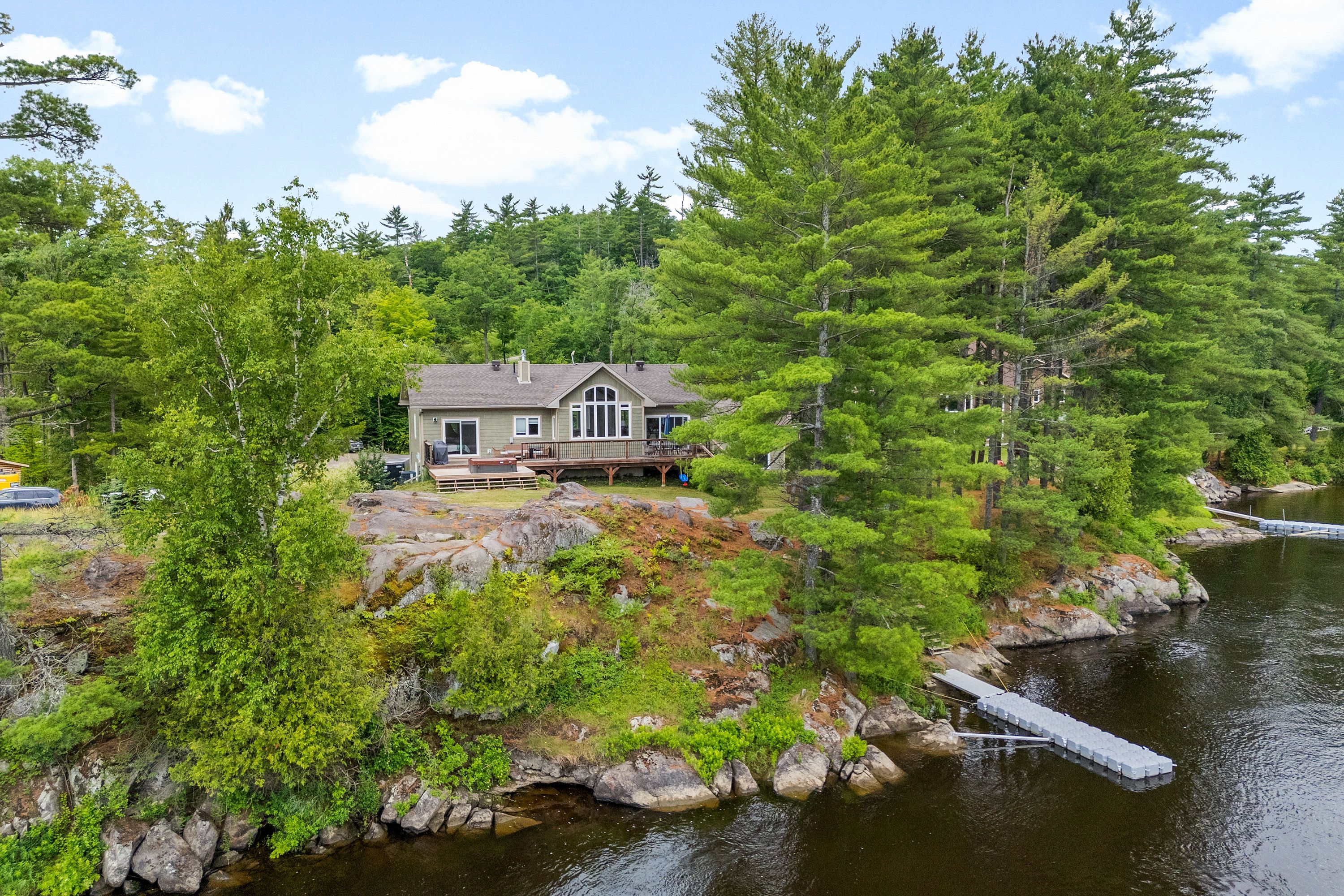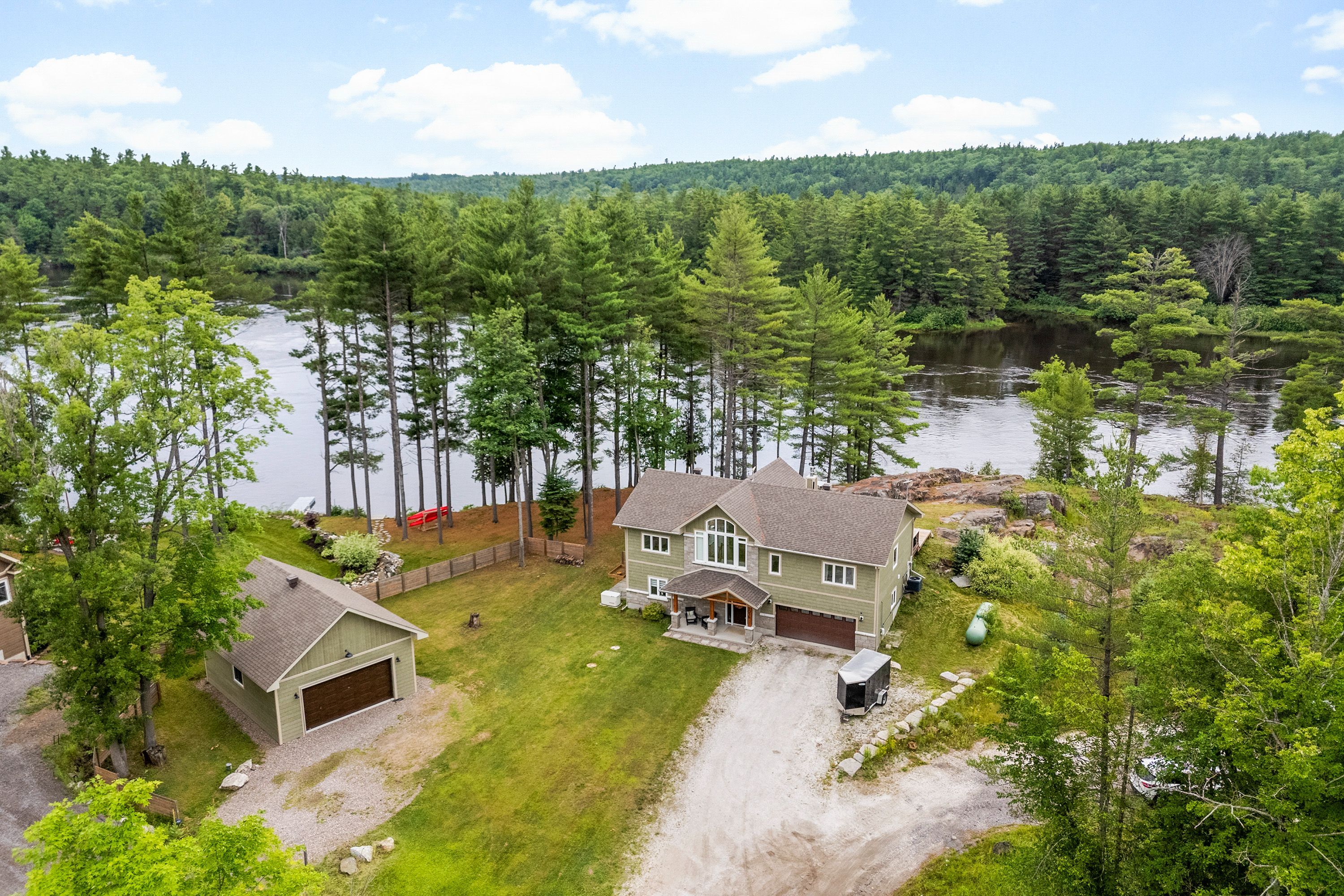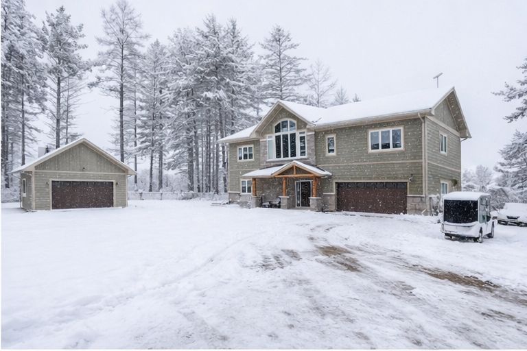 Waterfront living at its finest - welcome to 103 b carriage landing on the ottawa river. Surrounded by mature trees and miles of navigable water to explore, this year-round retreat offers a peaceful, private setting with exceptional fishing, boating, and outdoor recreation right outside your door. Step inside to an impressive two-storey foyer with soaring 20' ceilings and an upper balcony overlooking the grand entrance. The main level features a bright, open-concept kitchen and living area highlighted by vaulted ceilings with exposed beams and expansive windows that fill the space with natural light and showcase the surrounding landscape. The primary suite offers patio doors leading directly to the deck and hot tub - your own private outdoor escape. A walkout basement at ground level enhances the seamless connection between indoor and outdoor living, while the main floor balcony provides the perfect vantage point to relax and take in the tranquil river views. Car enthusiasts and hobbyists will appreciate the attached double garage plus an additional detached double garage, offering exceptional storage and workspace flexibility. Ideally located just minutes from renfrew and under an hour to ottawa, this property delivers the perfect balance of waterfront serenity and everyday convenience. Whether you're seeking a weekend getaway or a full-time waterfront residence, this ottawa river gem truly has it all.