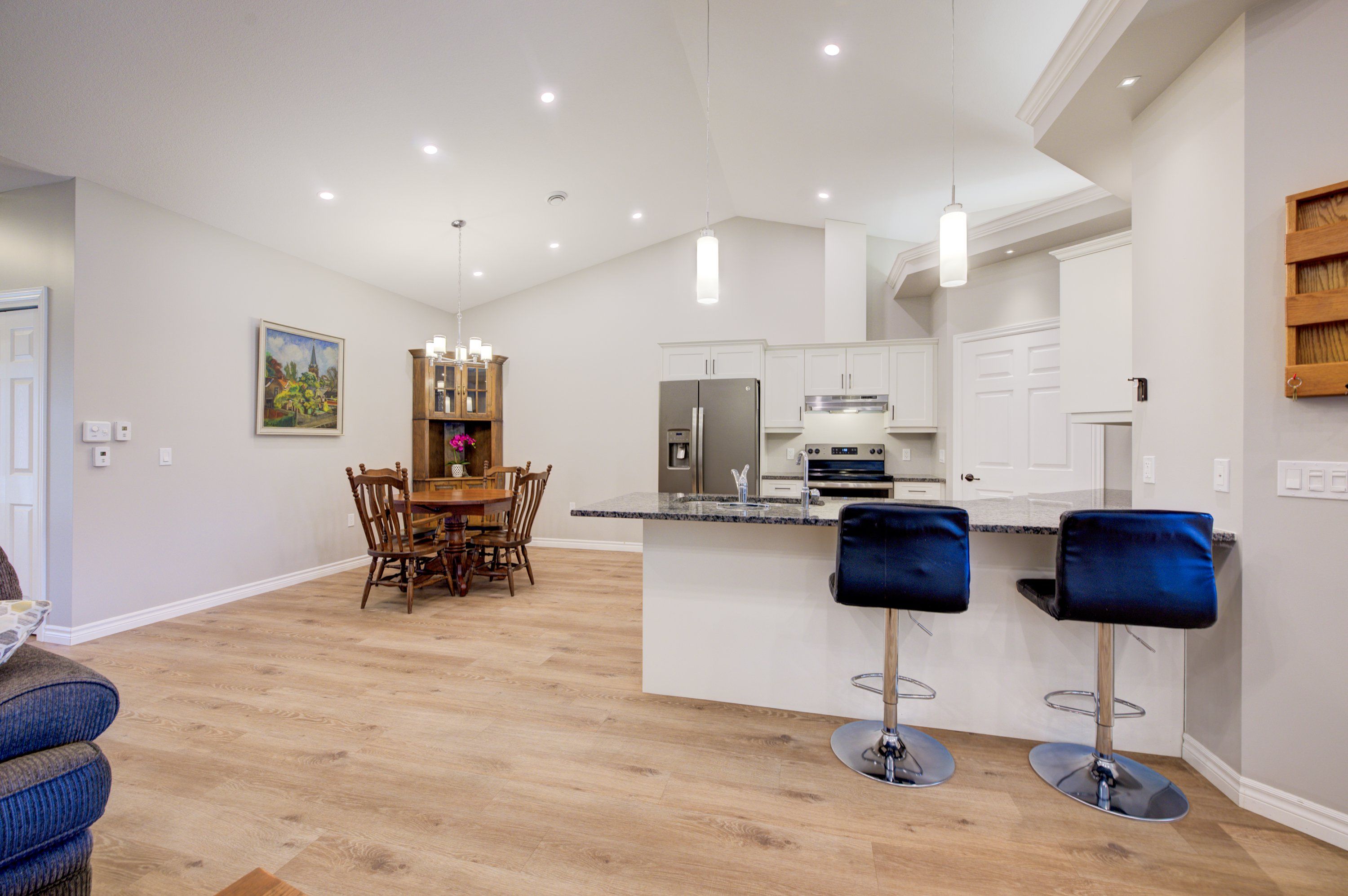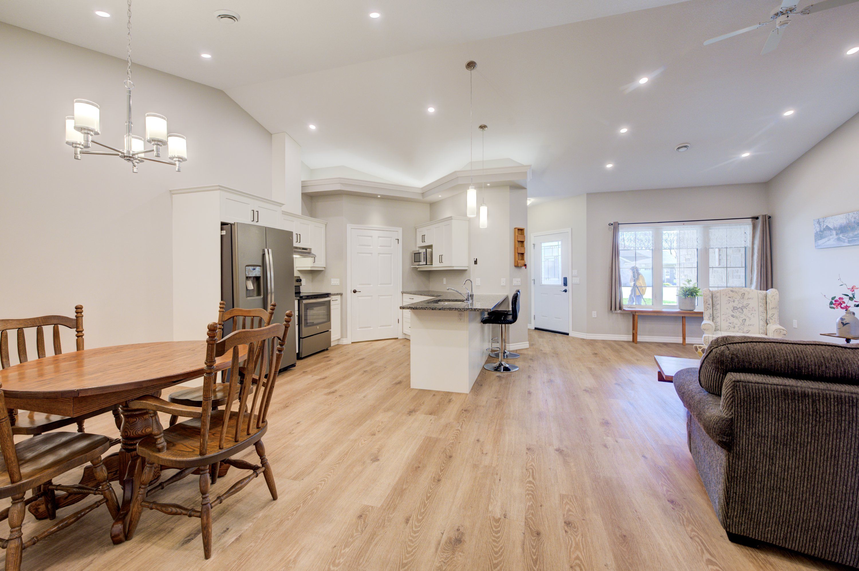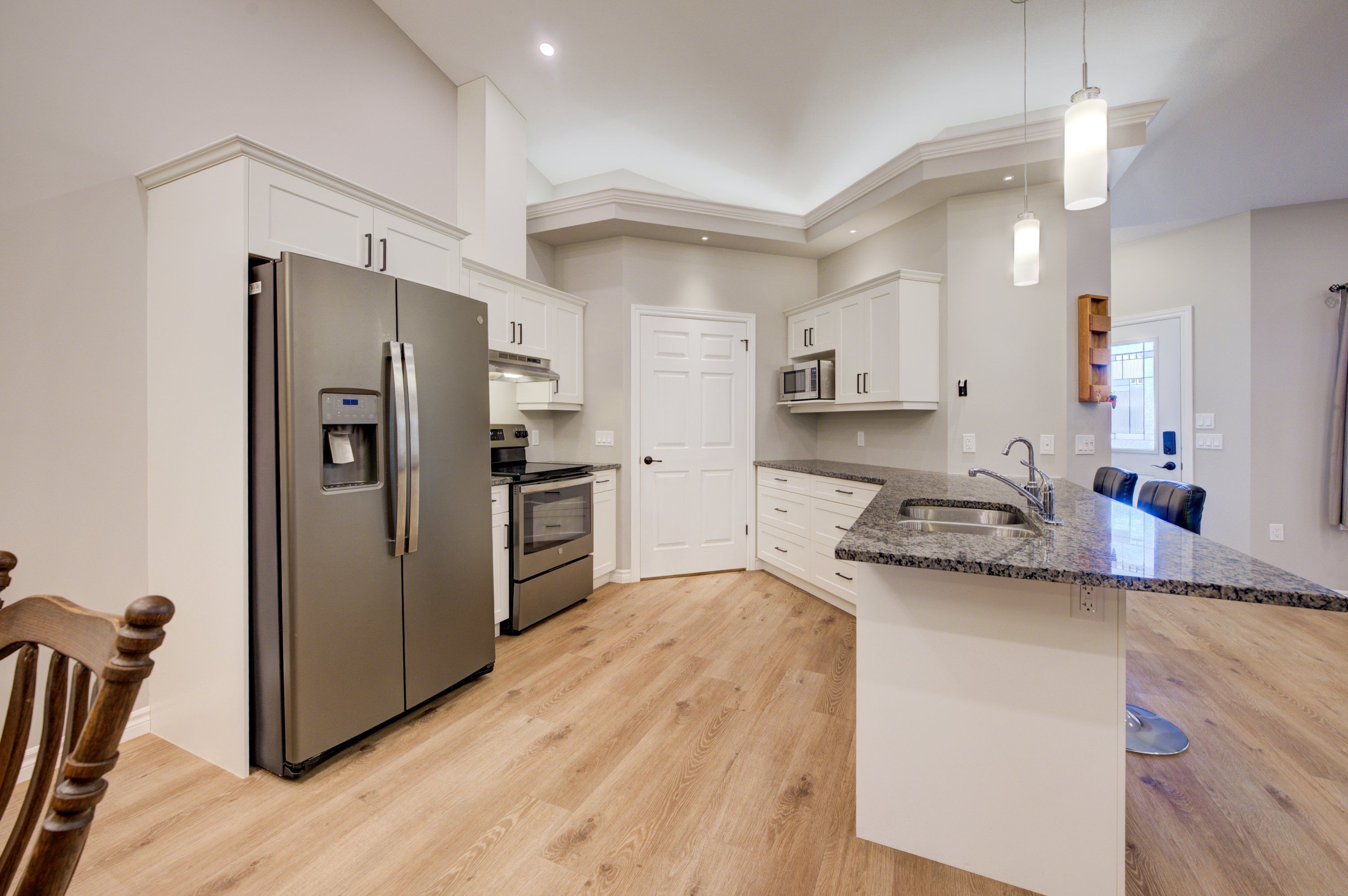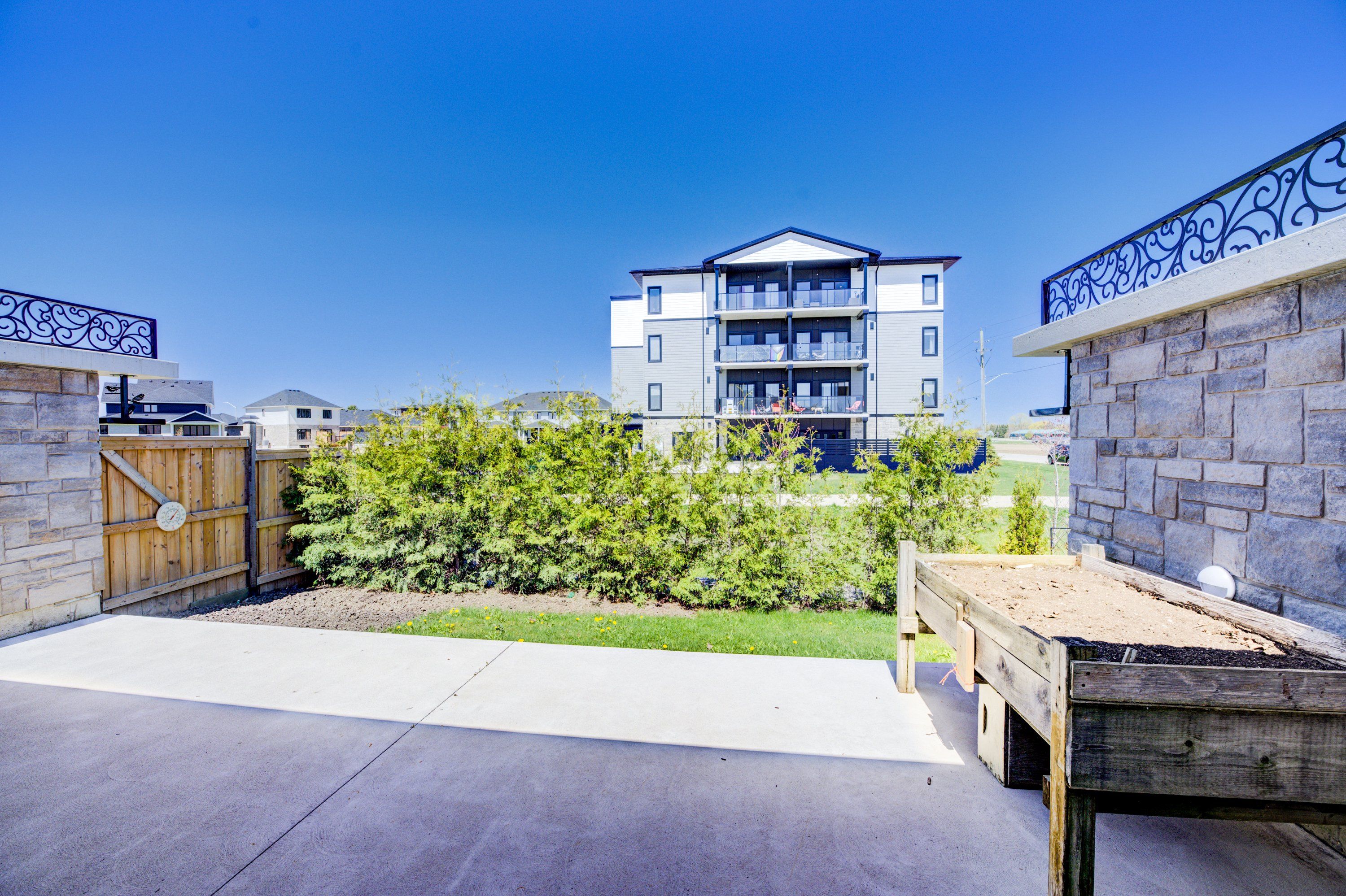 Welcome to this beautifully crafted 2-bedroom, 2-bathroom bungalow that offers the perfect blend of style, comfort, and accessible living. Designed with ease and functionality in mind, this home features wide, open spaces ideal for those seeking one-level, mobility-friendly living. The inviting living room boasts soaring vaulted ceilings and a cozy gas fireplace, creating a bright and welcoming space for relaxing or entertaining. The kitchen is a standout with sleek granite countertops and a dream walk-in pantry, perfect for home chefs. The spacious primary bedroom includes a walk-in closet, a private 3-piece ensuite, and sliding doors leading to a concrete patio and tranquil backyard. A second set of sliding doors from the guest bedroom also opens to this peaceful outdoor space. Additional features include gas forced air heat, luxurious gas in-floor heating, and central air for year-round comfort. The large attached single-car garage is fully lined in metal for easy cleaning, and the covered front porch includes a gas line for your bbq. This home combines practicality, elegance, and accessible design in one exceptional package.