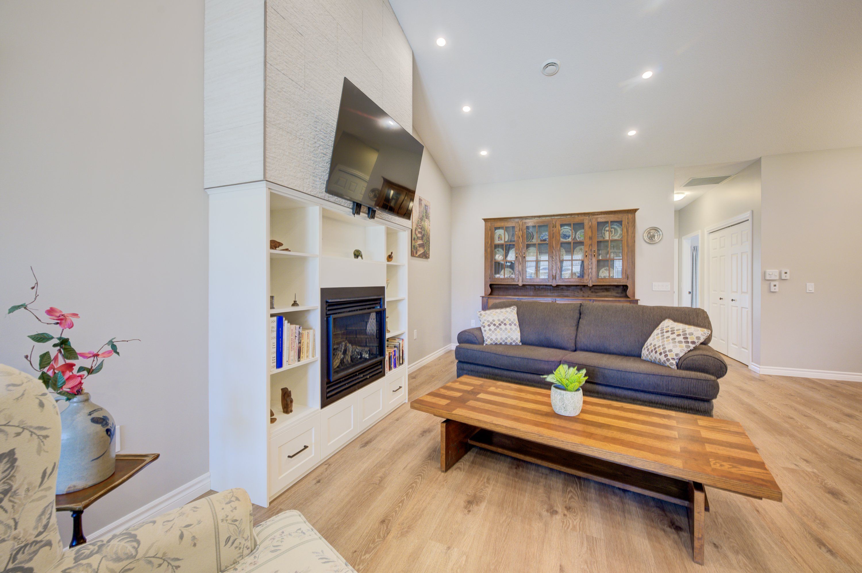 • Bright living room with vaulted ceilings and a cozy gas fireplace.