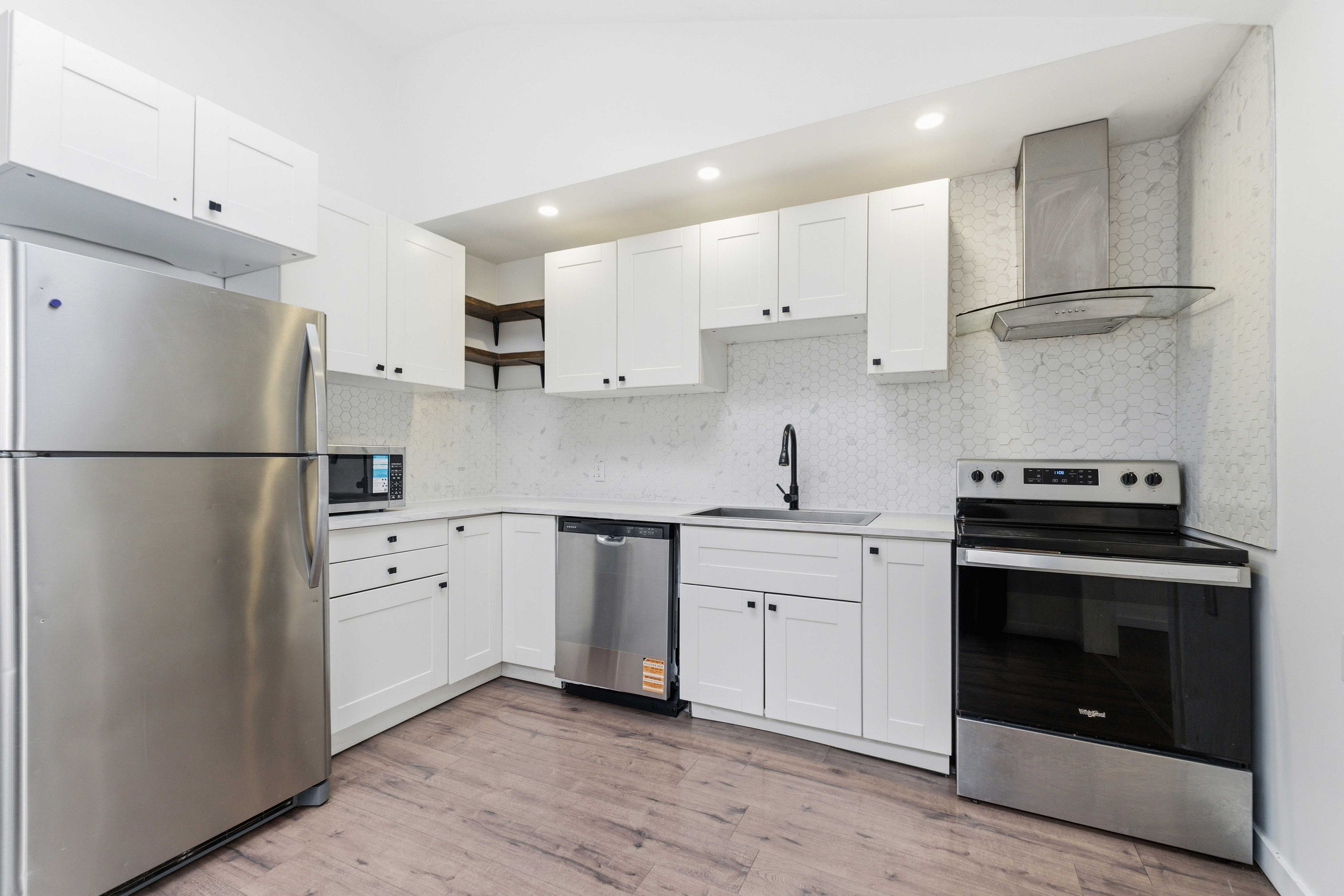 • Modern kitchen features granite countertops and stainless steel appliances.