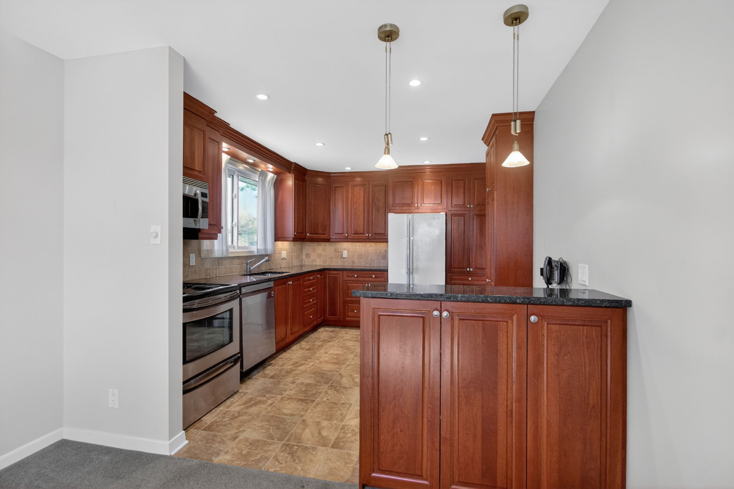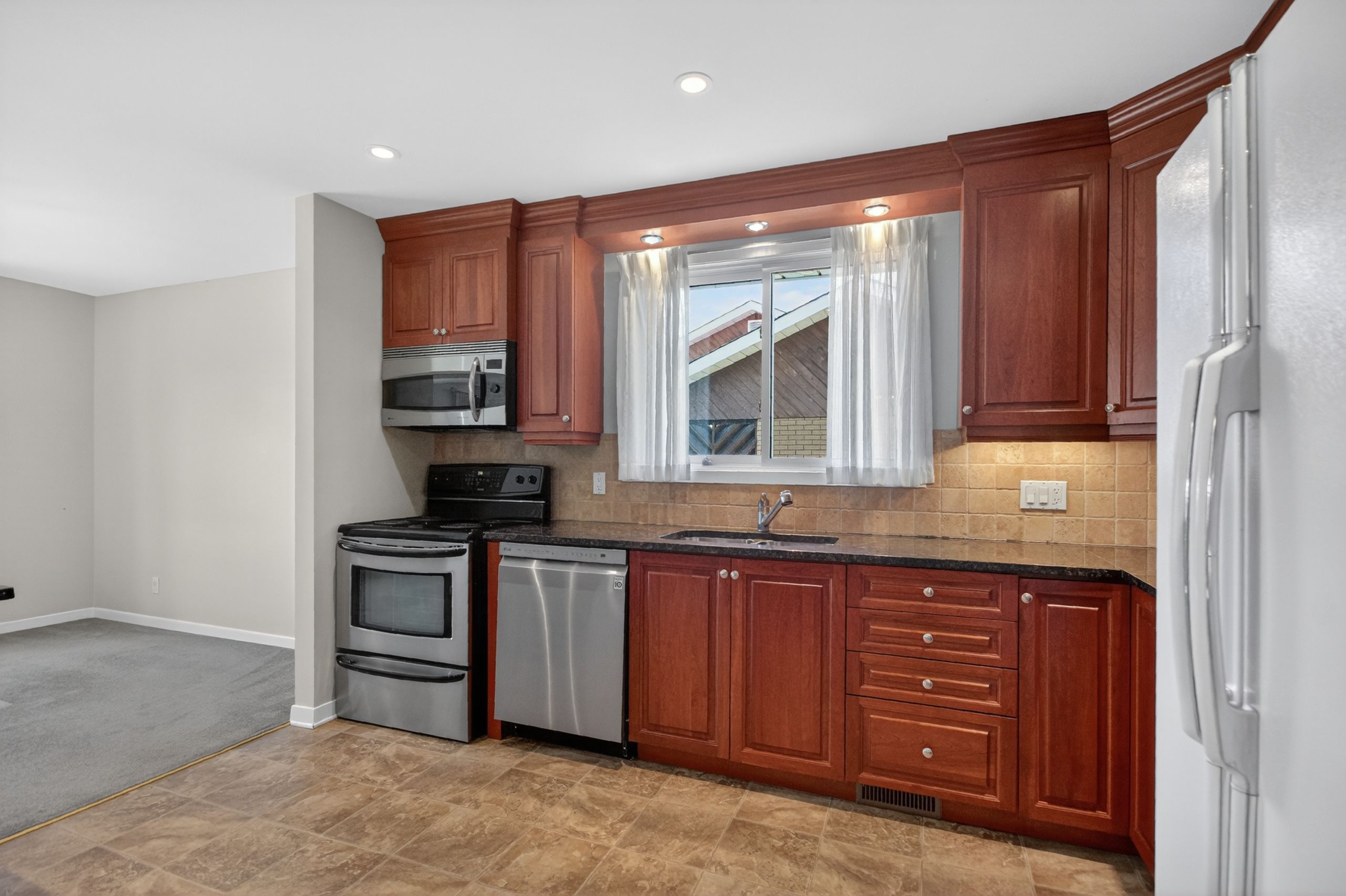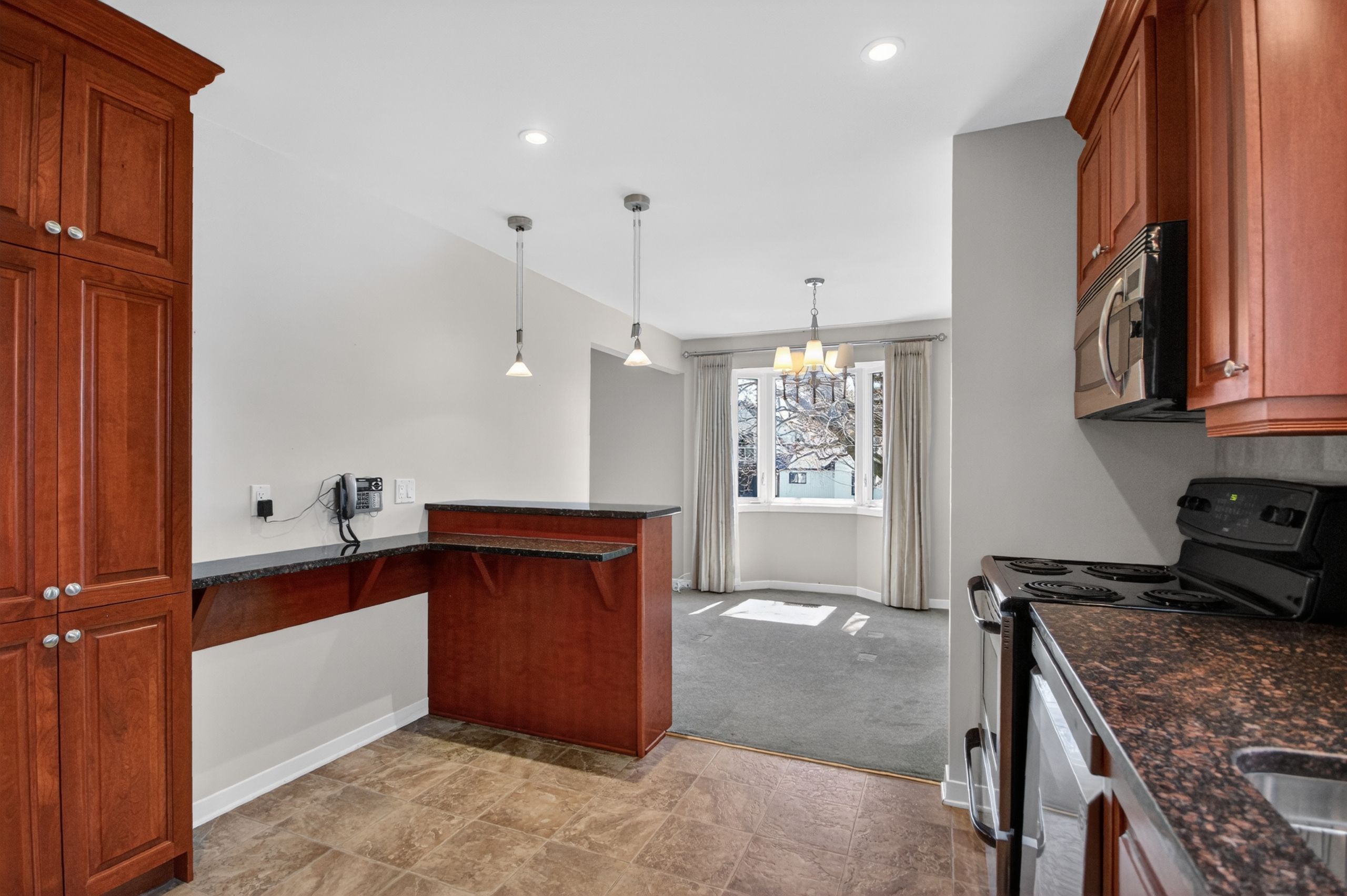 • Updated kitchen with granite countertops and ample cabinet space.
