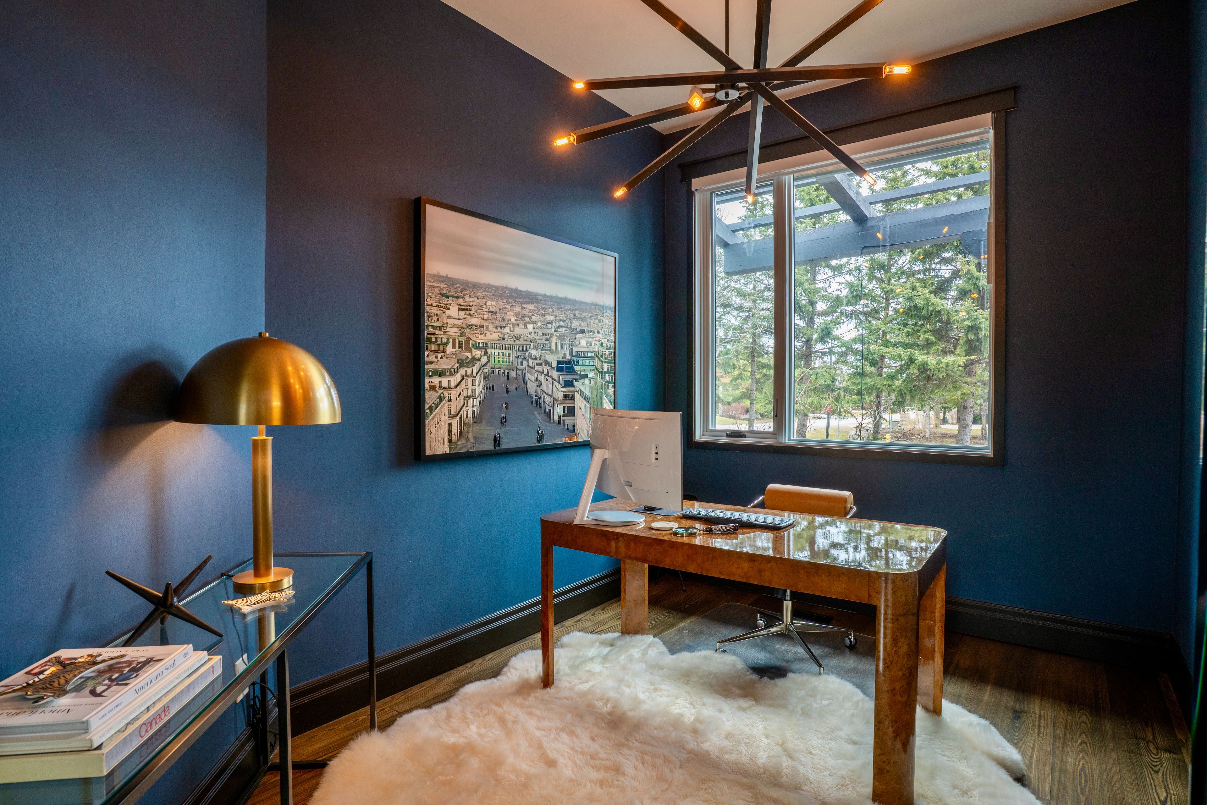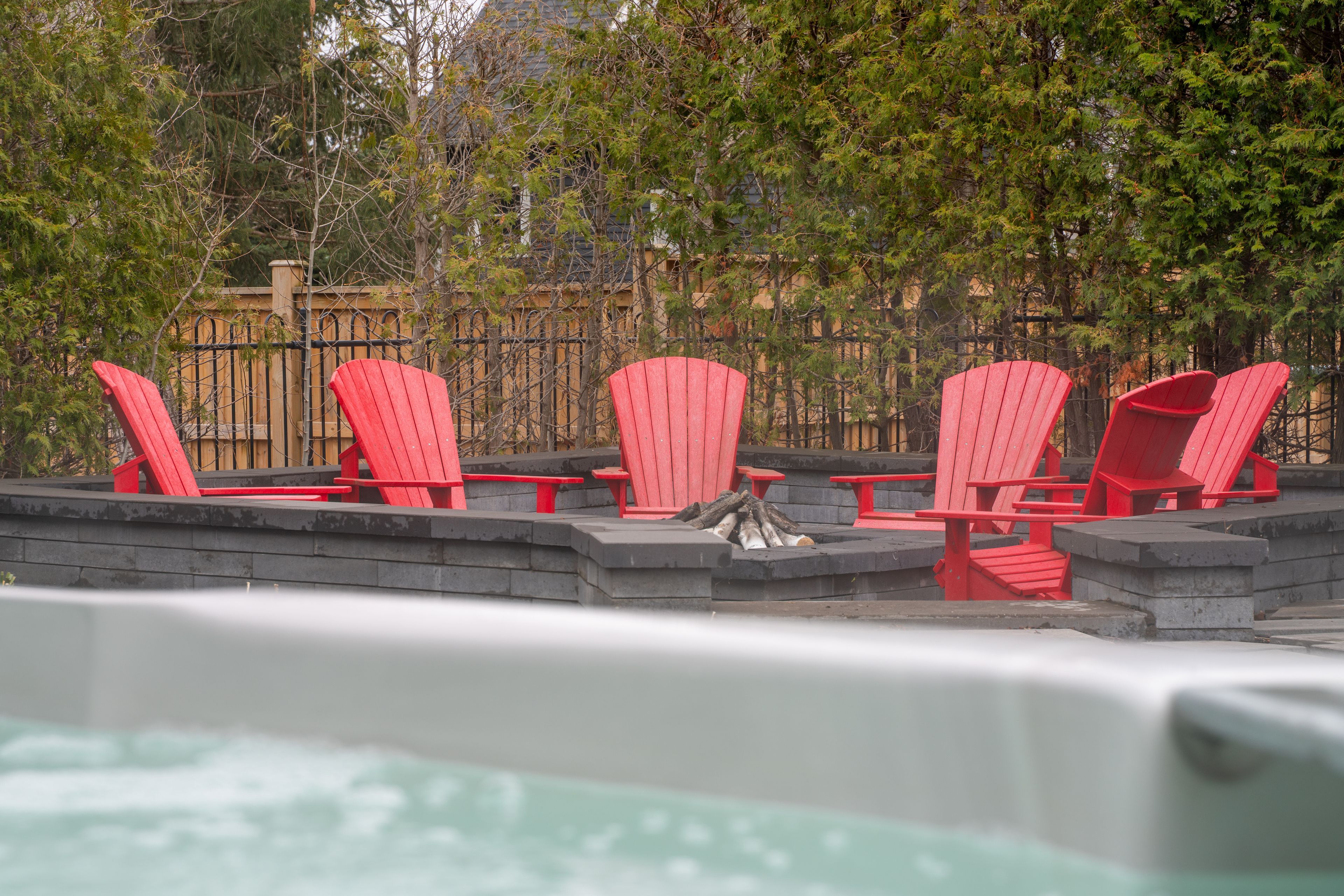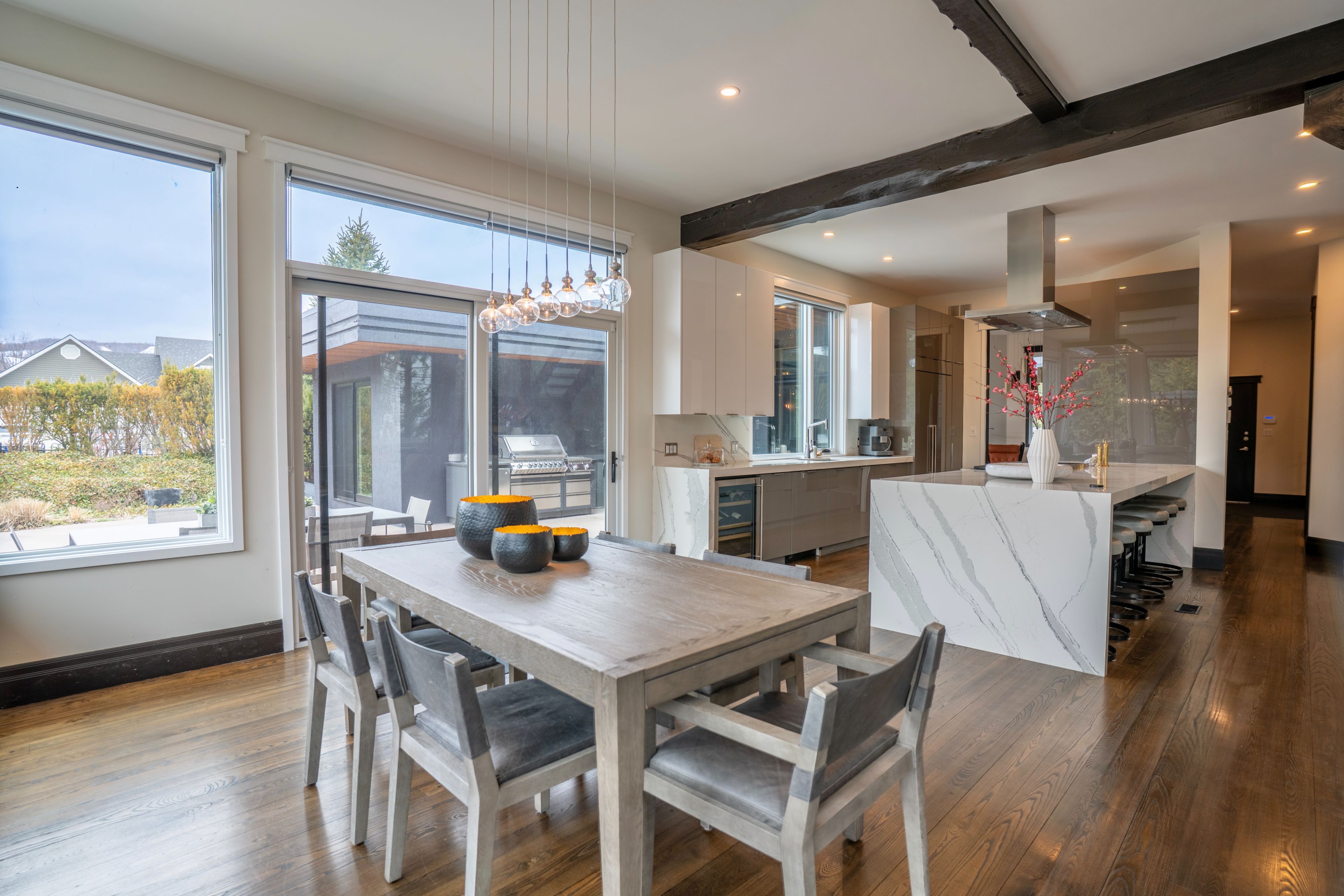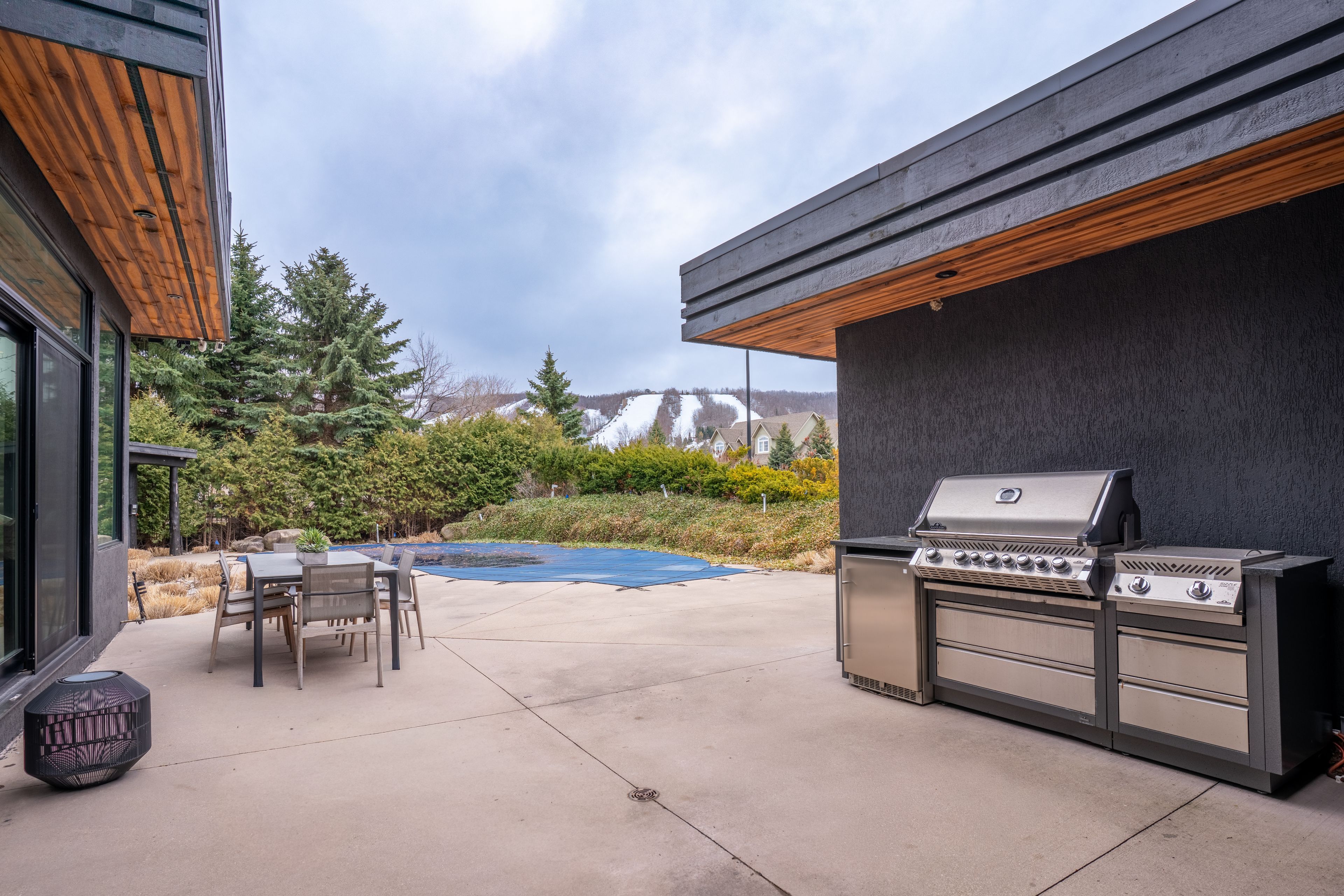 Set in prestigious nipissing ridge, steps to craigleith and alpine ski clubs, this exceptional modern chalet, built by custom builders absolute craftsmen, offers approximately 3,200 sq ft plus a professionally finished basement, designed for year-round living and entertaining. Offered turnkey with designer furnishings, the property is move-in ready. The open-concept main level is anchored by a striking glass staircase and features a custom chef's kitchen with a dramatic 14' island, sleek cabinetry, built-in wine fridge, wolf gas range and bosch double oven with convection microwave. The kitchen flows into a bright family room with a stone-surrounded gas fireplace, wall to wall bench with stone accents, a full glass rear wall, showcasing ski hill views from nearly every room. Ash flooring, wood beams, and a statement wood feature wall add warmth and style. Two glass-enclosed rooms provide flexible office or media space. The main floor primary suite includes a fully renovated spa-like ensuite with porcelain tile, large glass shower, and double vanity, and the main floor also boasts a large steam shower with bench seating. Upstairs offers three spacious bedrooms with built-in closets and a beautifully finished bath with double vanity and oversized glass shower. The fully finished basement features an open-concept design with steel beam construction, a custom bar, feature wall, and concrete-surround fireplace. Glass doors lead to a gym, laundry, storage, and a two-person infrared sauna, with walk-up access to the garage and a full bath. Enjoy panoramic ski hill views from the 20' x 40' upper deck. The private backyard features an inground saltwater pool, hot tub, gardens, and a dramatic firepit with a rare 400,000 btu montana burner. A pool hut adds storage. The heated two-car garage includes epoxy floors, custom cabinetry, counter-depth fridge, spray foam insulation, pot lights, and a modern glass door with battery backup.