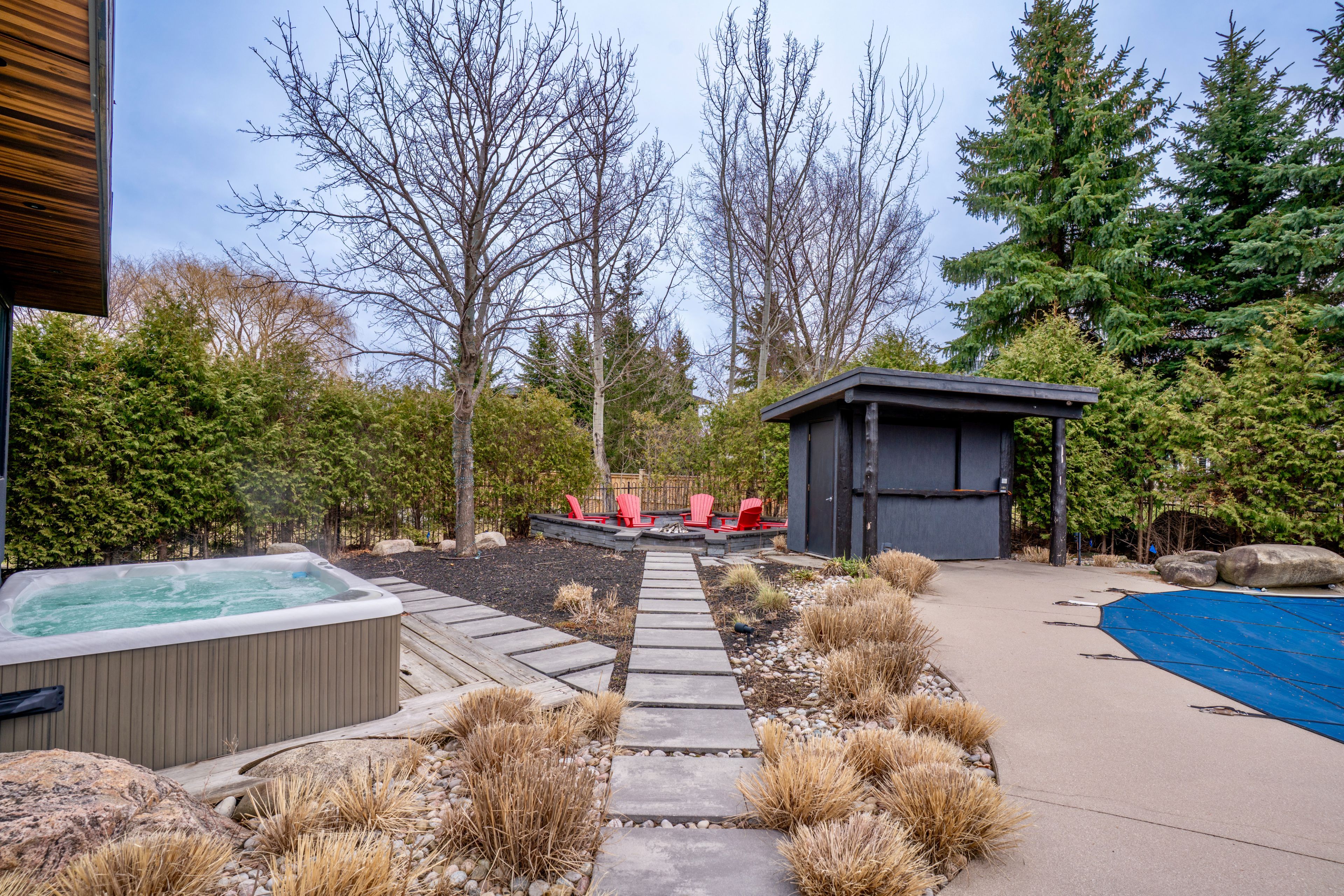 • Private backyard features an inground saltwater pool, hot tub, and firepit area.