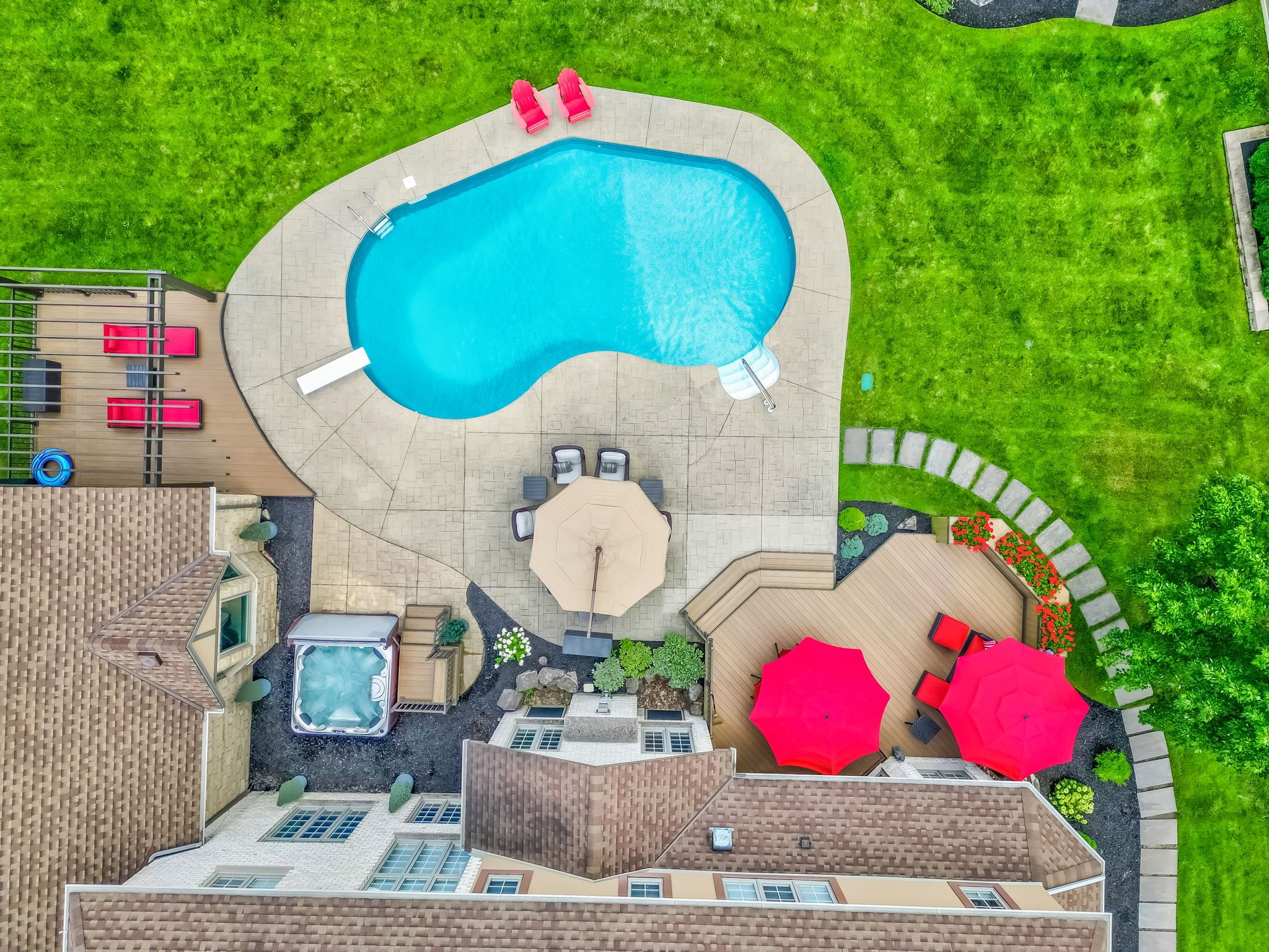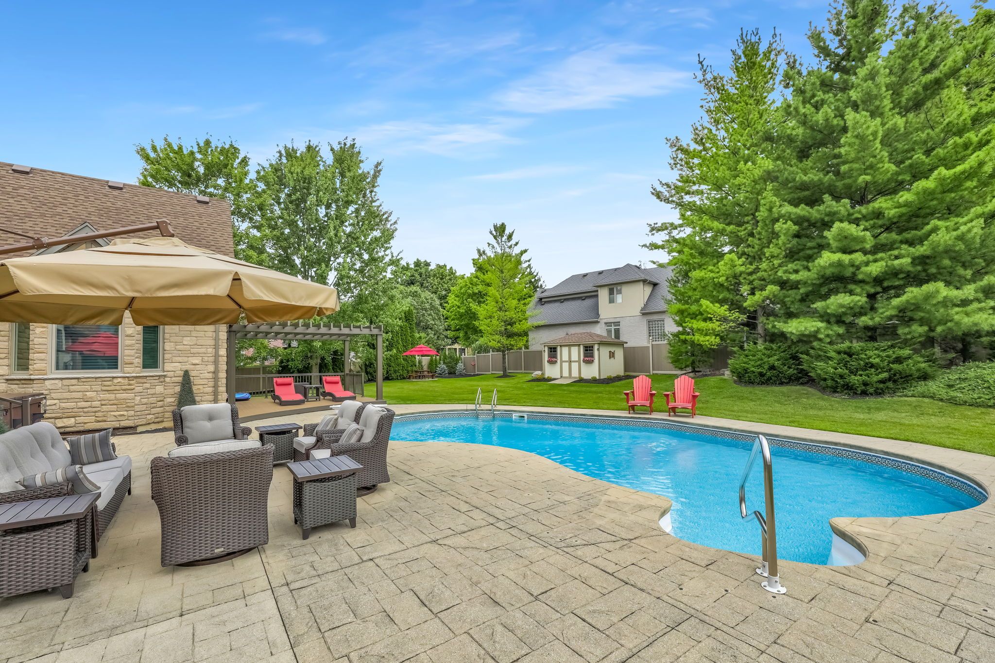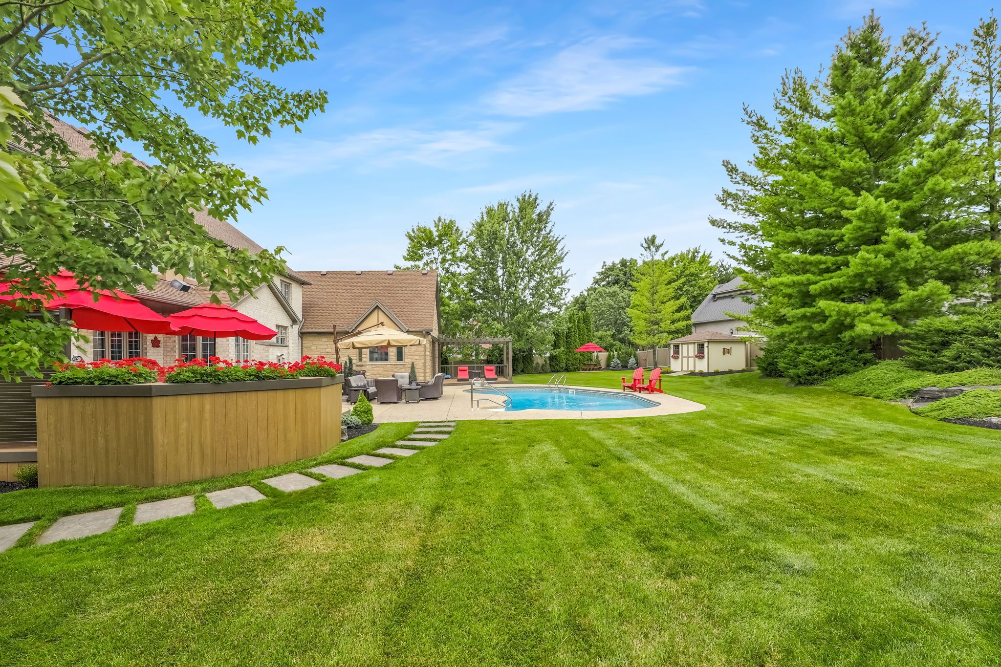 • Resort-style backyard featuring a saltwater pool, hot tub, and pergola.