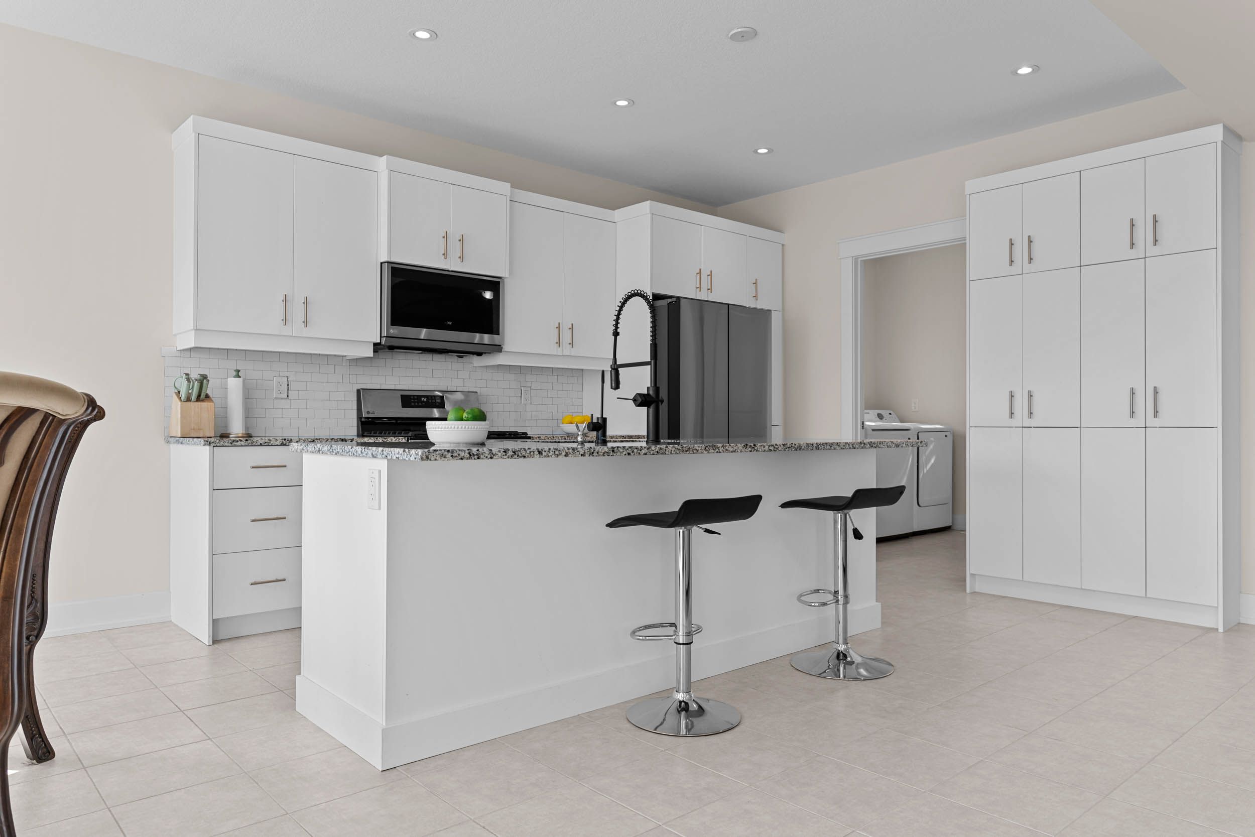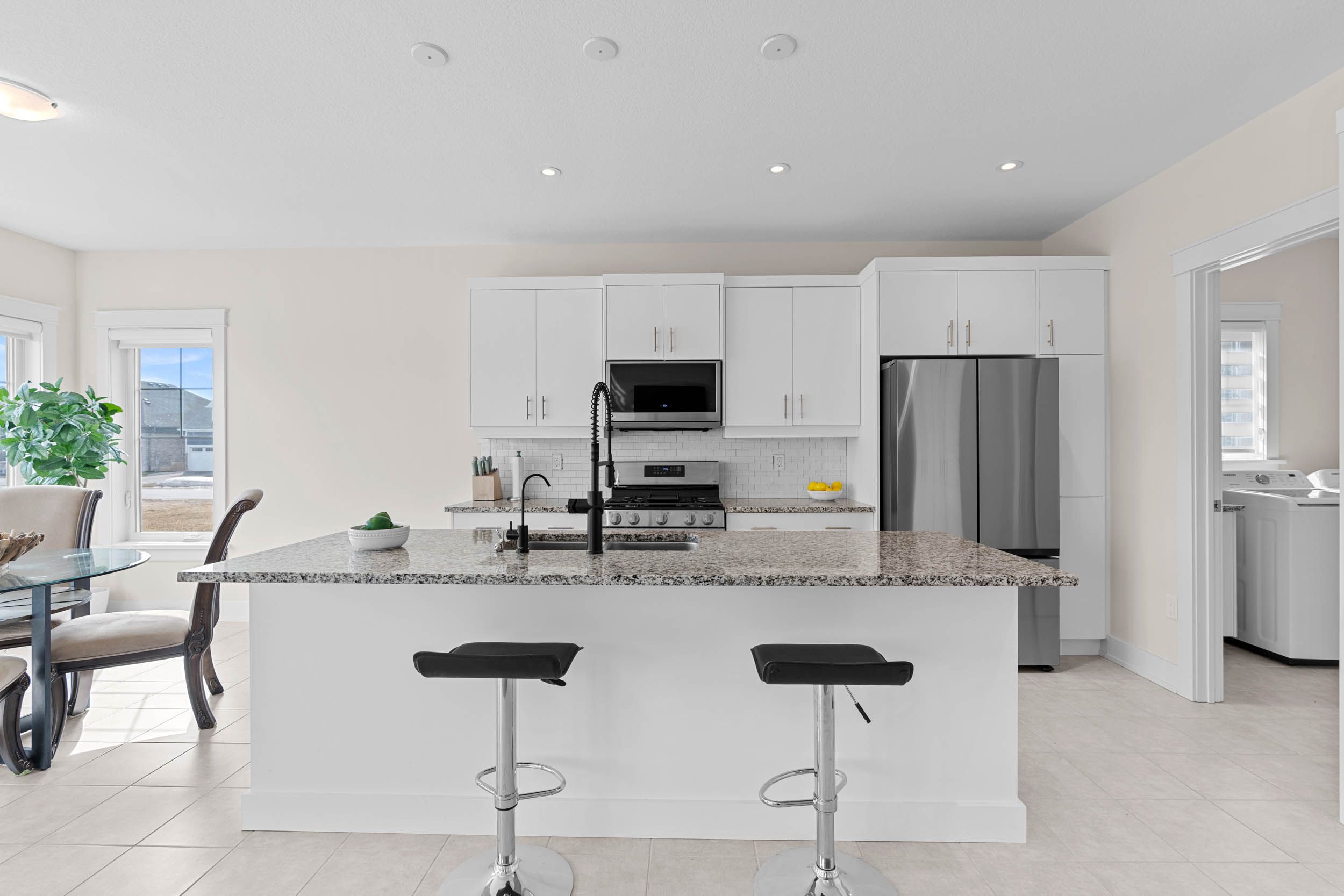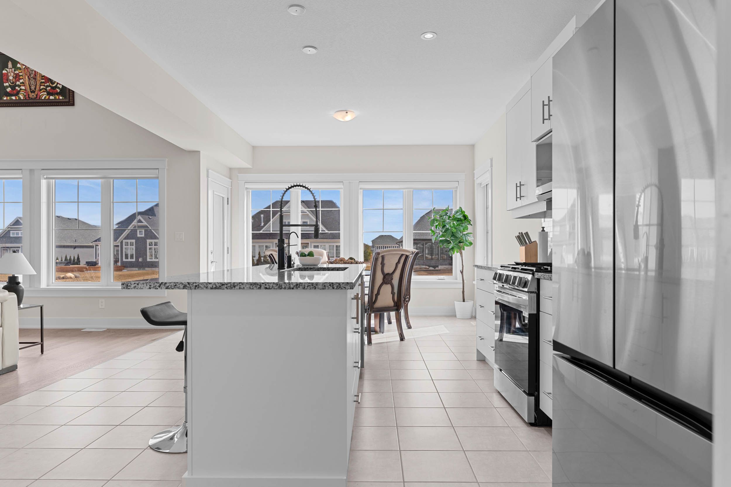 • Gourmet kitchen with stainless steel appliances and large island.