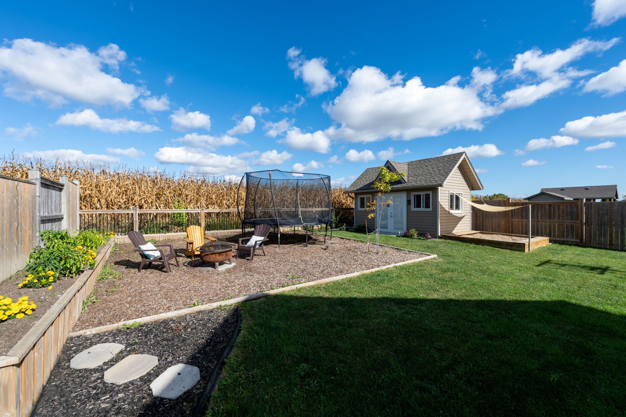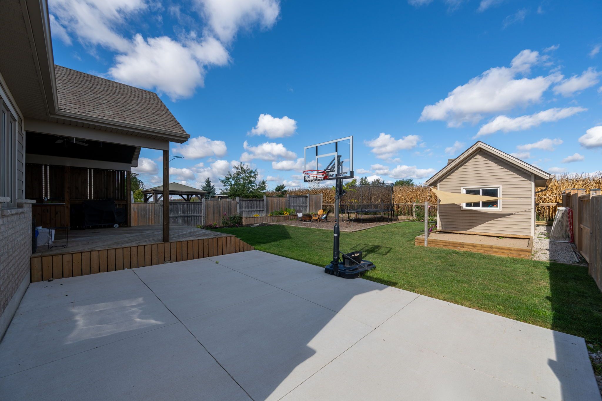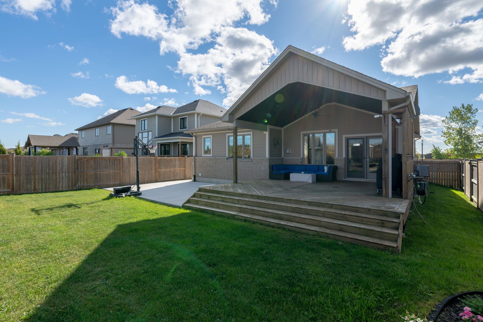 Welcome to your dream family home in the heart of thorndale! This beautifully maintained bungalow offers 3 spacious bedrooms on the main floor and 4th & 5th bedrooms in the fully finished basement. Step inside to high ceilings, granite countertops, stylish design, and a bright, open-concept living space perfect for family living and entertaining. The dream backyard is truly one-of-a-kind - featuring a covered deck, dedicated play area, and a large concrete patio ideal for hockey and basketball training. Backing onto peaceful, private corn fields, you'll enjoy tranquil views with no rear neighbors. The basement is a kid's paradise with a large rec room, home theater, additional bathroom, bedroom, and tons of storage. The home is also thoughtfully equipped with a hookup for a backup generator and a separate electrical panel for added peace of mind. Whether you're hosting movie night or enjoying the outdoors, this home has it all. Don't miss your chance to own this incredible family-friendly property in a quiet, sought-after community.