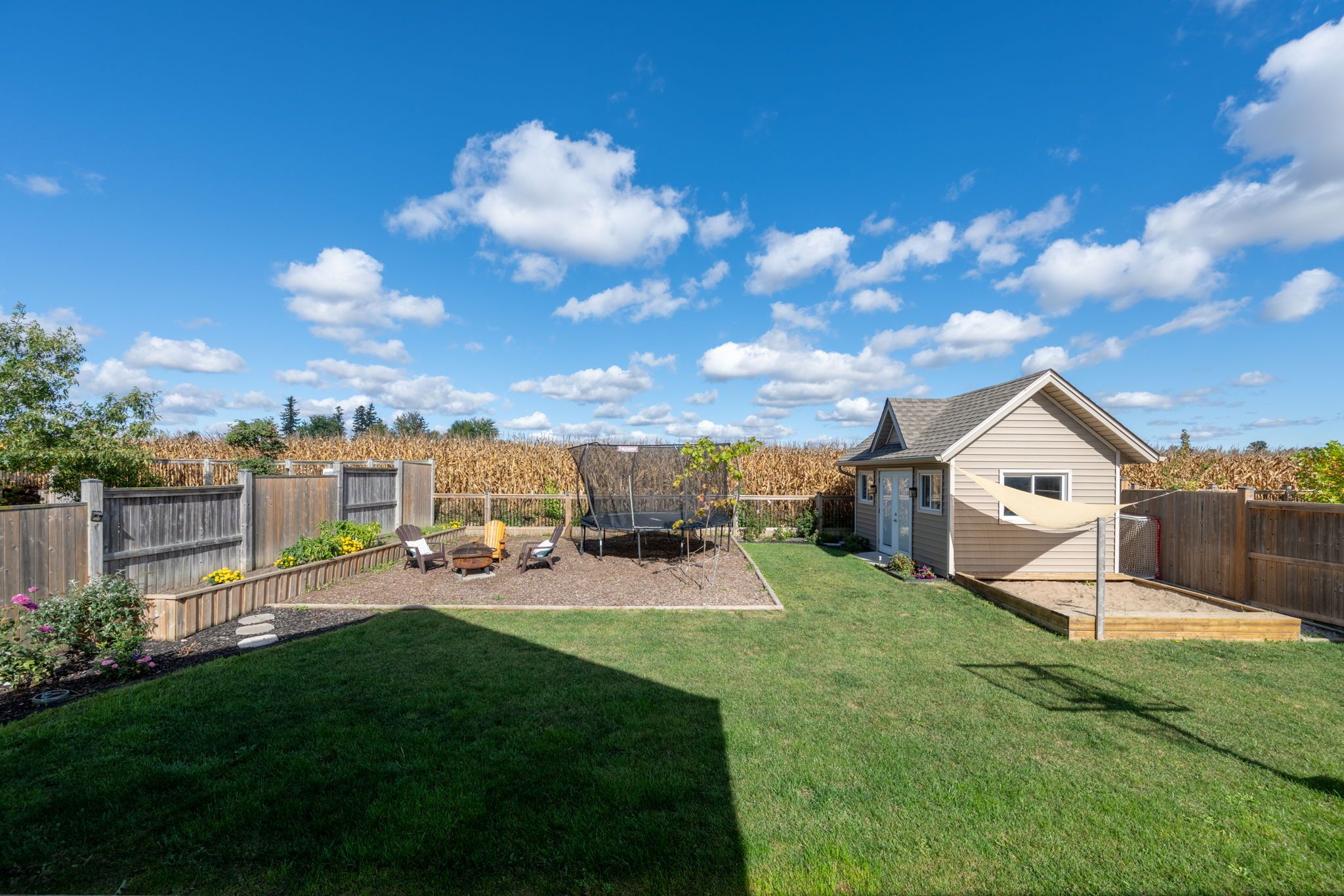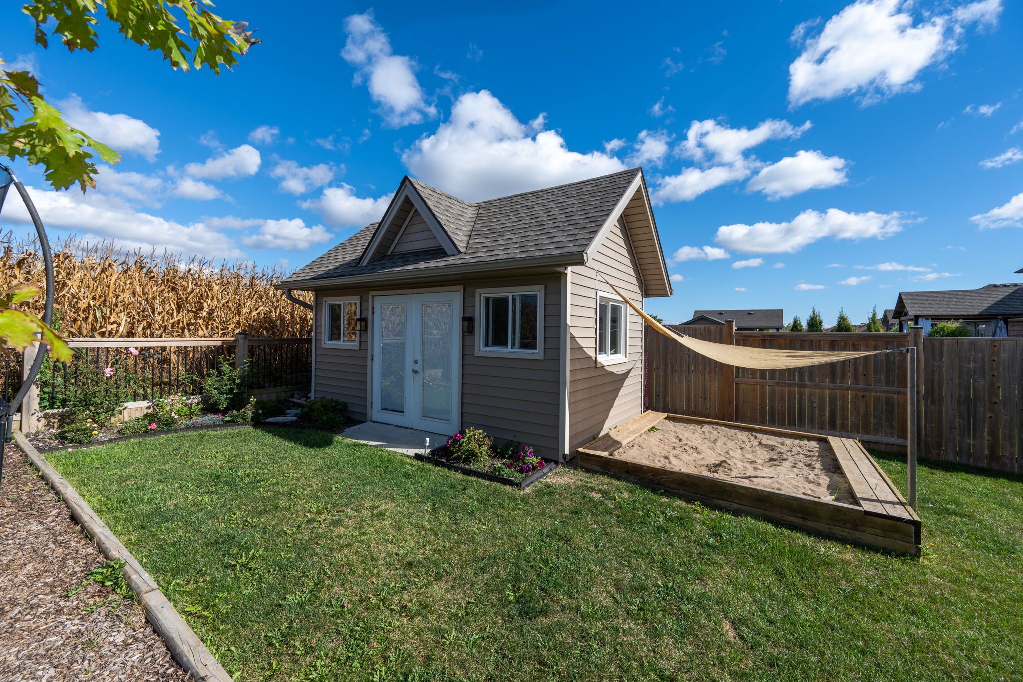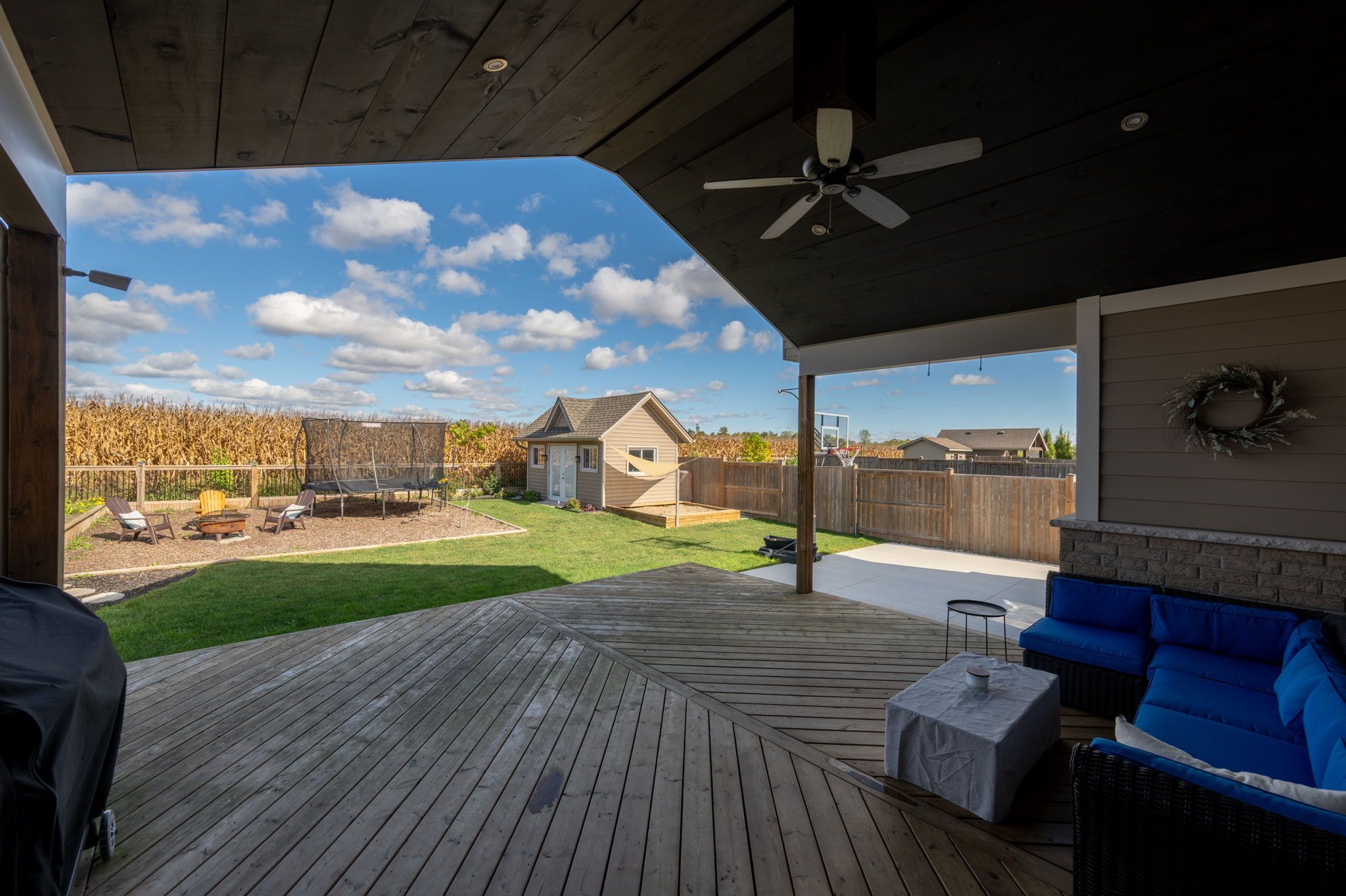 Welcome to your dream family home in the heart of thorndale! This beautifully maintained bungalow offers 3 spacious bedrooms on the main floor and 4th & 5th bedrooms in the fully finished basement. Step inside to high ceilings, granite countertops, stylish design, and a bright, open-concept living space perfect for family living and entertaining. The dream backyard is truly one-of-a-kind - featuring a covered deck, dedicated play area, and a large concrete patio ideal for hockey and basketball training. Backing onto peaceful, private corn fields, you'll enjoy tranquil views with no rear neighbors. The basement is a kid's paradise with a large rec room, home theater, additional bathroom, bedroom, and tons of storage. The home is also thoughtfully equipped with a hookup for a backup generator and a separate electrical panel for added peace of mind. Whether you're hosting movie night or enjoying the outdoors, this home has it all. Don't miss your chance to own this incredible family-friendly property in a quiet, sought-after community.