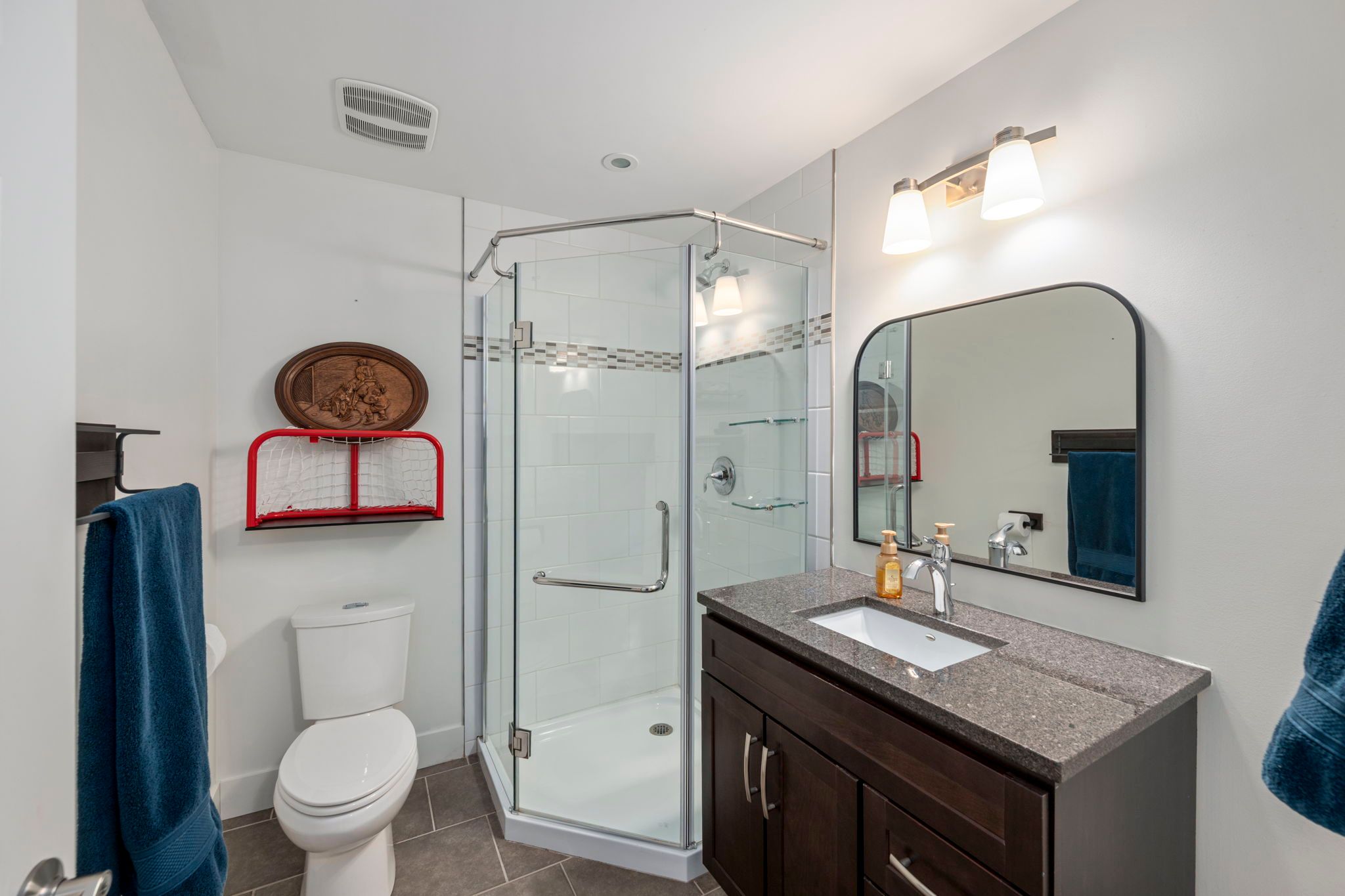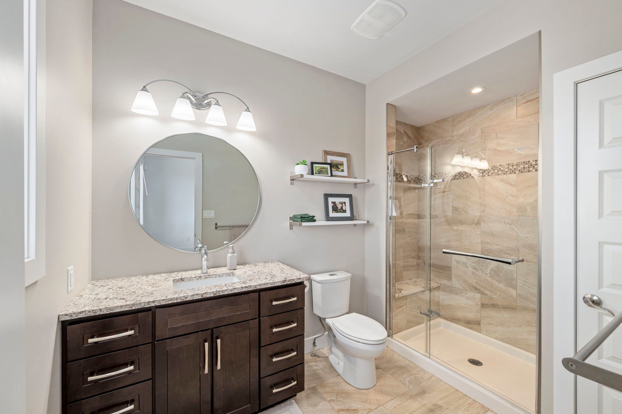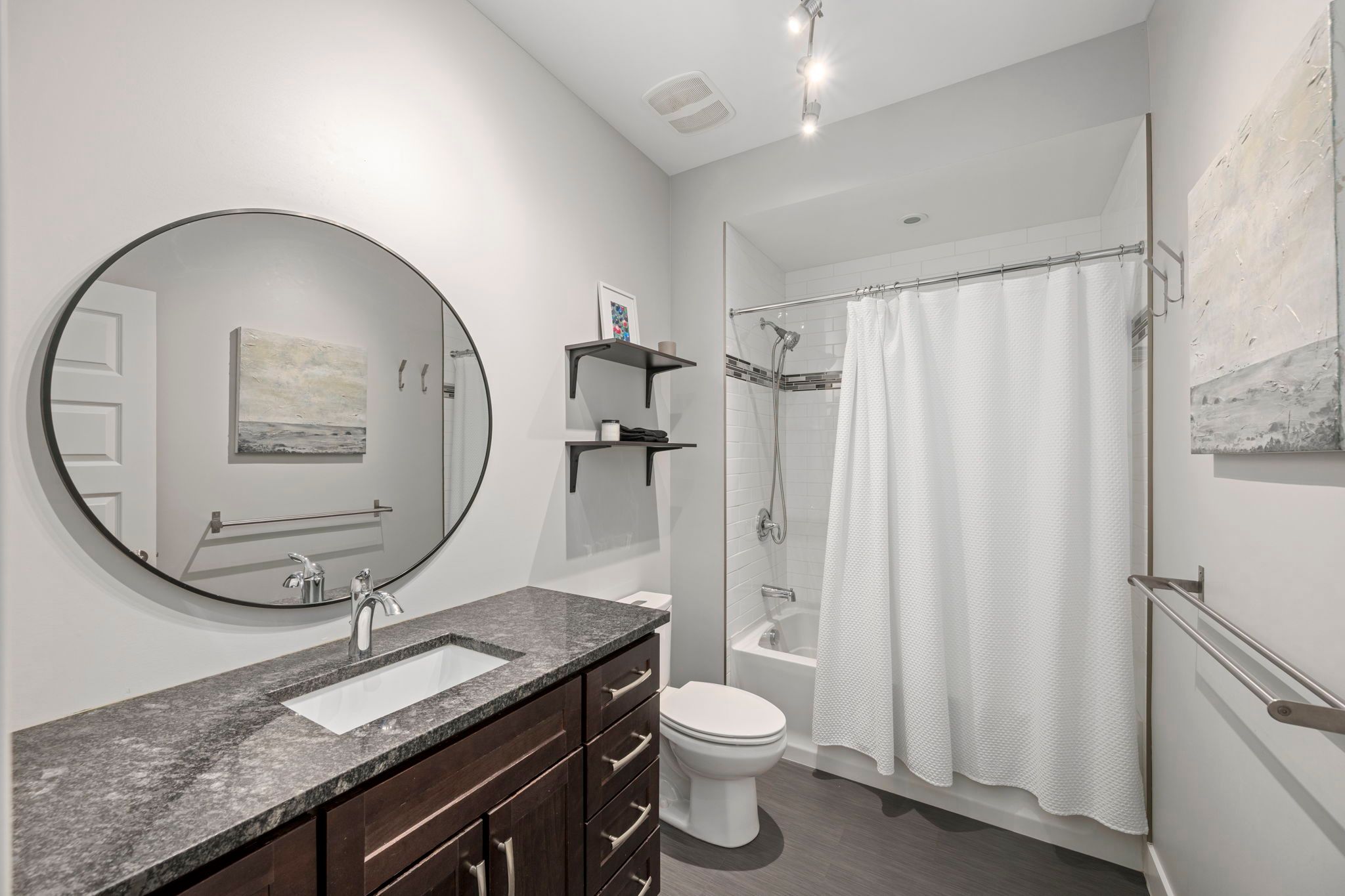 • Open-concept design with high ceilings and granite countertops enhances the space.