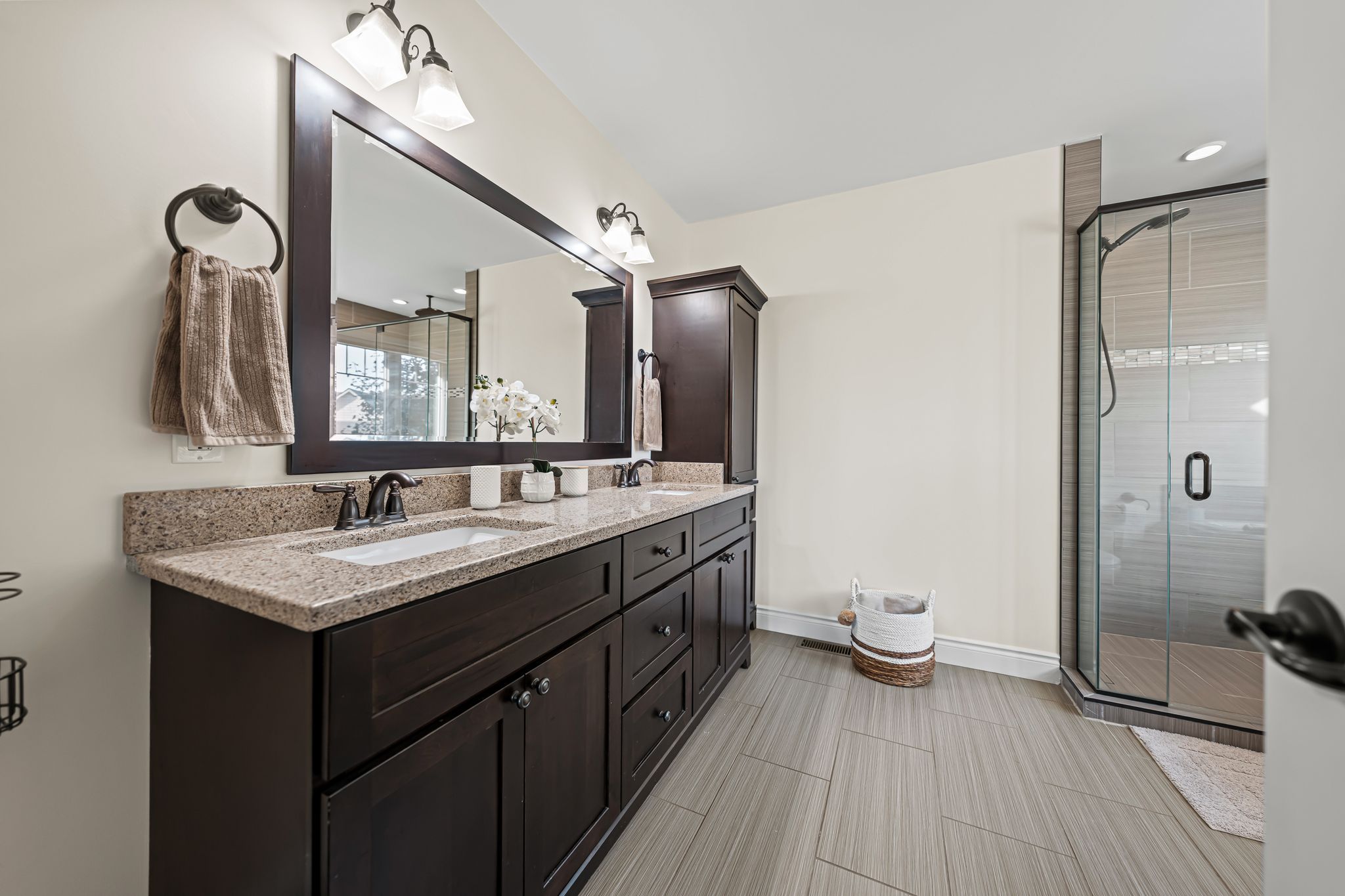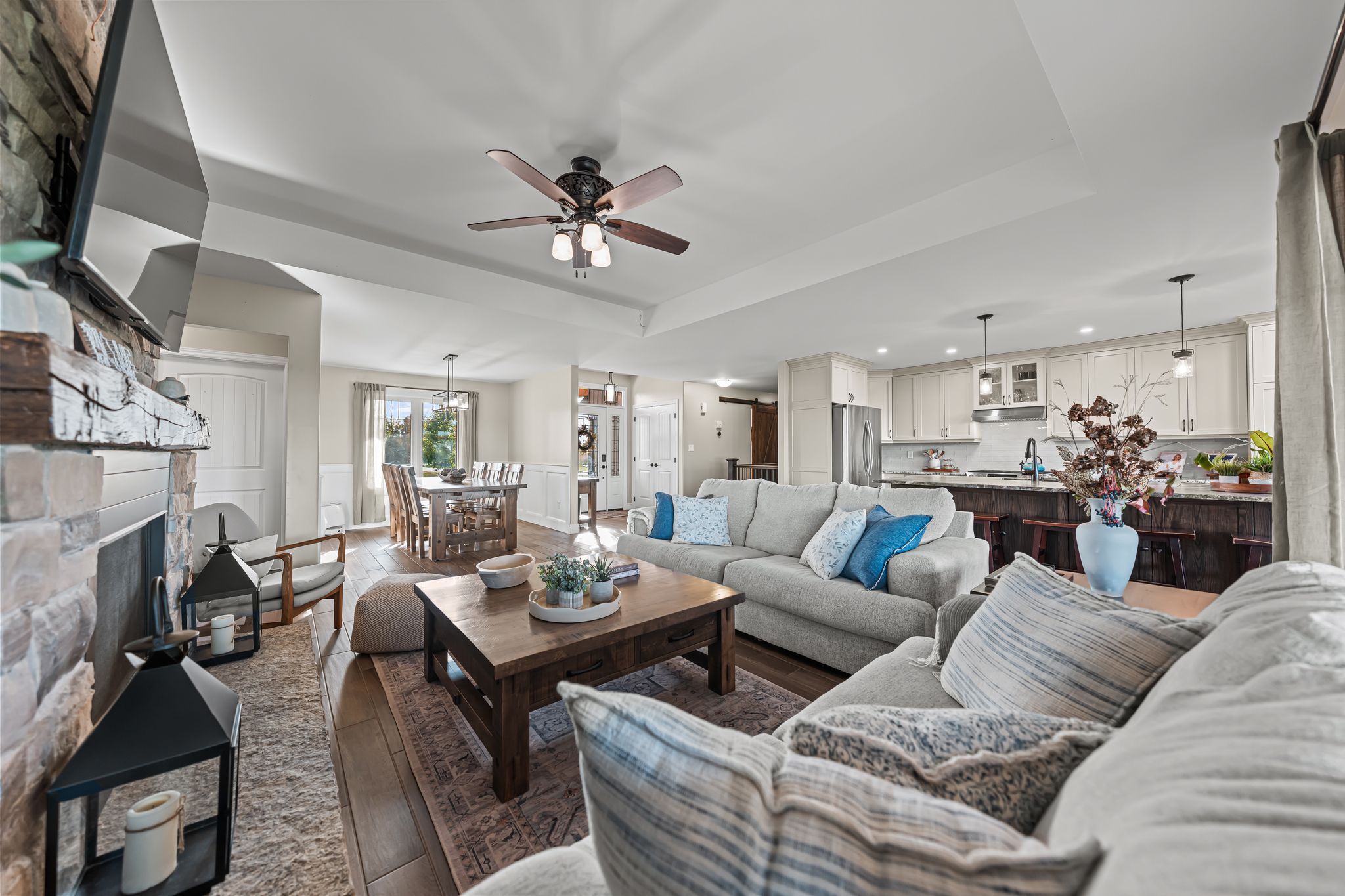 • Spacious great room with a floor-to-ceiling stone fireplace for cozy gatherings.