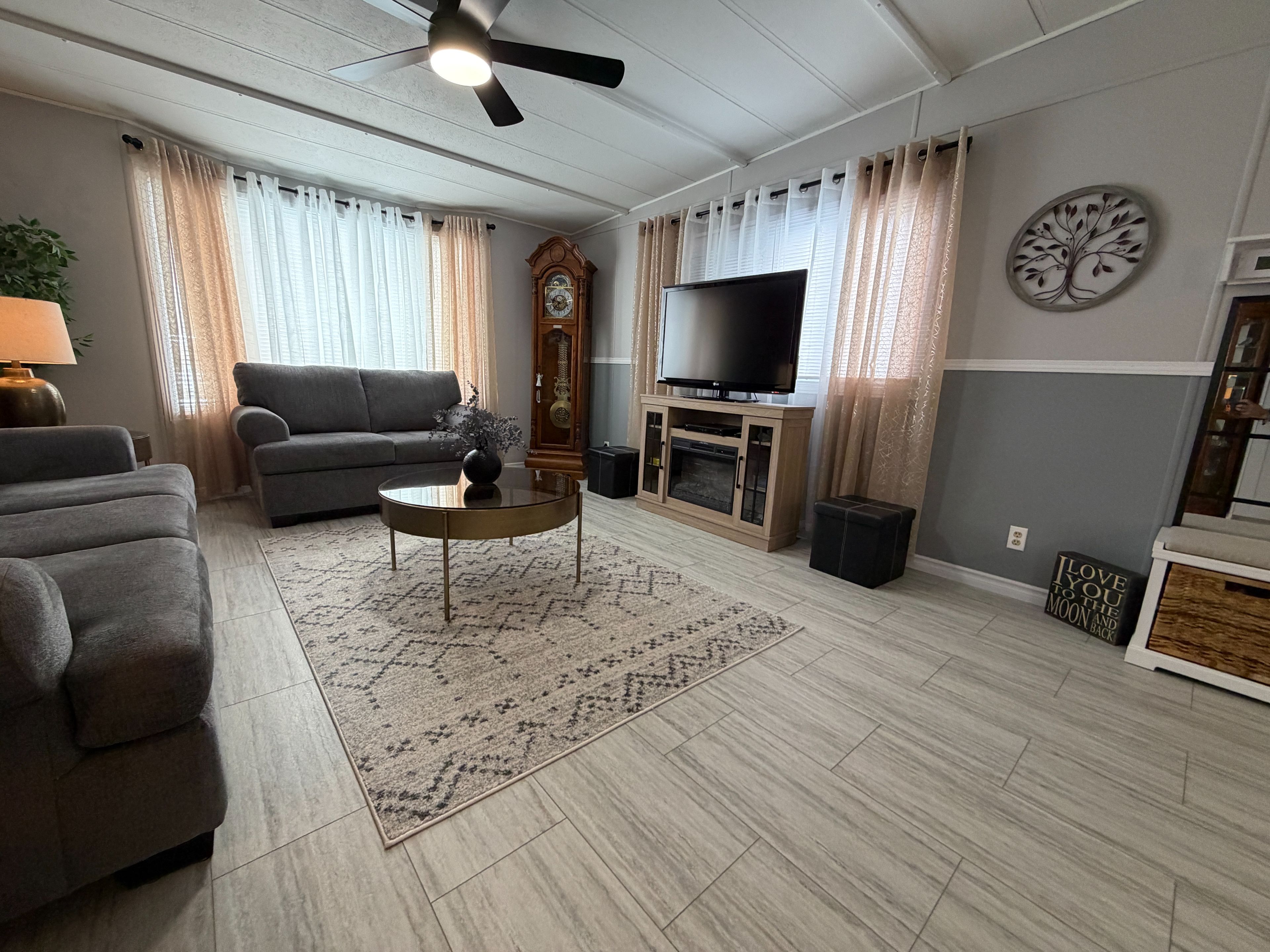 • Open-concept living space with modern finishes and a stylish feature wall.
