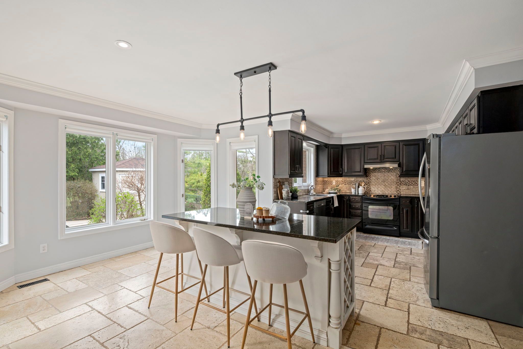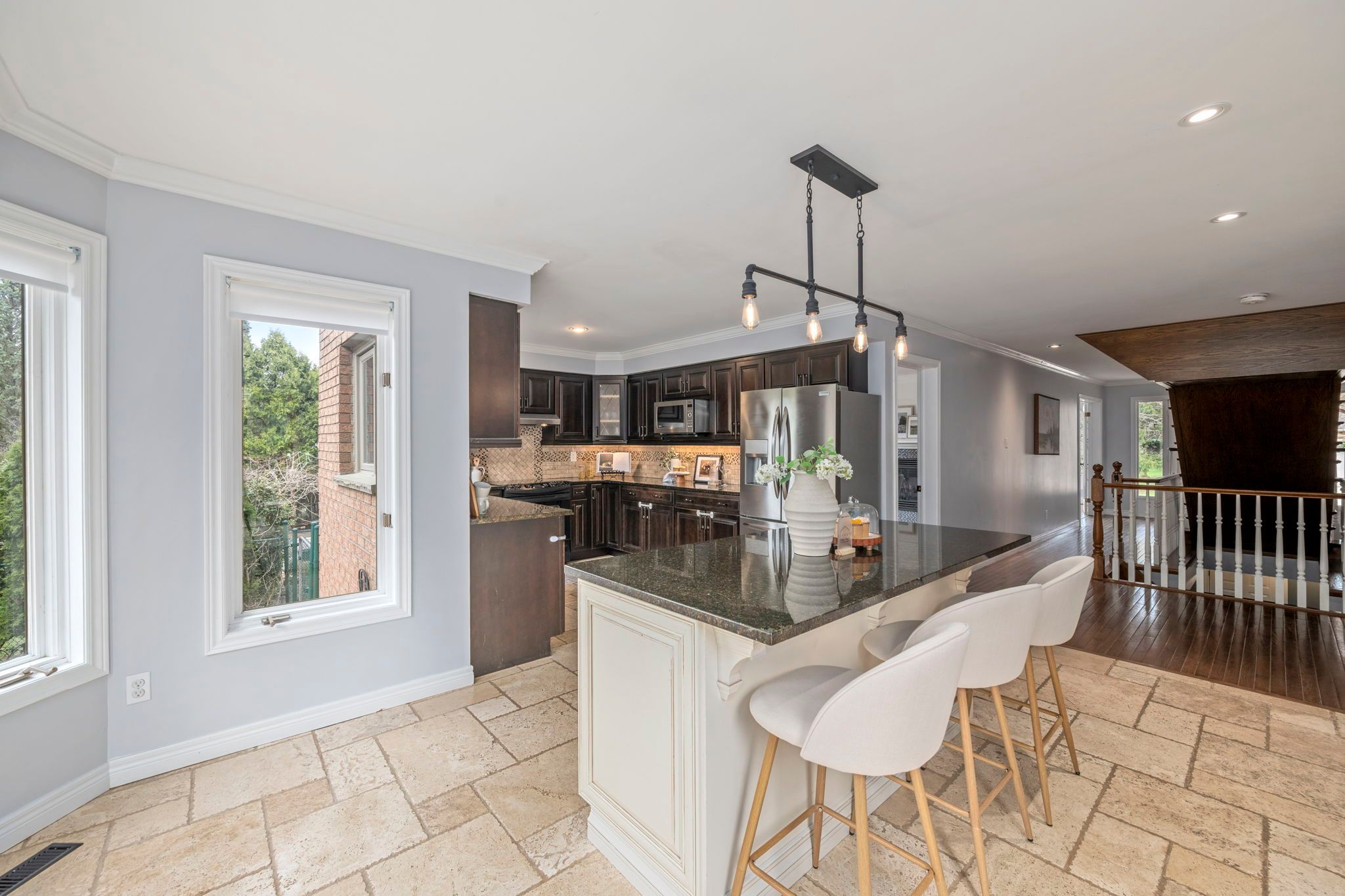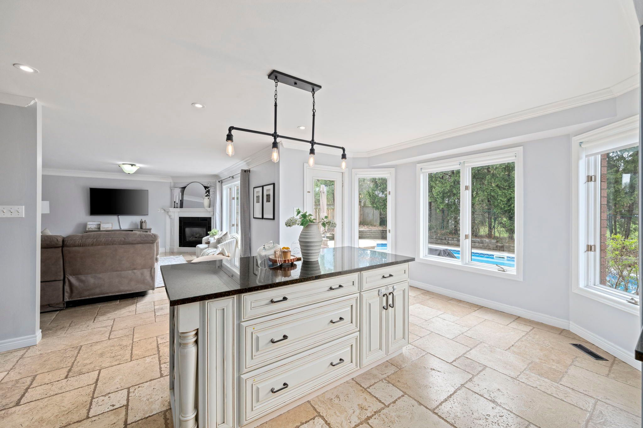 • Eat-in kitchen with backyard views, in-ground pool, and open layout.